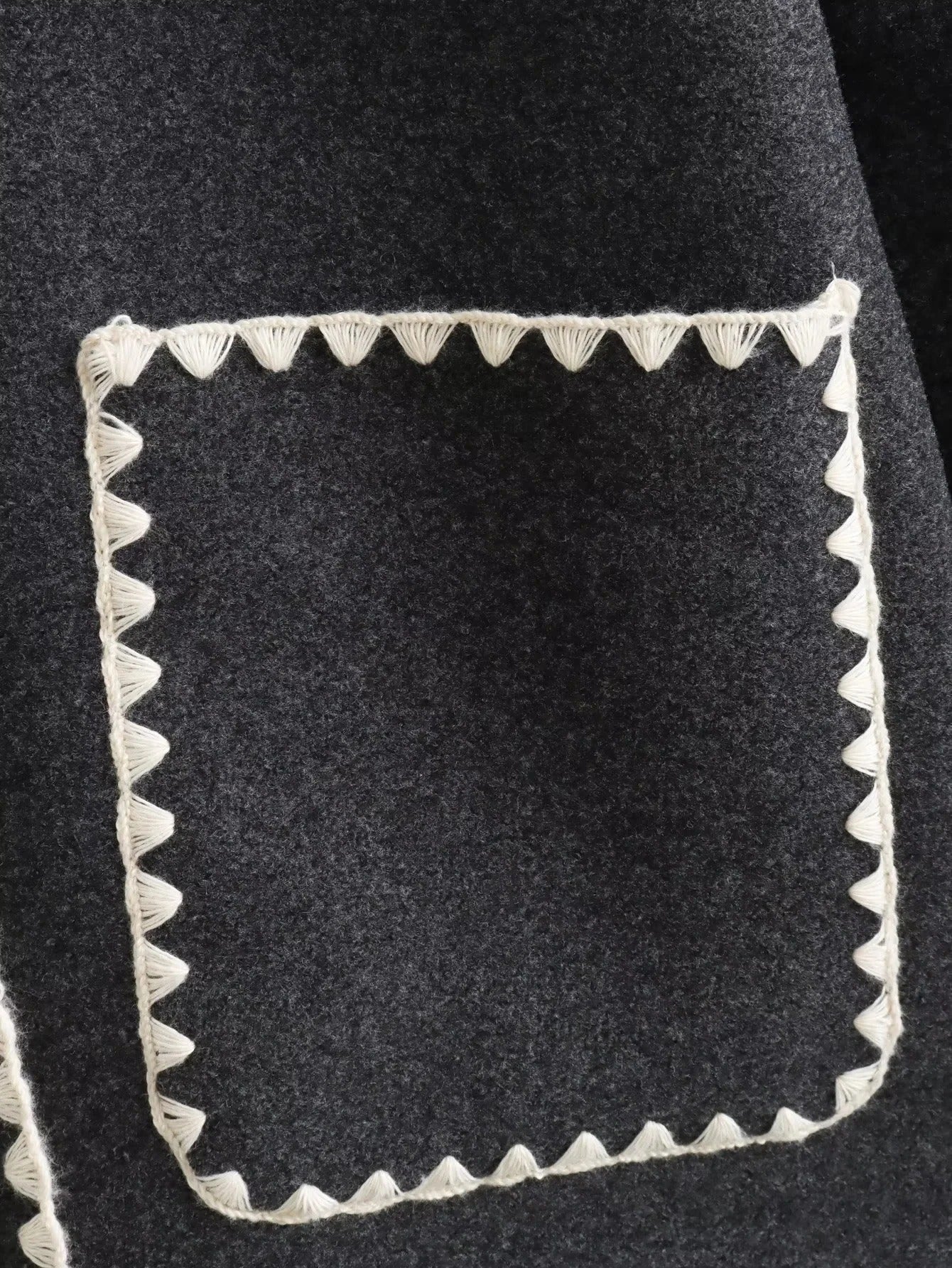 Abrigo amplio de corte recto, con detalle de bufanda incorporada con flecos en el borde inferior y ribetes en contraste en color claro. Bolsillo frontal de parche.