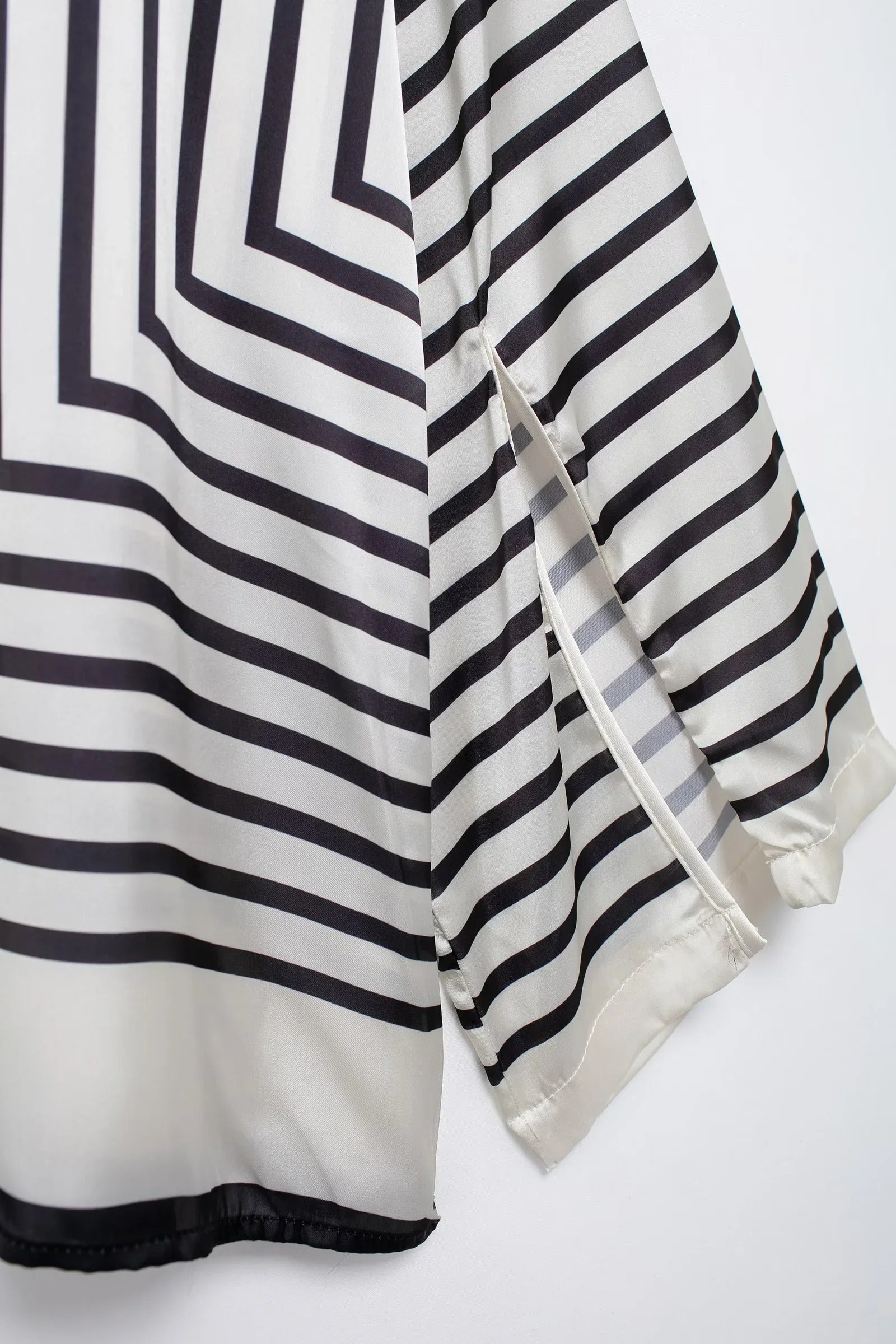 Diseño oversize satinado a rayas. Cuello en V con solapas. Manga larga. Cierre frontal con botones. Acabado suave al tacto.