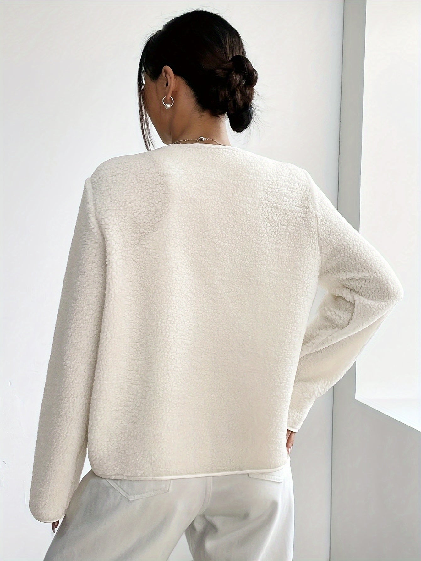 Diseño de largo medio. Cuello redondo. Manga larga. Cierre frontal con botones.