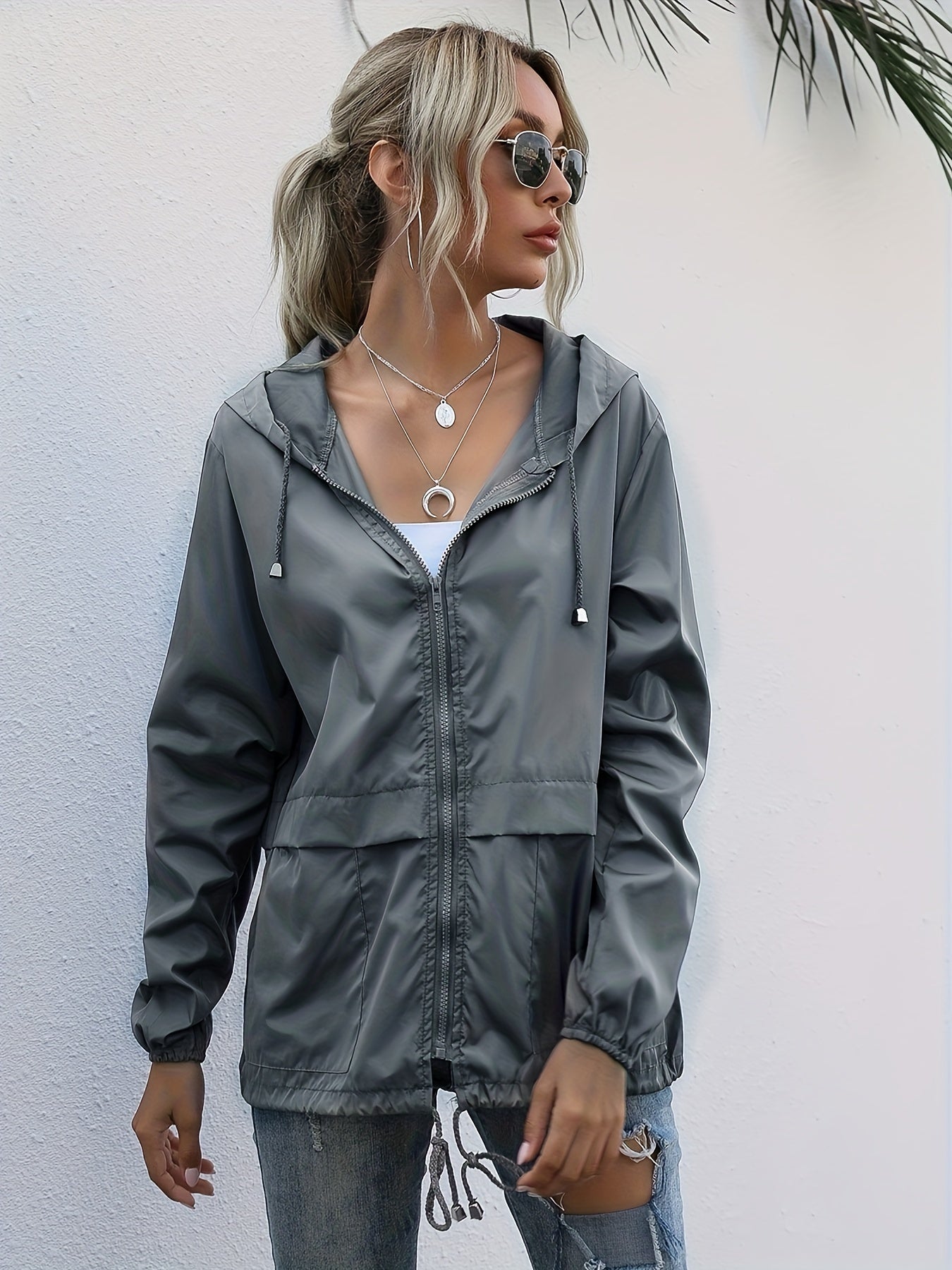 Chaqueta engomada con capucha y manga larga. Cierre frontal con cremallera.