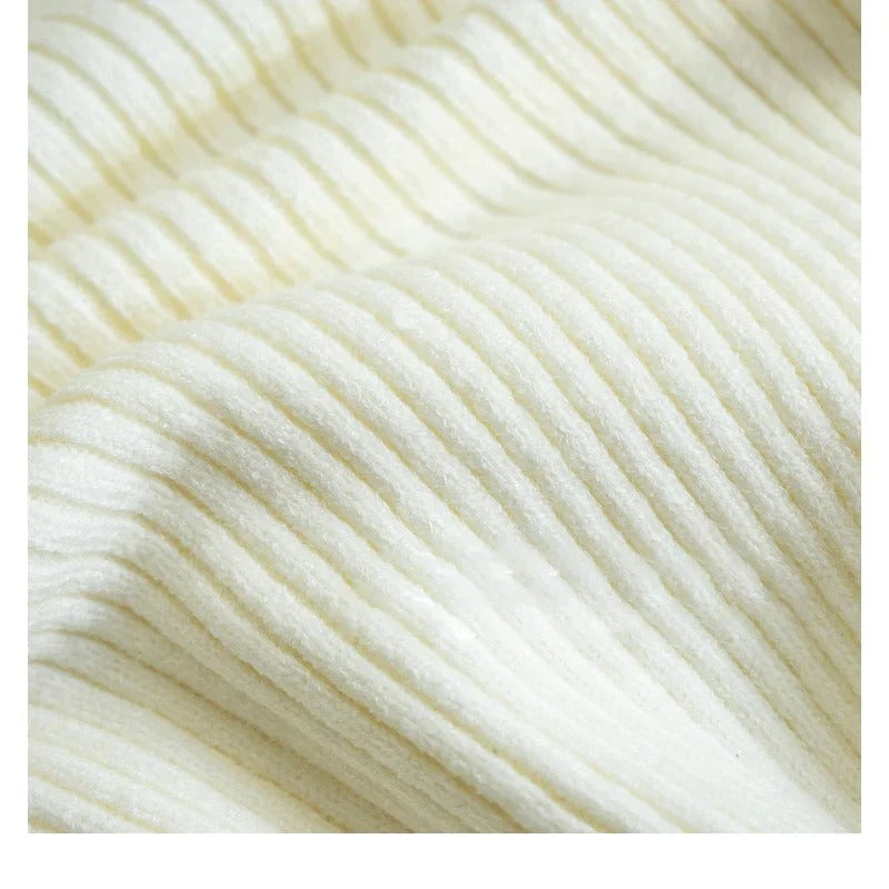 Diseño de largo medio y corte ajustado. Cuello alto. Manga larga con acabado acampanado y tejido suave en dos tonos blanco y negro. Apertura lateral en V invertida. Acabado acanalado.