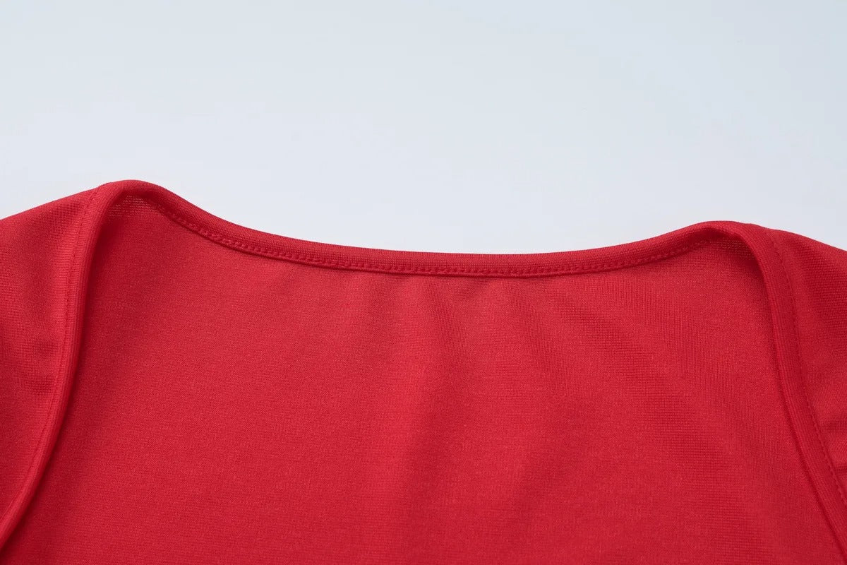 Vestido con escote cuadrado. Manga larga, Detalle de lazo en el pecho. Falda acampanada con laterales drapeados. Alta elasticidad.