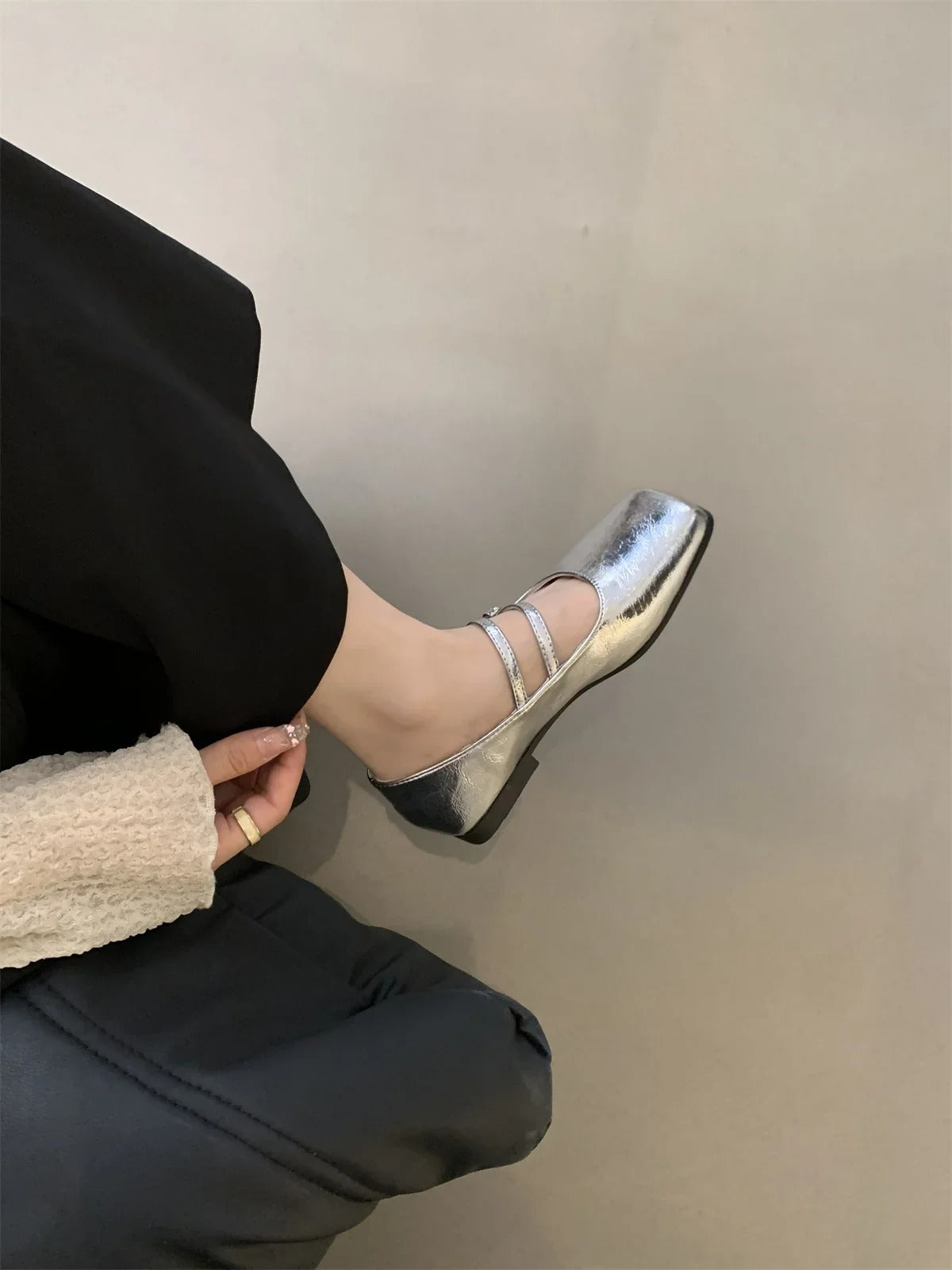 Diseño de tacón plano. Punta cuadrada. Tiras decorativas con detalles de hebillas. Acabado en piel sintética plateada.