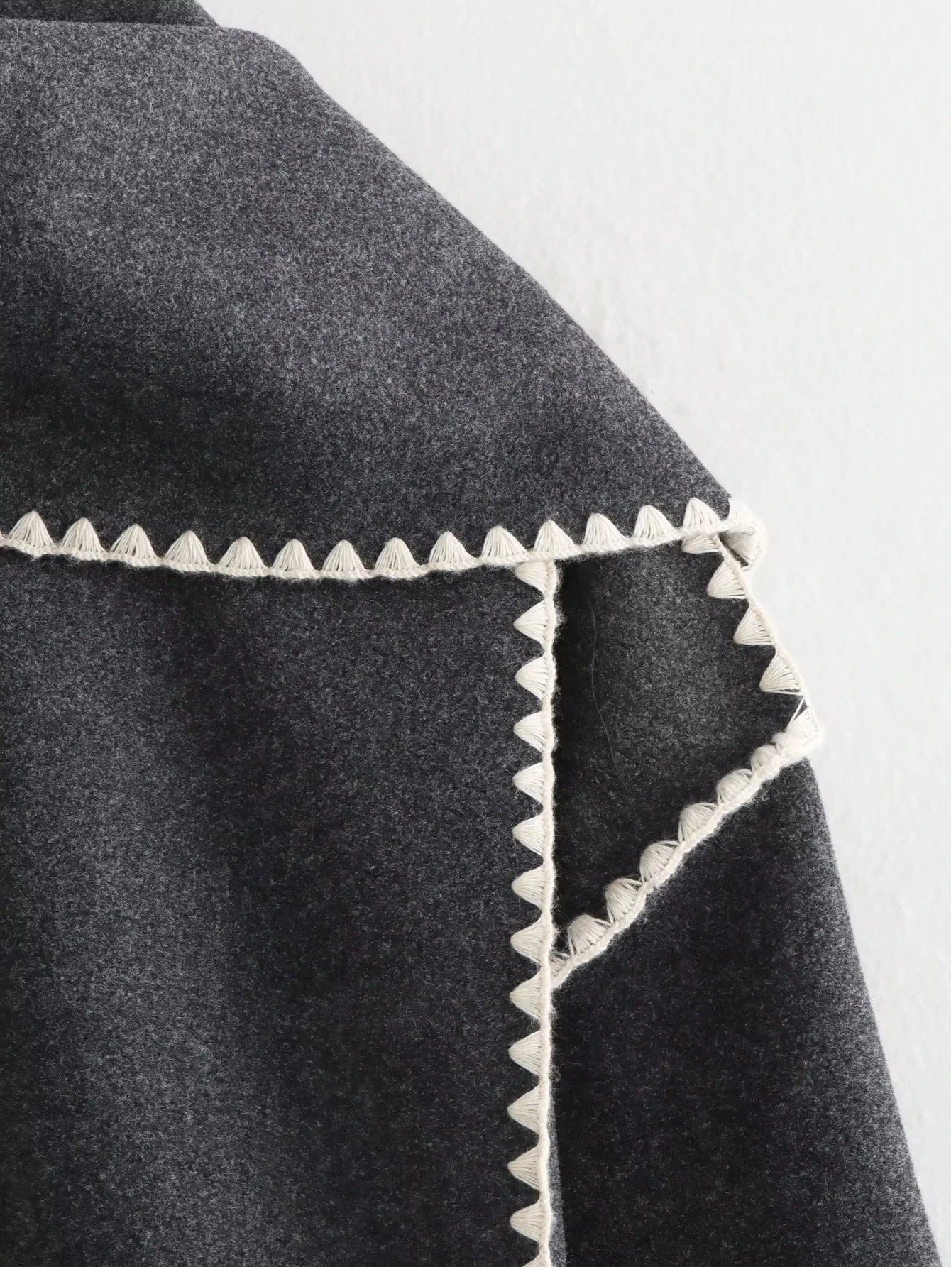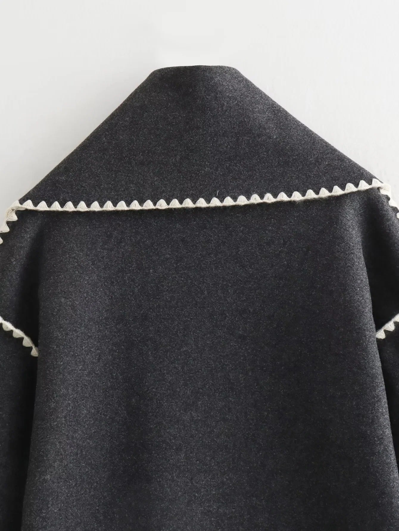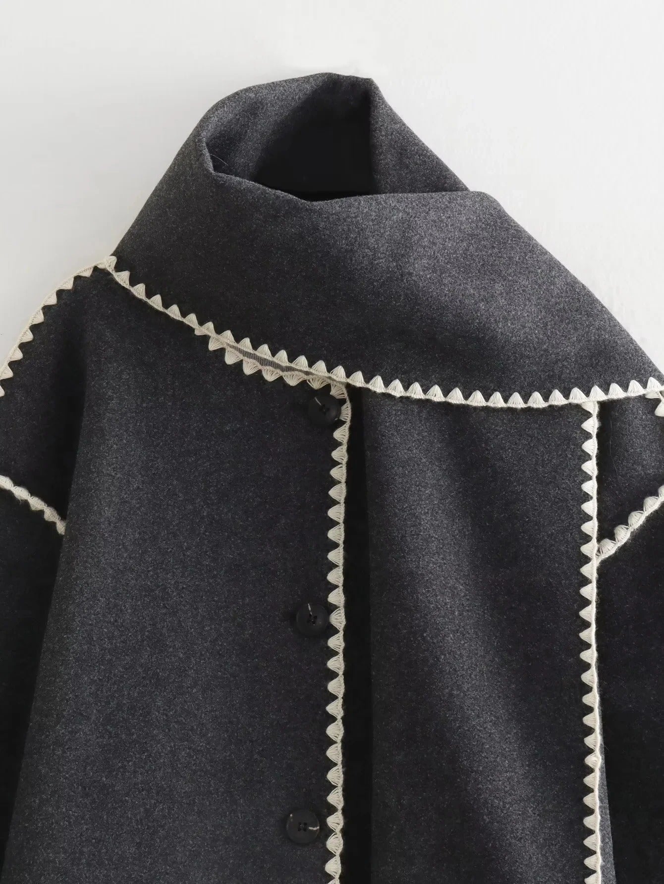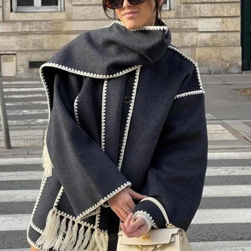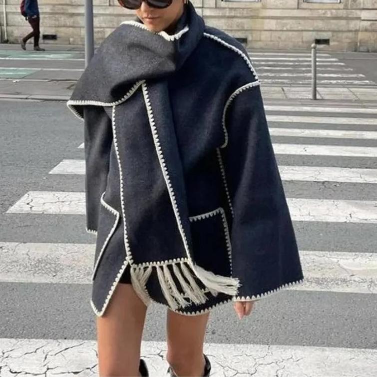 Abrigo amplio de corte recto, con detalle de bufanda incorporada con flecos en el borde inferior y ribetes en contraste en color claro. Bolsillo frontal de parche.