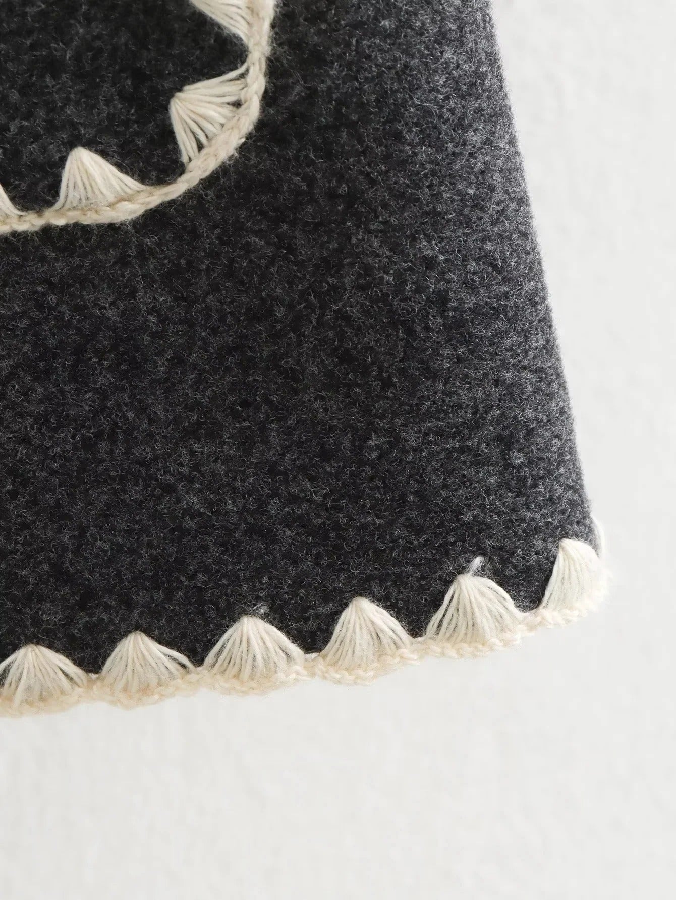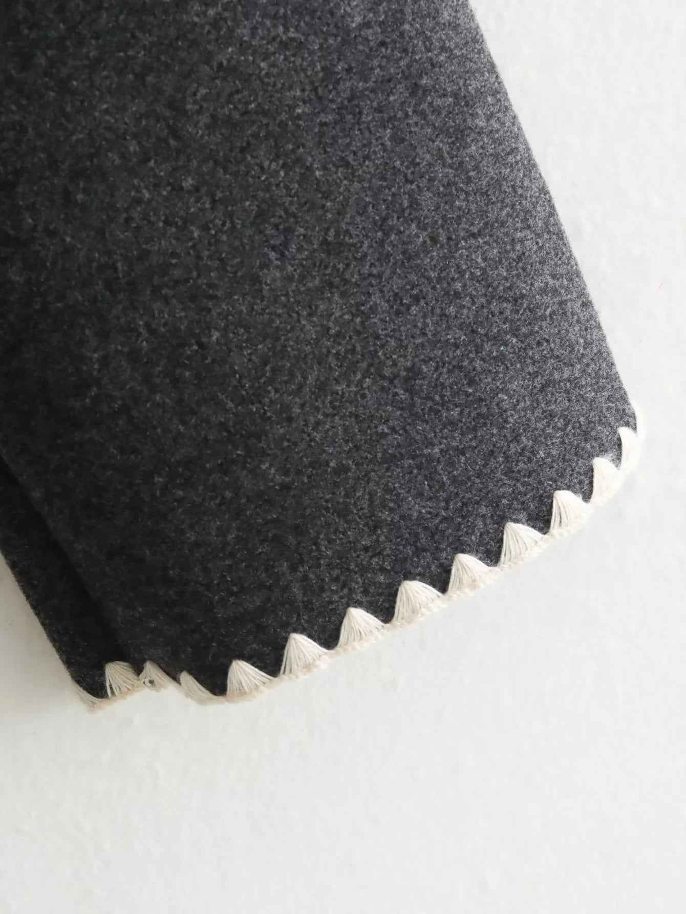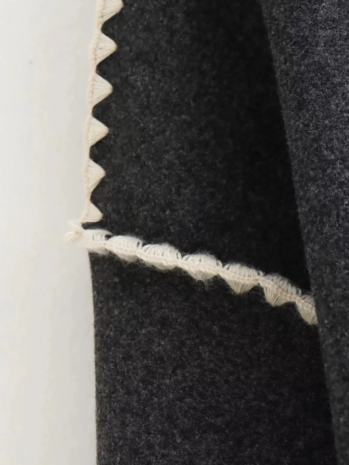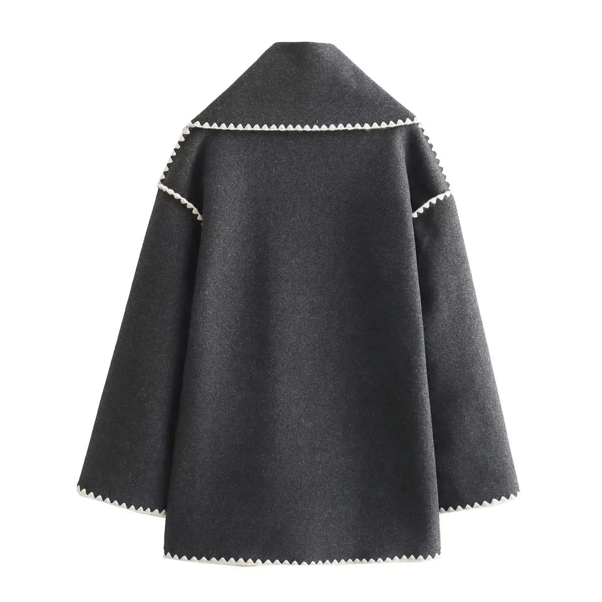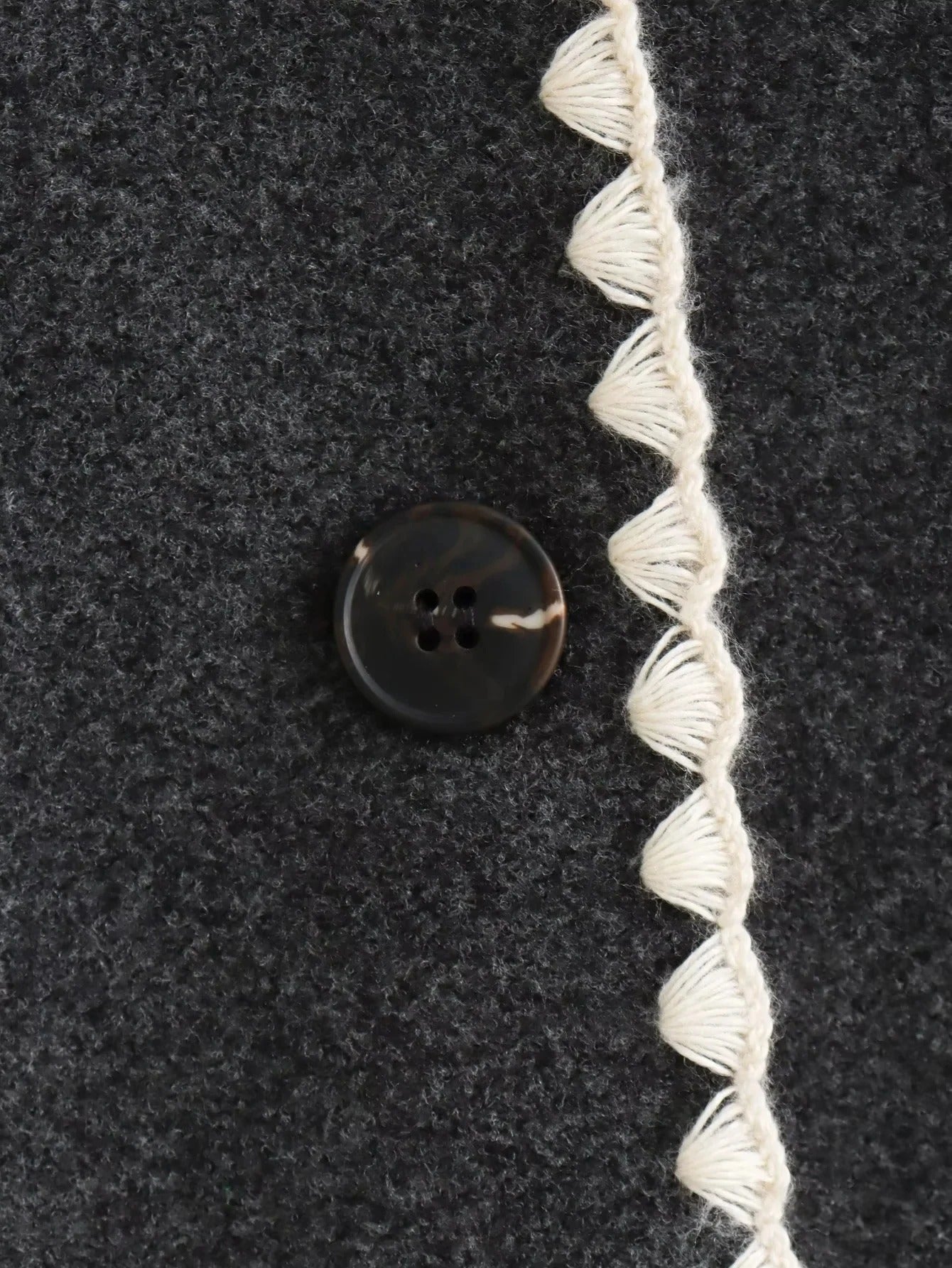 Abrigo amplio de corte recto, con detalle de bufanda incorporada con flecos en el borde inferior y ribetes en contraste en color claro. Bolsillo frontal de parche.