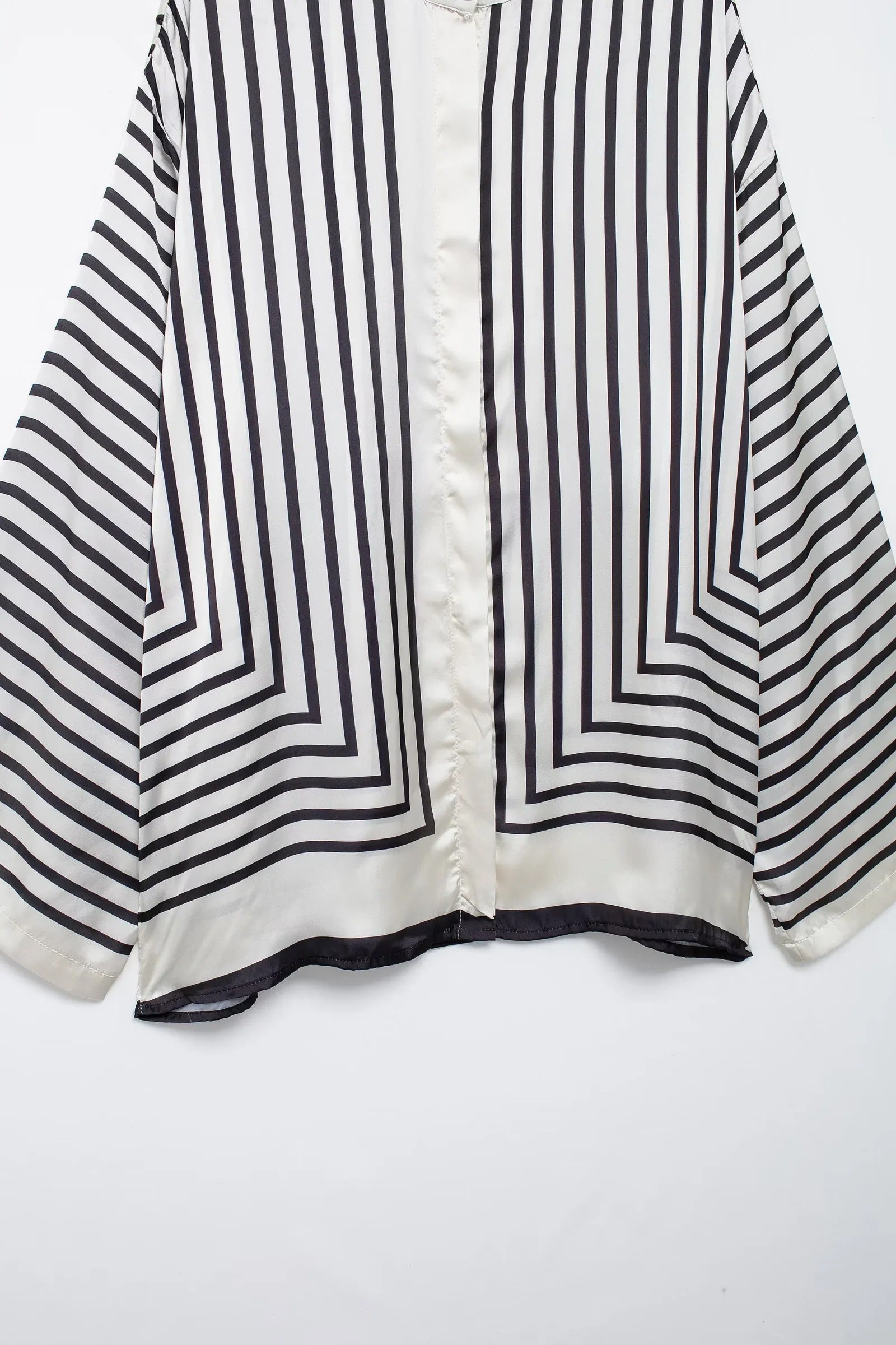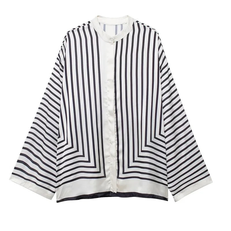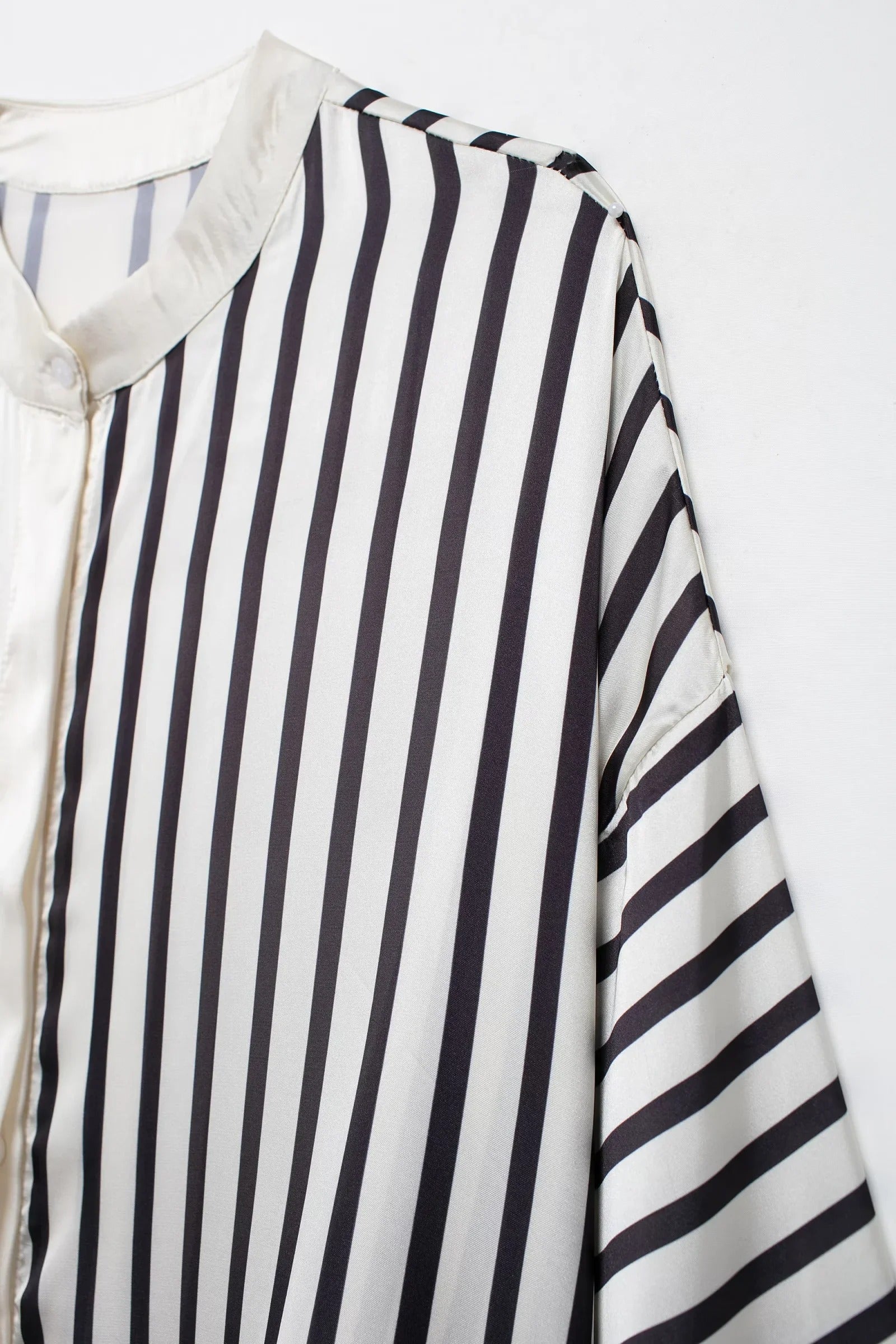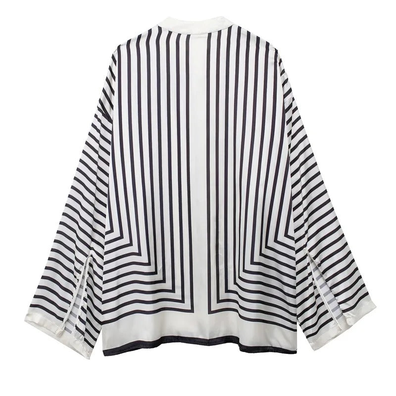 Diseño oversize satinado a rayas. Cuello en V con solapas. Manga larga. Cierre frontal con botones. Acabado suave al tacto.
