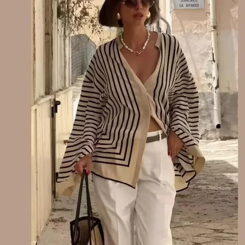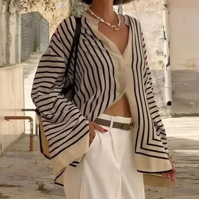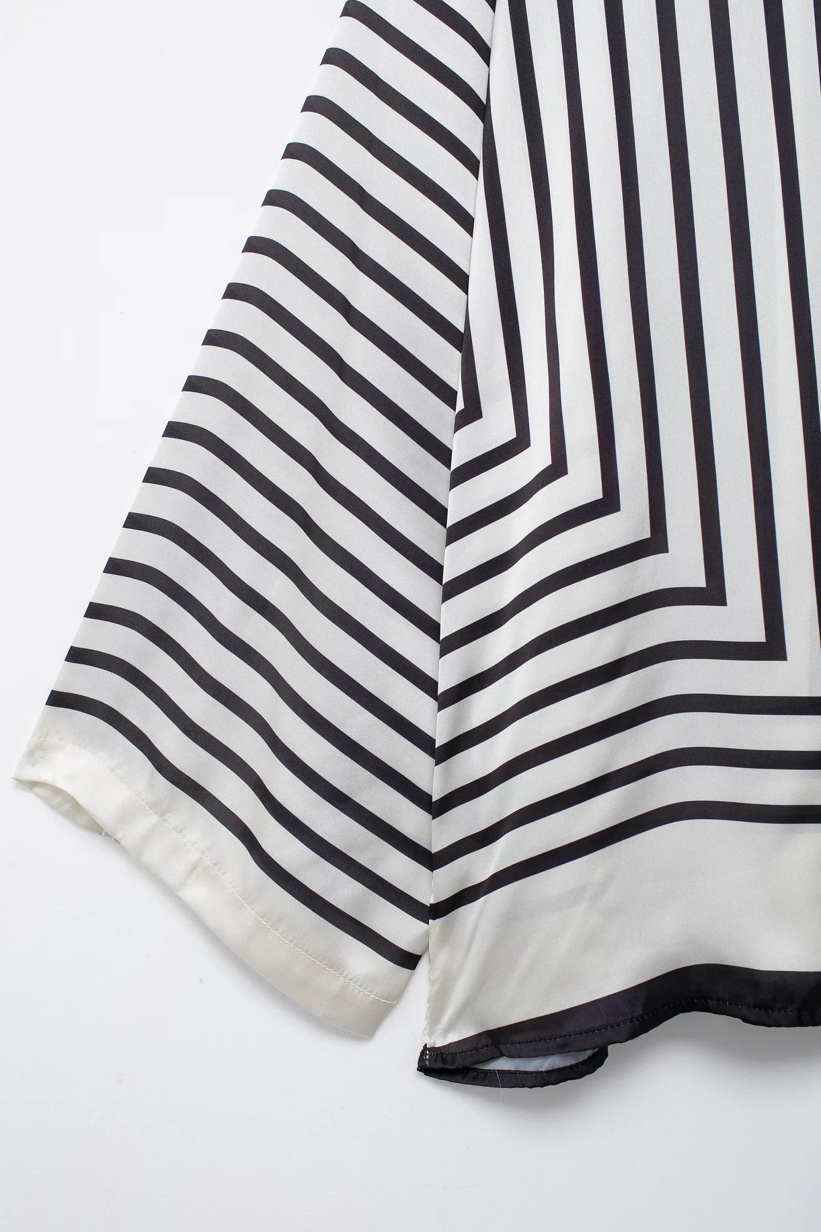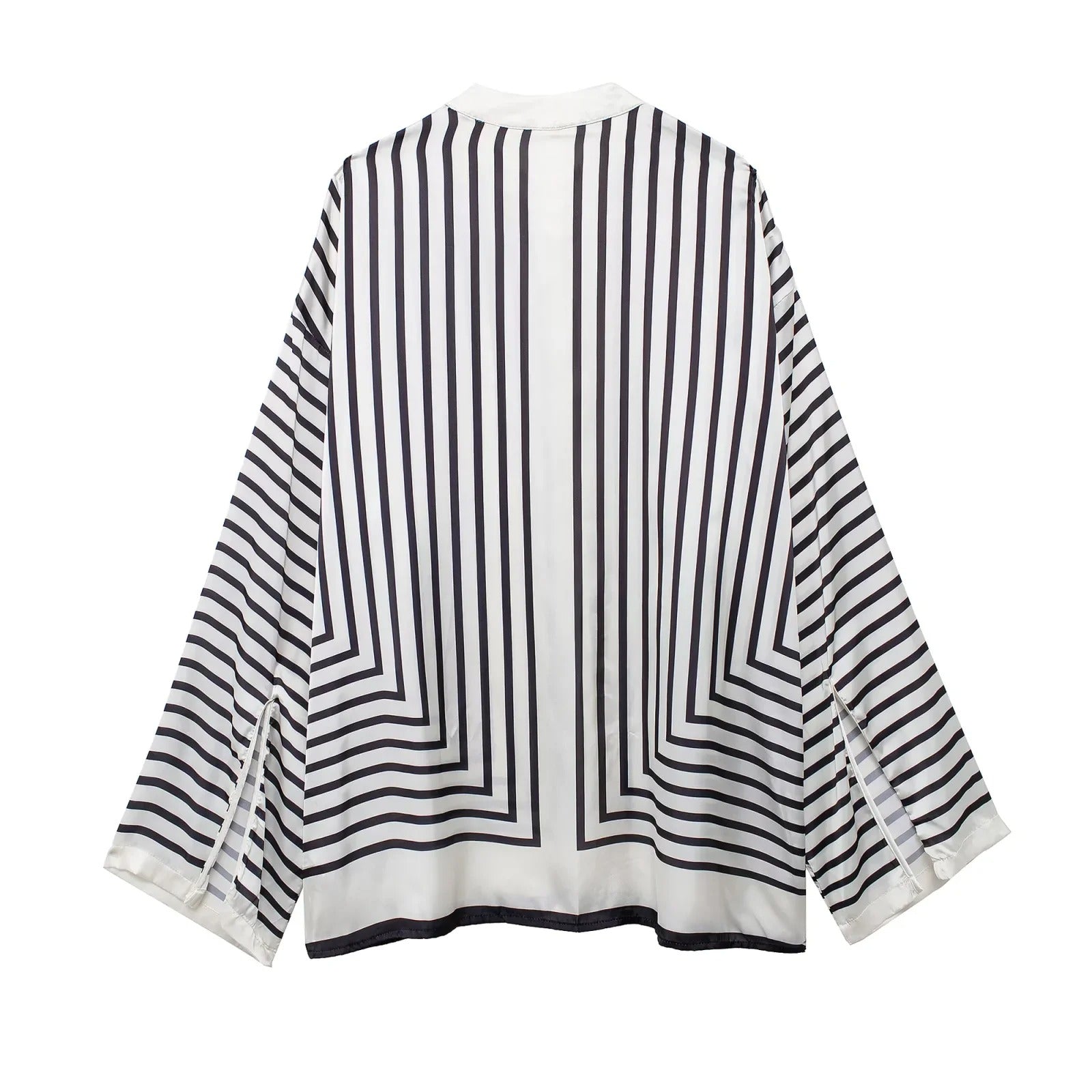 Diseño oversize satinado a rayas. Cuello en V con solapas. Manga larga. Cierre frontal con botones. Acabado suave al tacto.