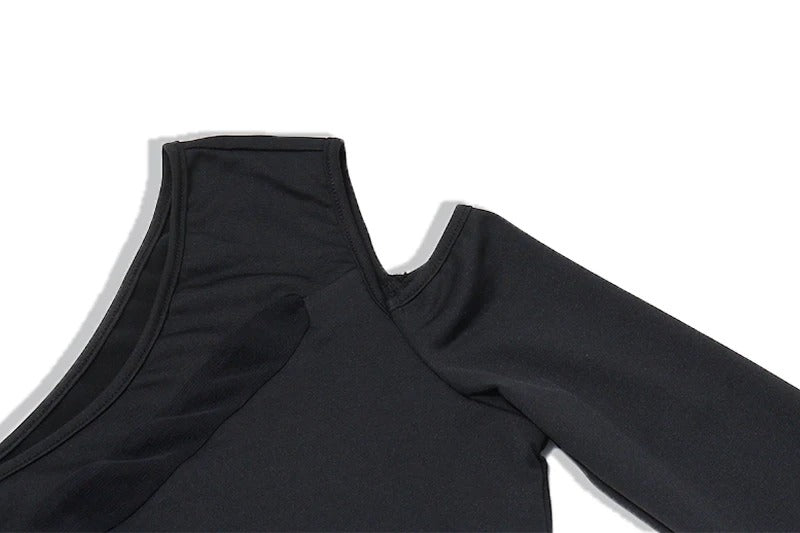 Body de una manga larga con transparencias asimétricas. Apertura en el hombro. Incluye manga larga adicional.
