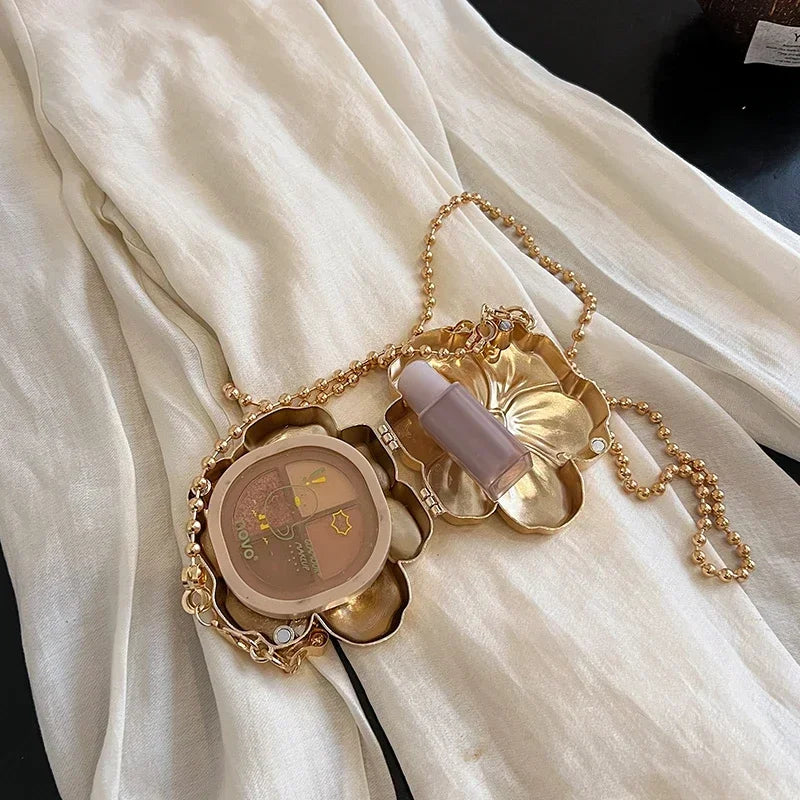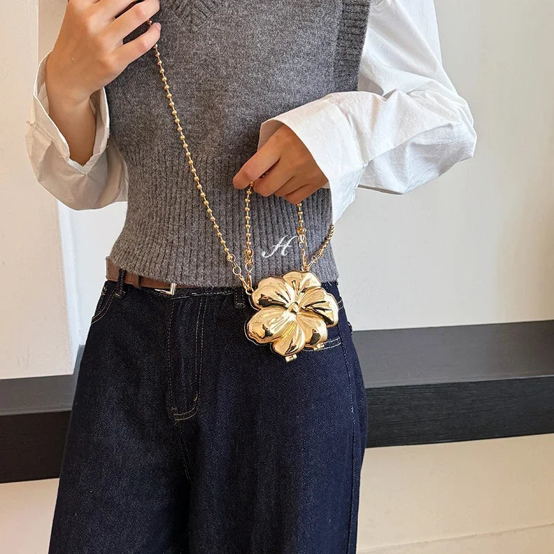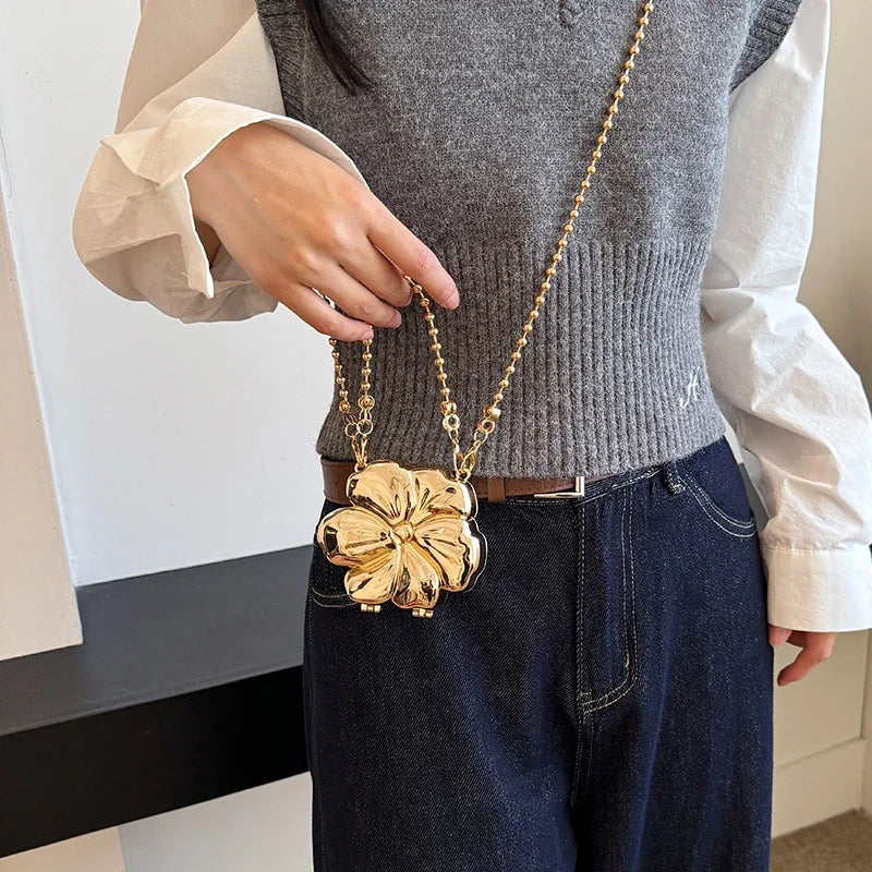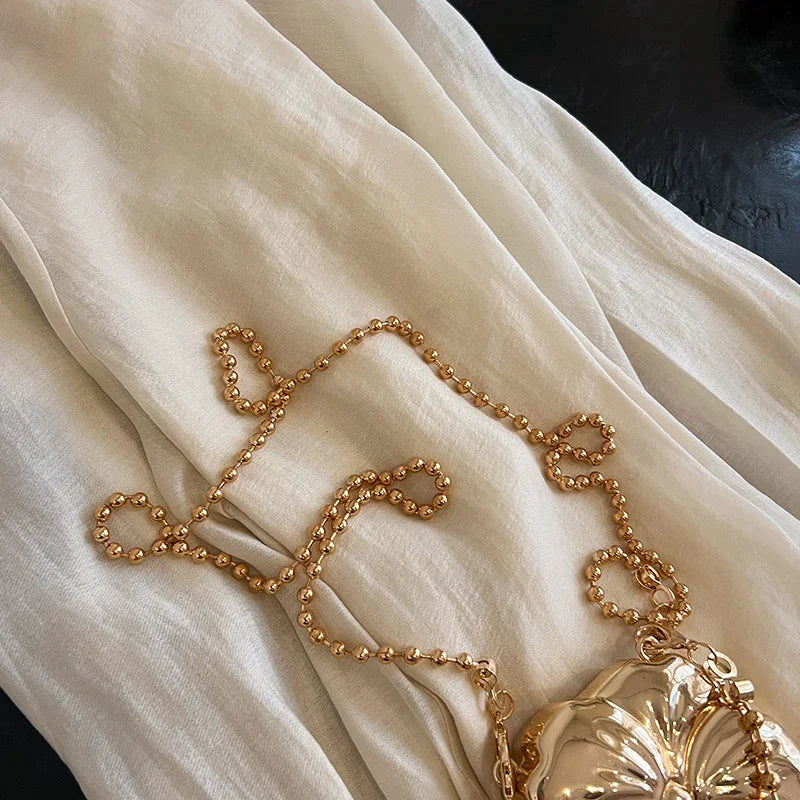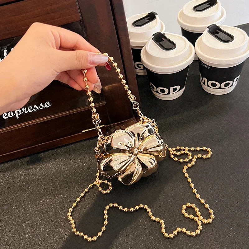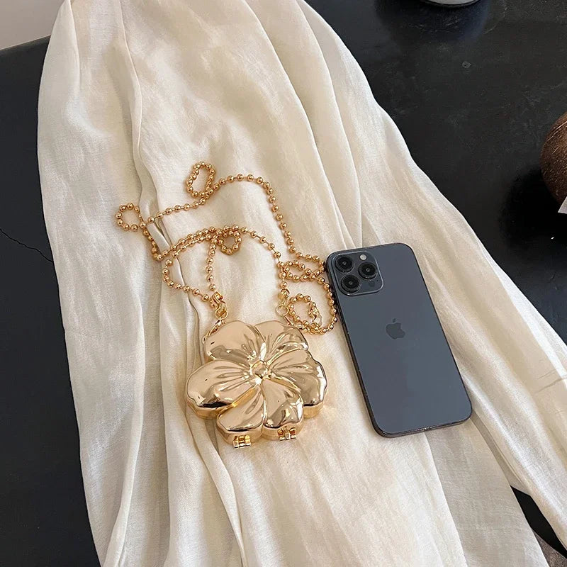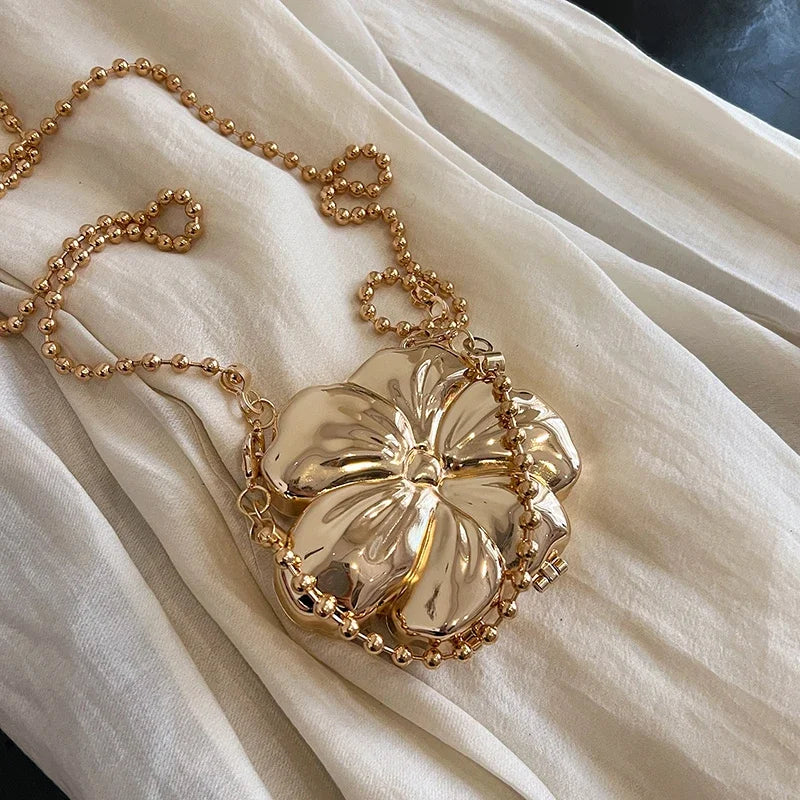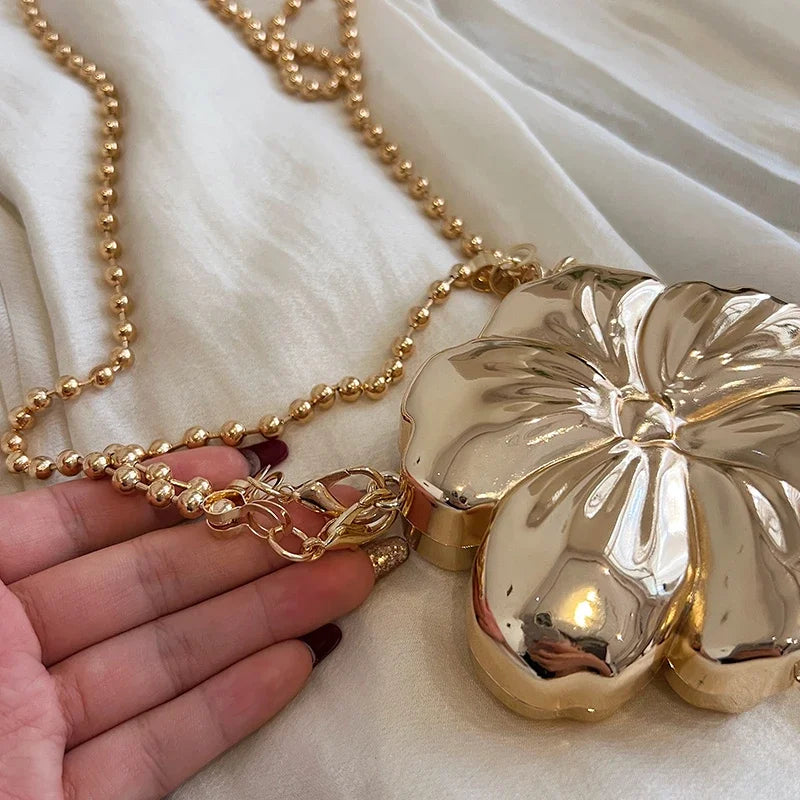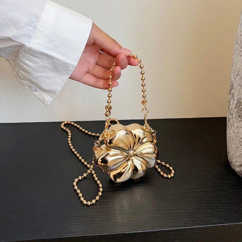 Bolso de fiesta pequeño con asa pequeña y correa extraíble tipo bandolera con detalles de perlas doradas. Forma de flor. Cierre de gancho y bucle.