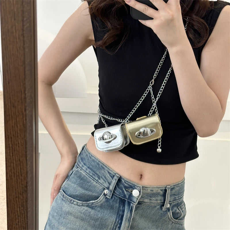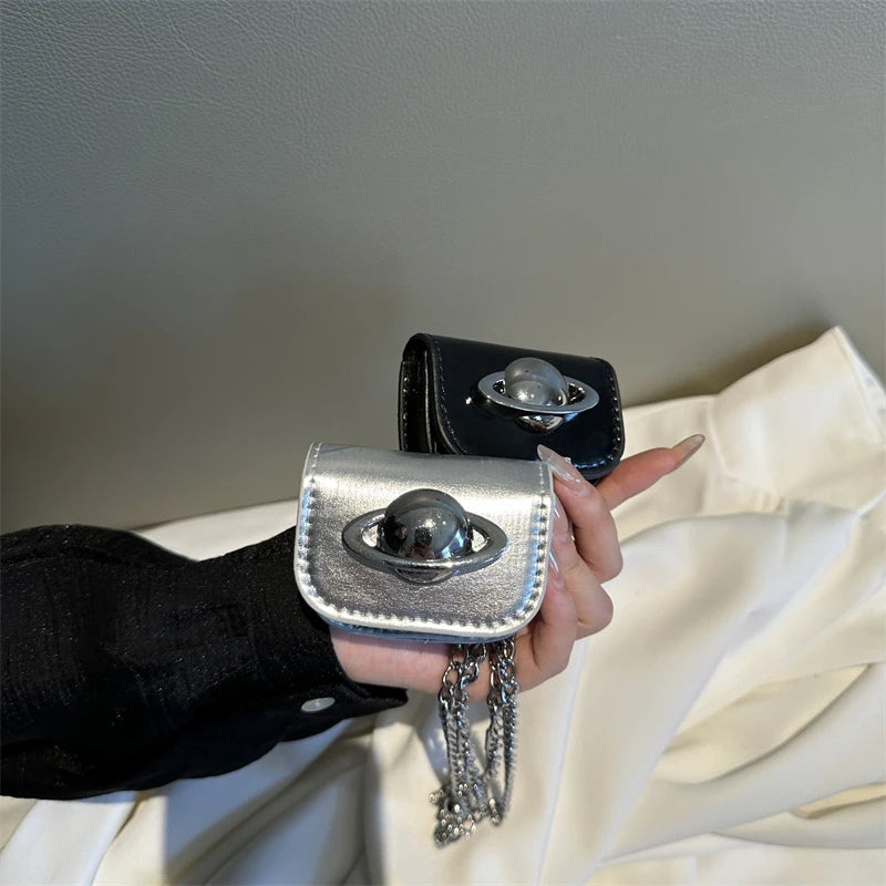 Bolso cuadrado pequeño con cadena extraíble multiposición tipo bandolera o bolso de hombro. Detalle decorativo de planeta en el frontal y asa. Cierre tipo cerrojo.