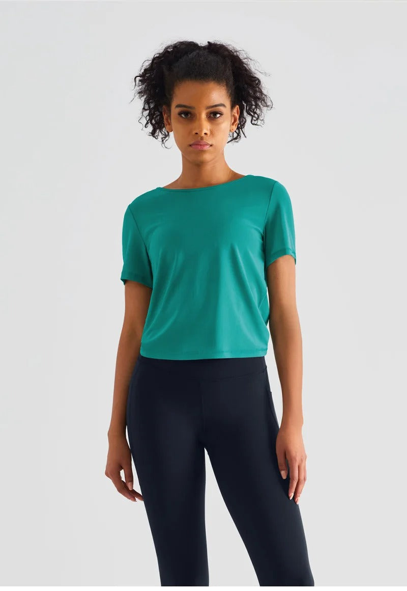 Manga corta. Cuello redondo. Espalda descubierta con nudo inferior cruzado y tira horizontal superior.