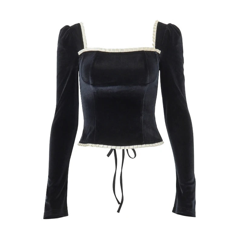 Diseño ajustado. Escote recto cuadrado. Manga larga. Detalle de color en contraste en las costuras. Tacto de terciopelo. Corsé en la parte trasera con lazo para mayor ajuste.