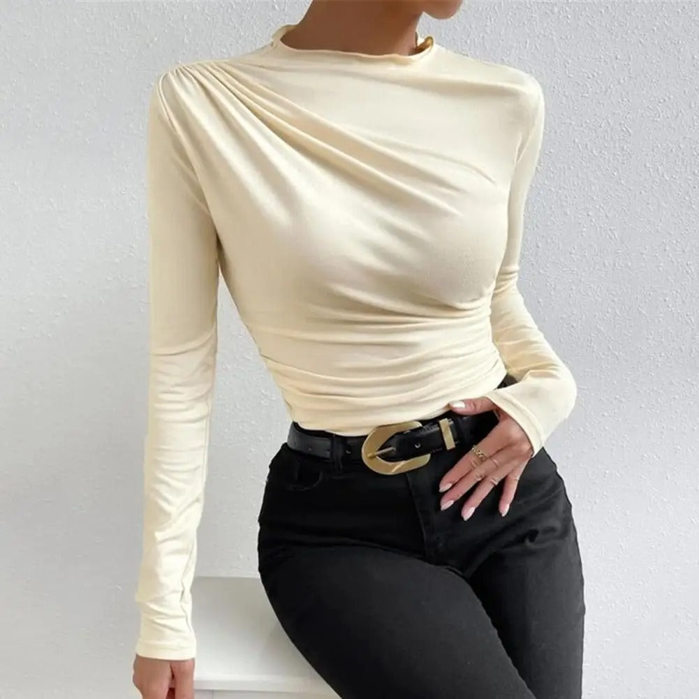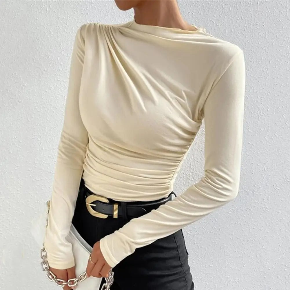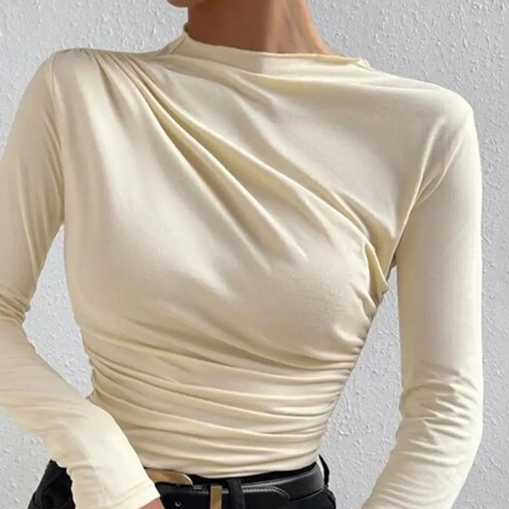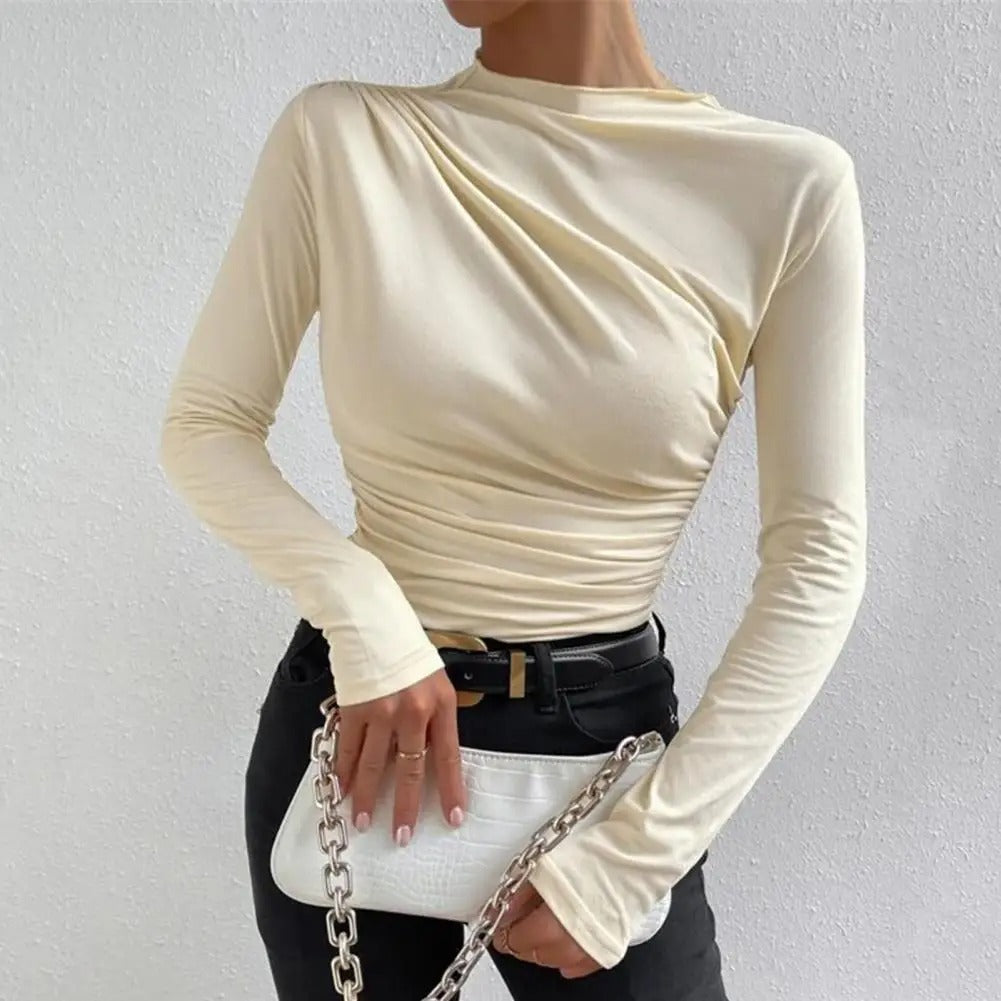 Diseño de largo medio. Cuello recto alto. Manga larga. Estilo ajustado fruncido en el pecho, con caída asimétrica.