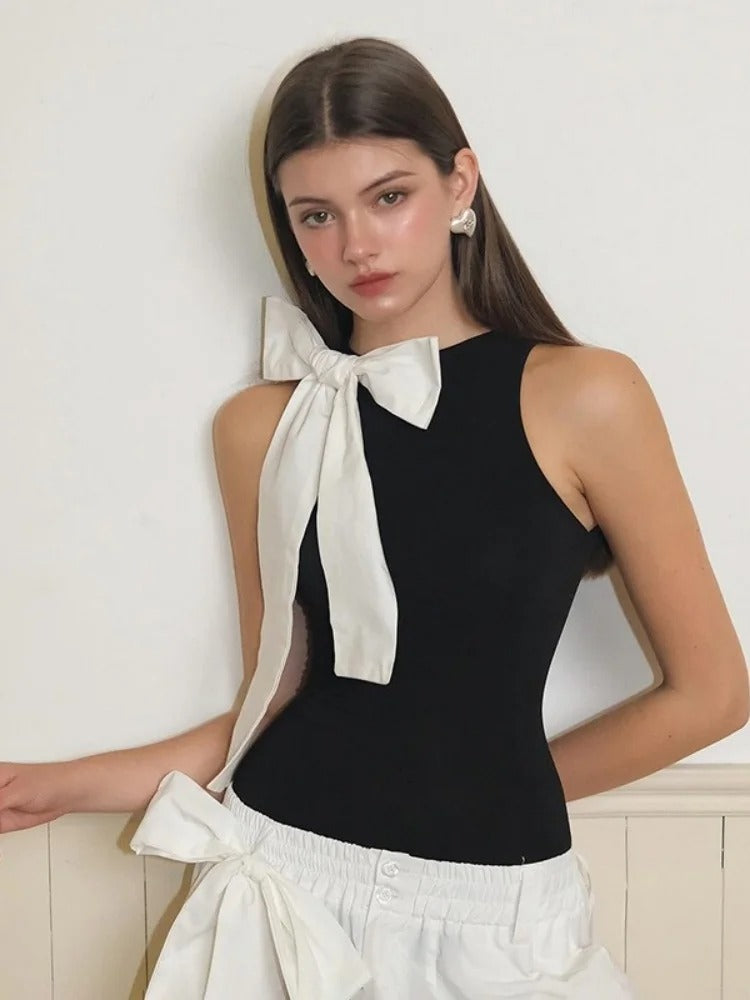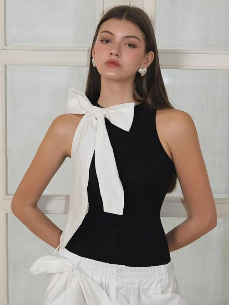 Sin mangas. Cuello Halter. Detalle de lazo maxi en el frontal. Ajuste entallado.