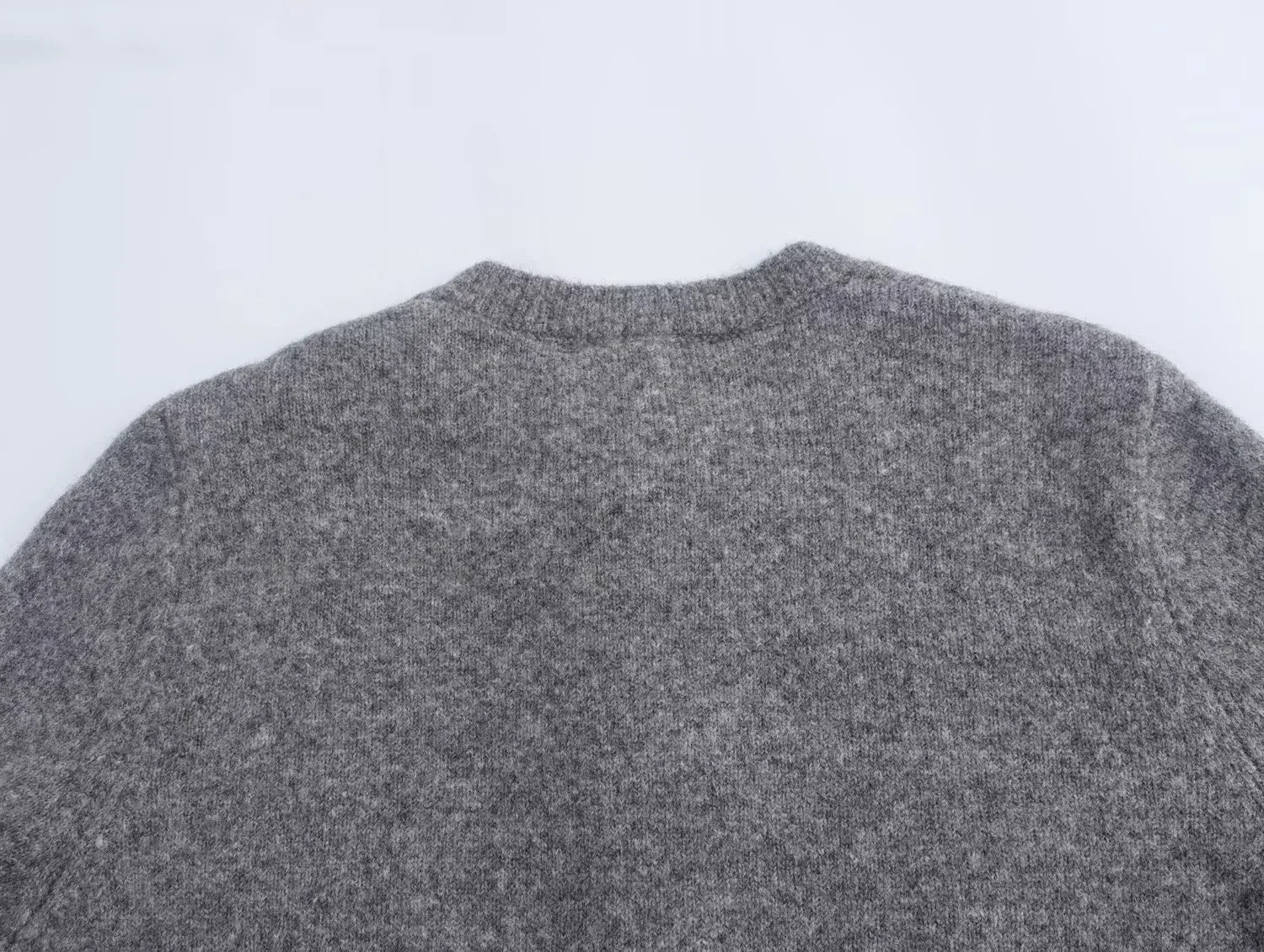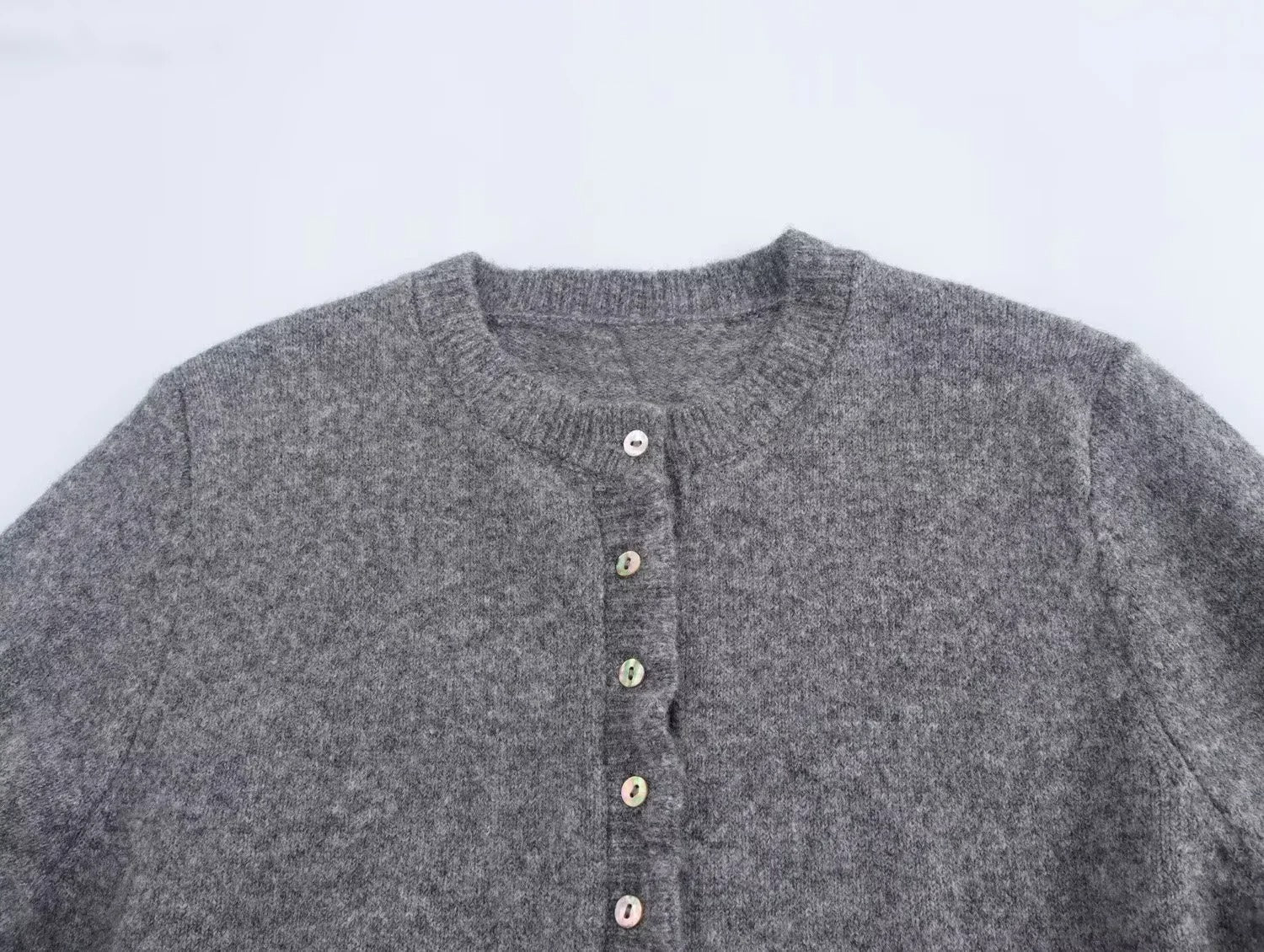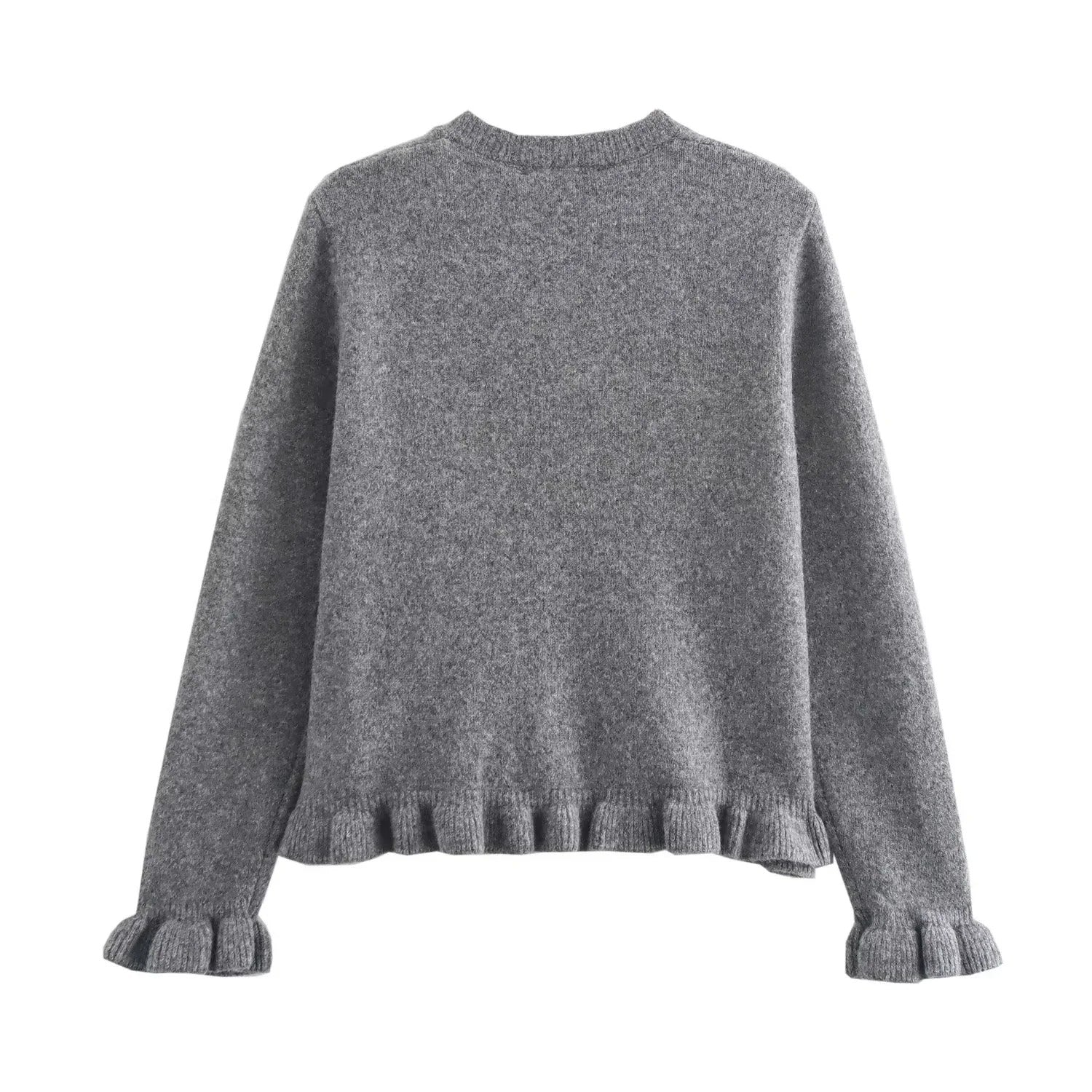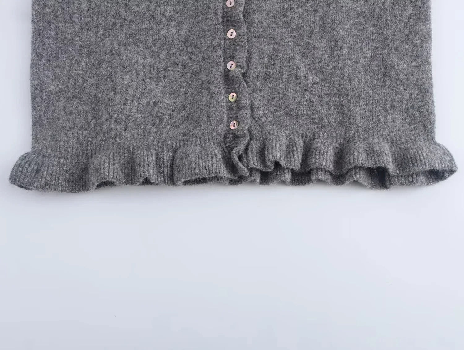 Cárdigan de punto. Diseño de manga larga, detalle de cierre de botones en la parte posterior. Acabado de volantes en los bordes. Cuello redondo