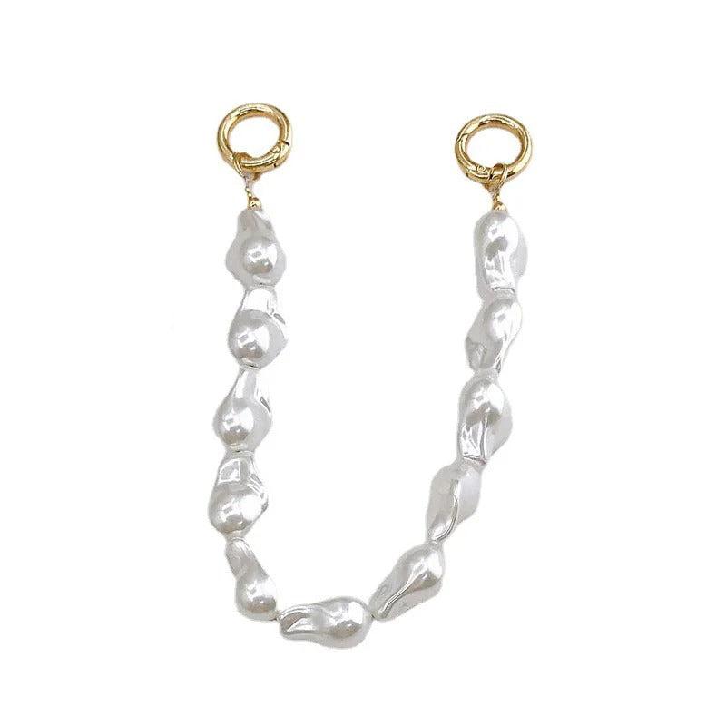 Llavero, colgante para el bolso. Diseño de cadena con doble cierre y abalorios de perlas irregulares. Longitud de 30cm.