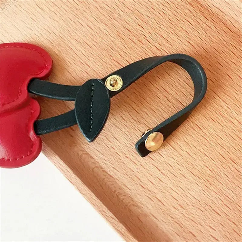 Llavero, colgante para el bolso. Diseño en forma de cereza. Disponible en dos colores: rojo y rosa. Material duradero y suave al tacto de acabado en cuero sintético. Fácil de colgar gracias a su cordón y cierre de botón.