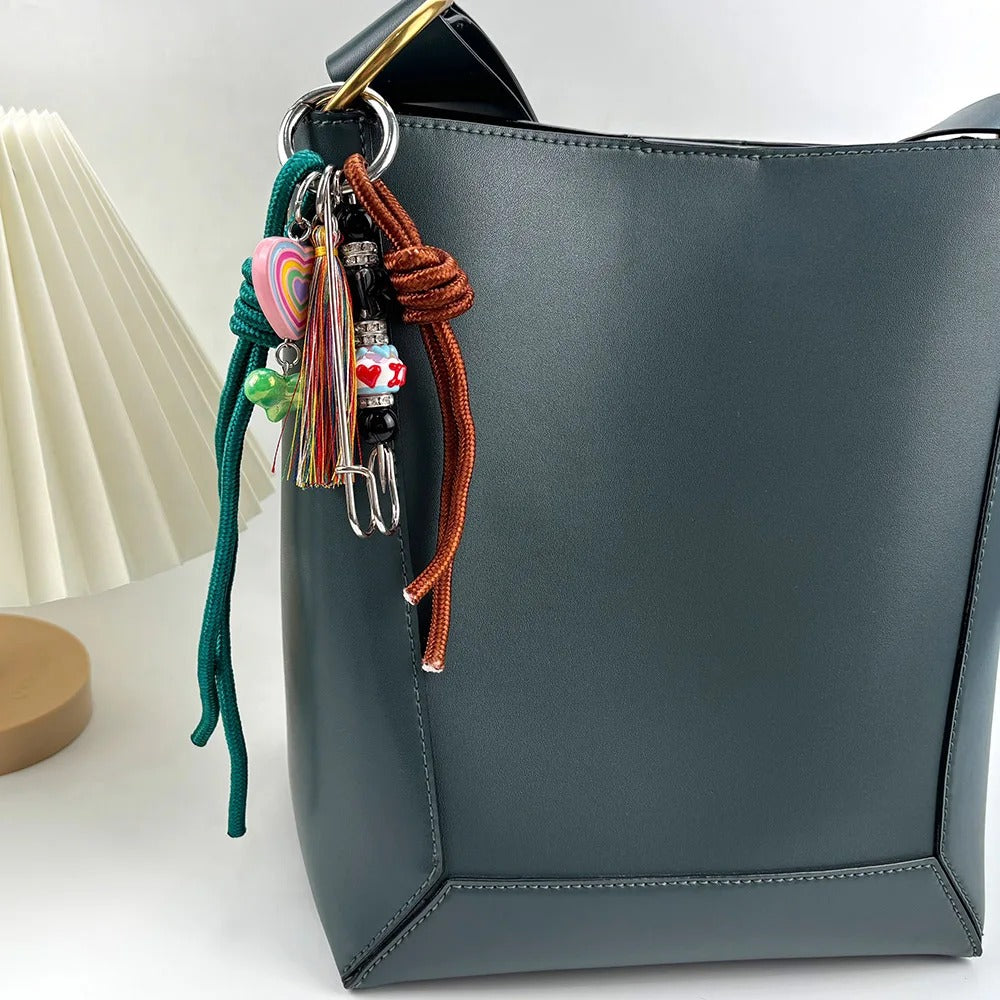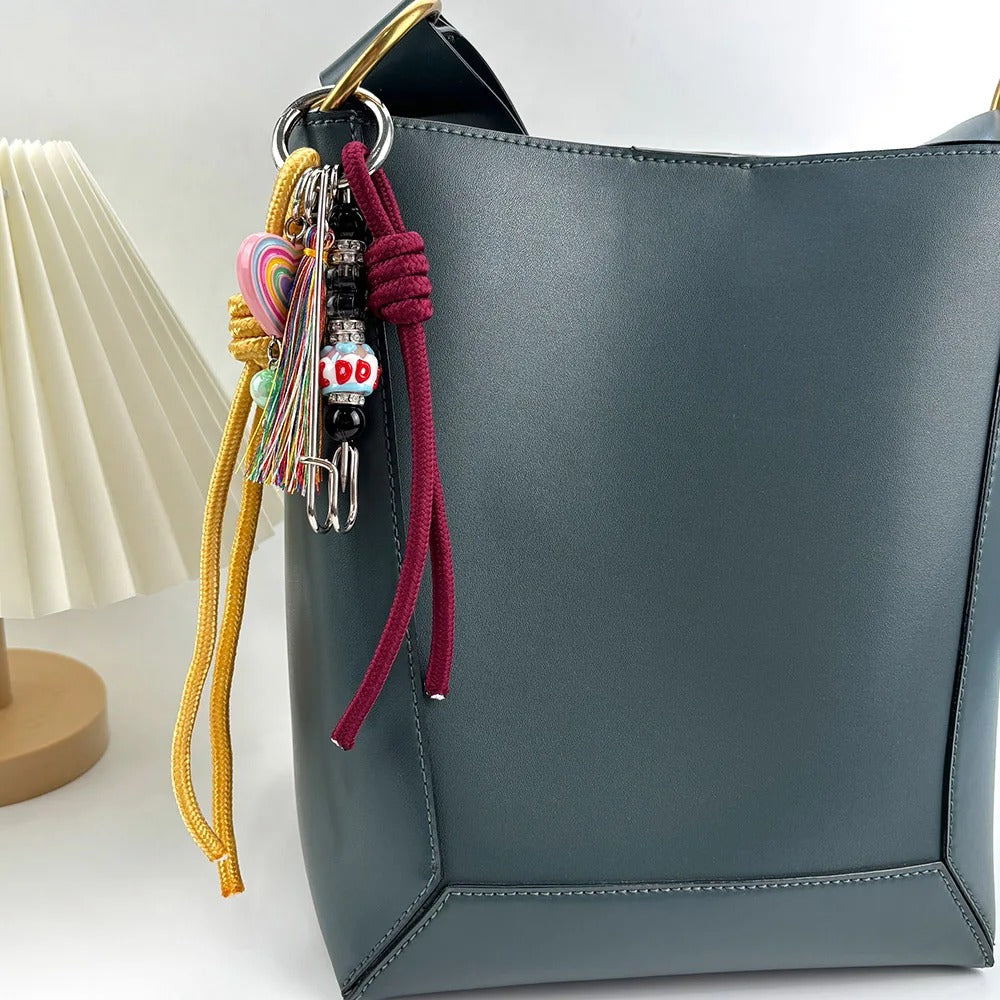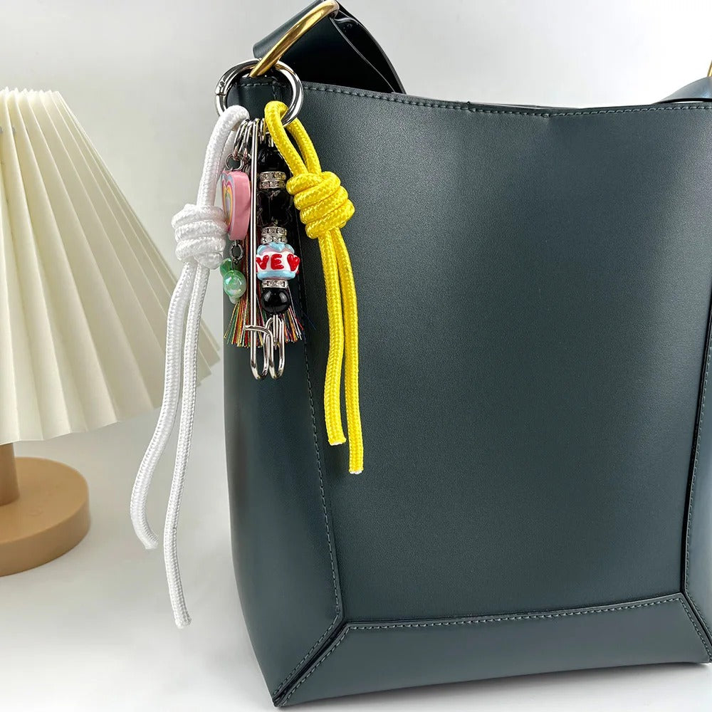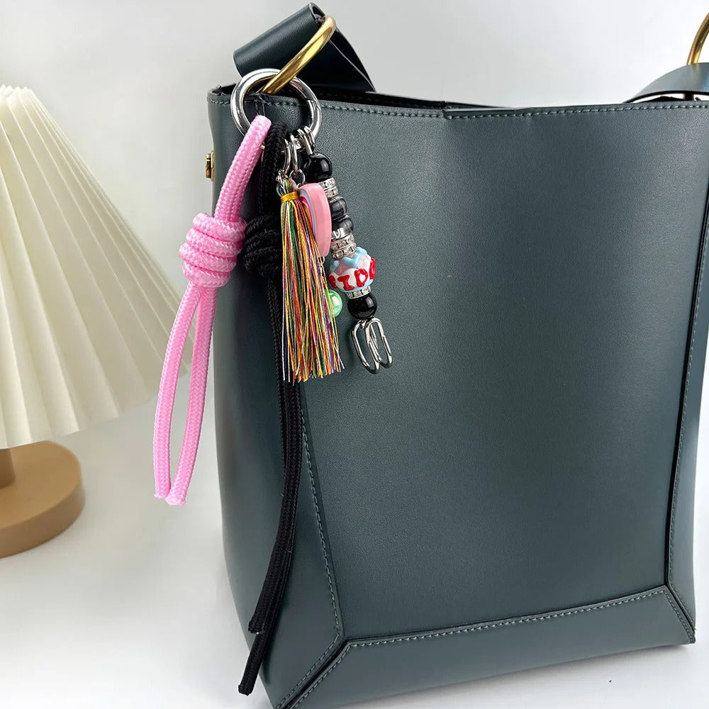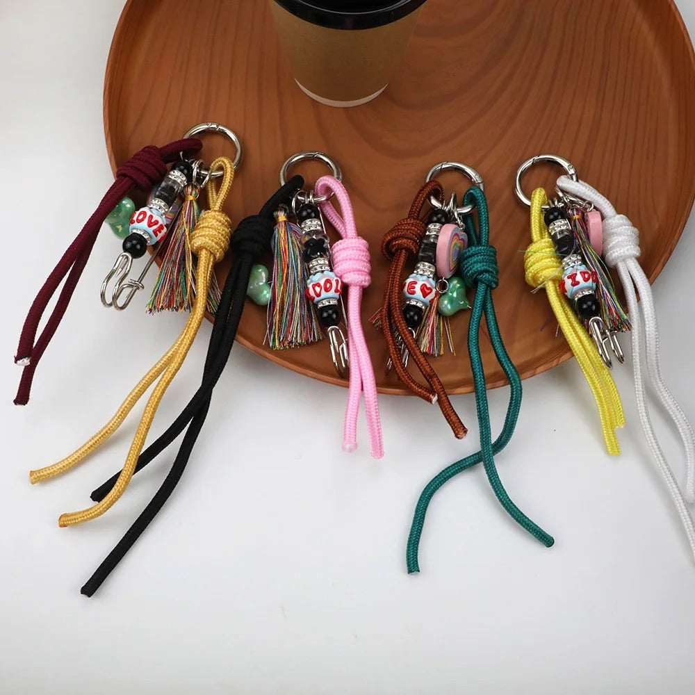 Llavero, colgante para el bolso. Diseño con cuerdas y abalorios. Disponible en cuatro colores: rosa/negro, amarillo/blanco, rojo vino/dorado y verde/marrón.