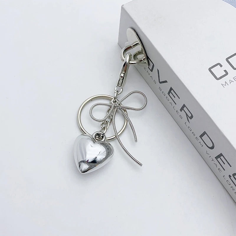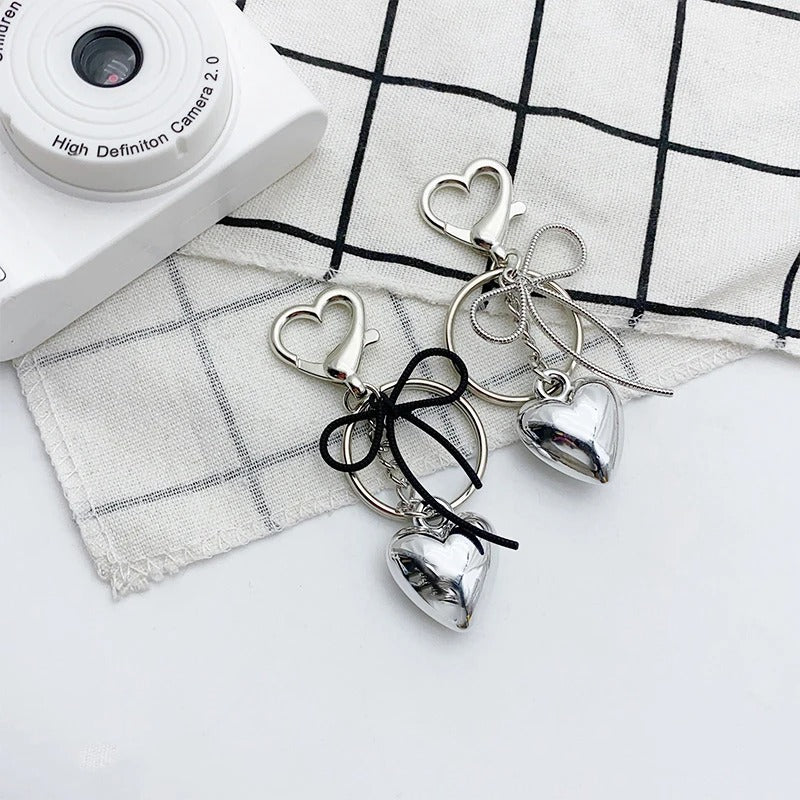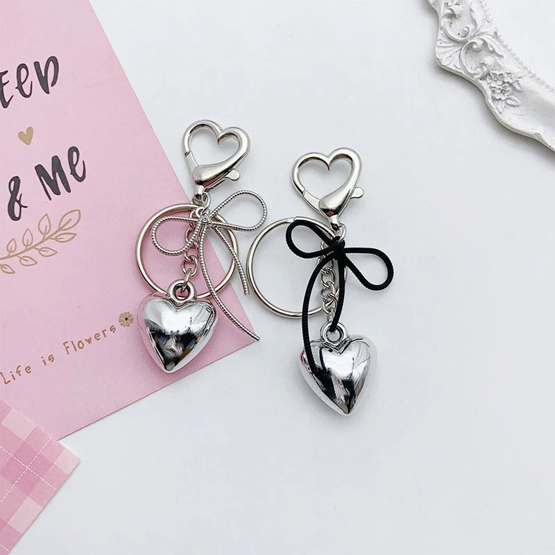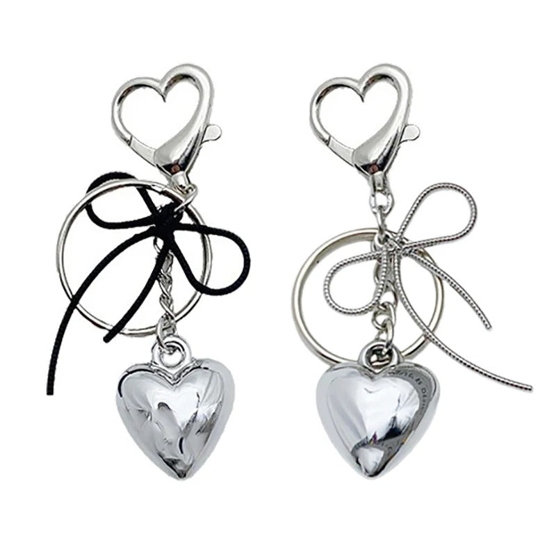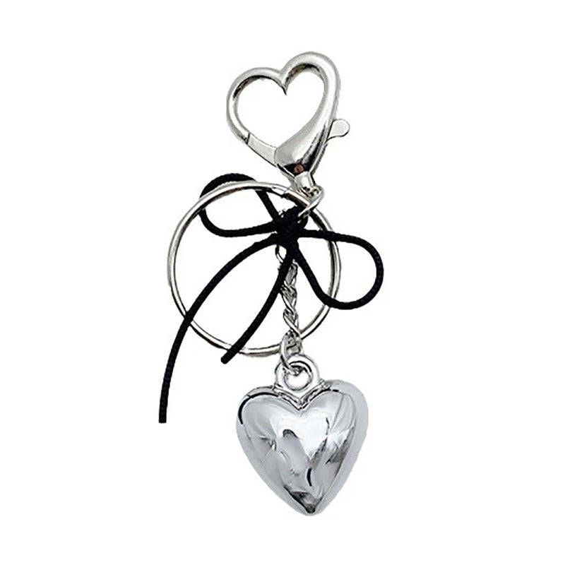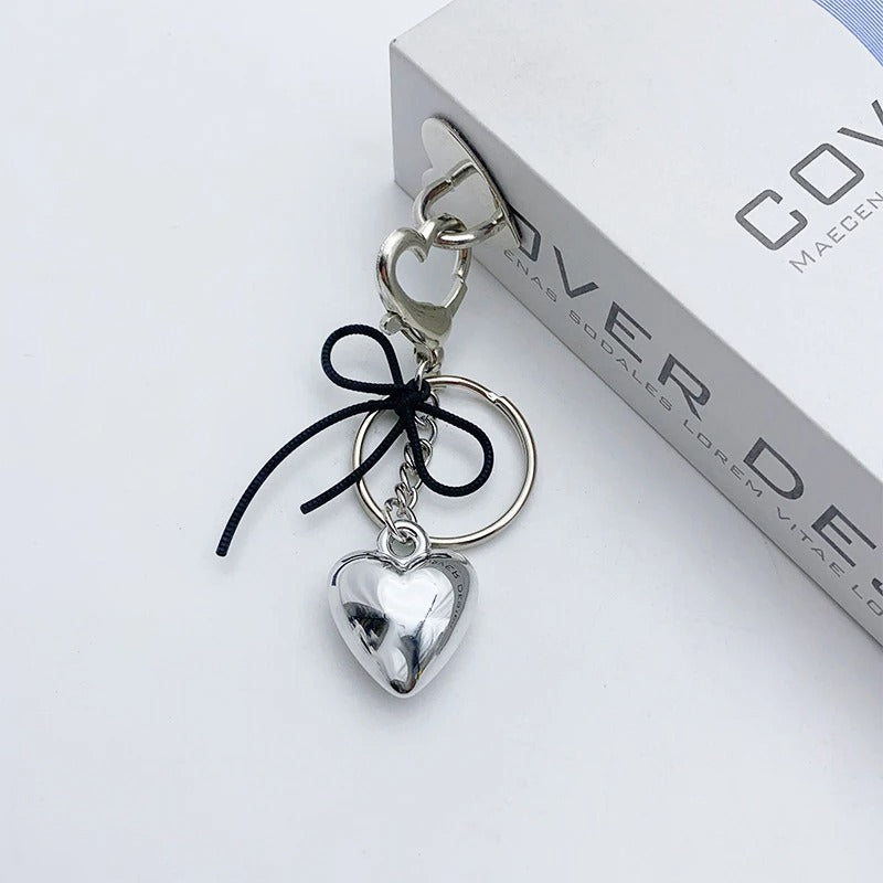 Llavero, colgante para el bolso. Diseño en forma de colgante con corazón y lazo. Muesca en forma de corazón. Disponible en dos colores: negro y gris. Longitud de 8cm.