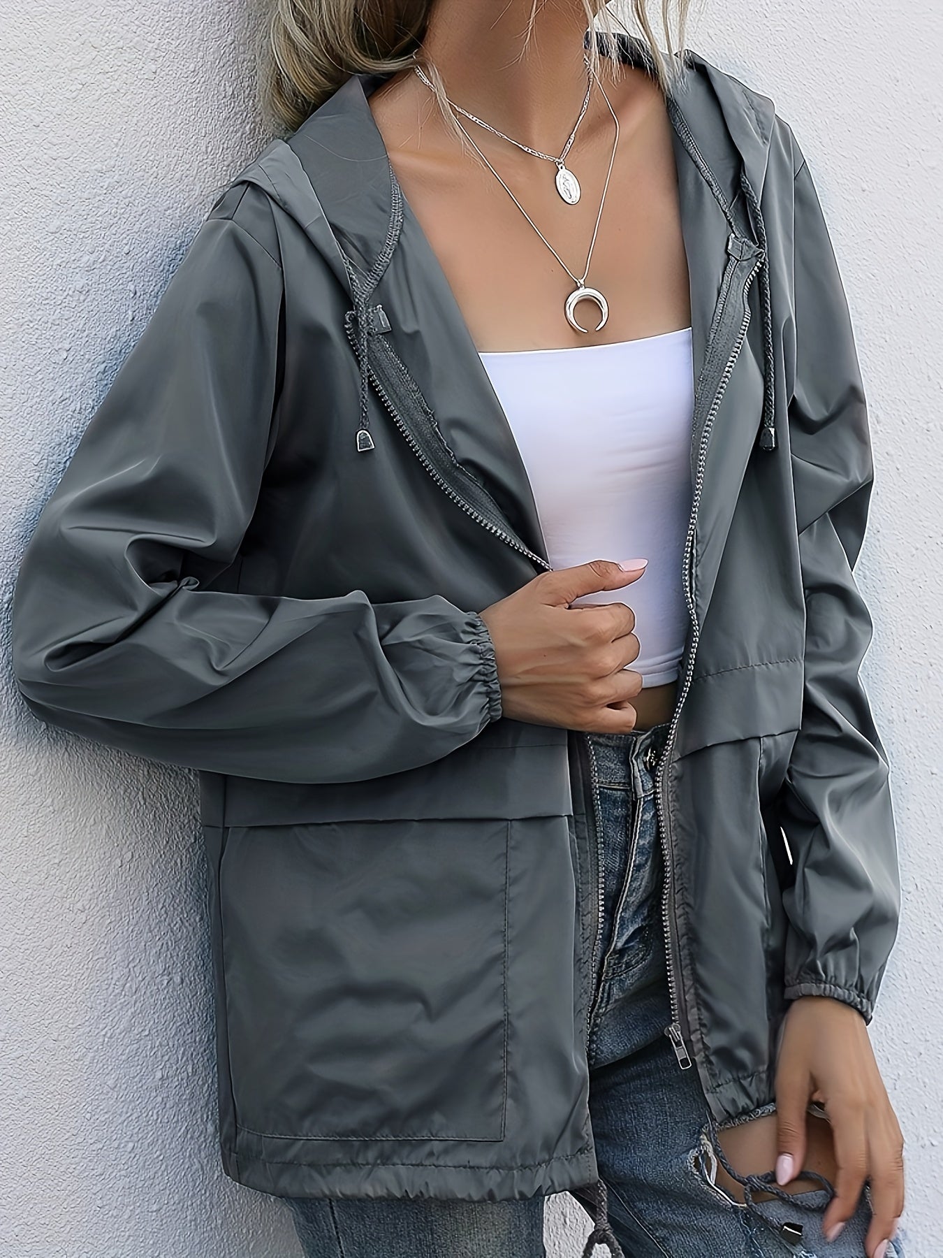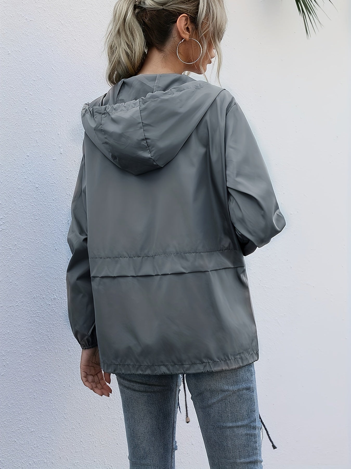 Chaqueta engomada con capucha y manga larga. Cierre frontal con cremallera.