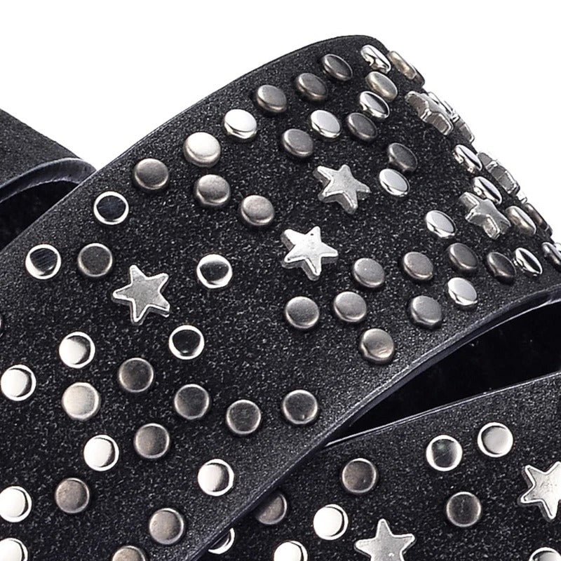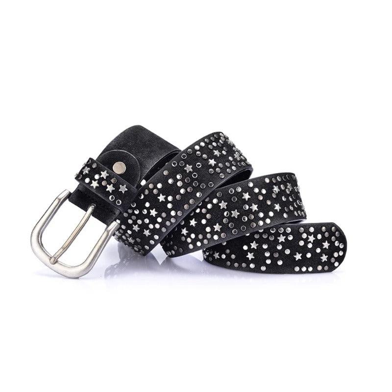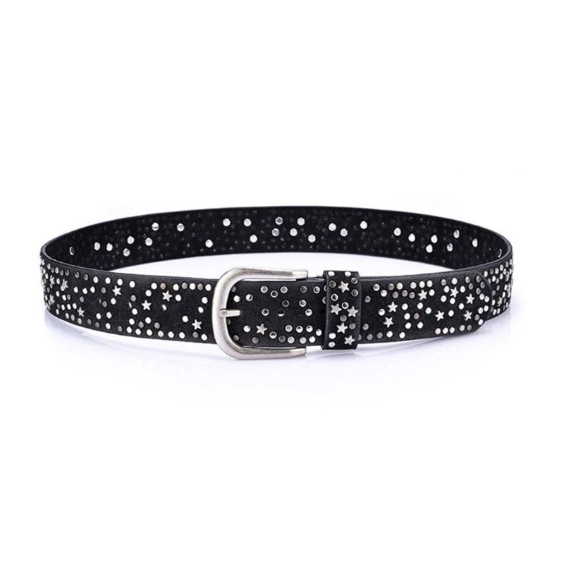 Cinturón de imitación cuero con hebilla y tachuelas plateadas. Tamaño aproximado de 110x3,8 cm.