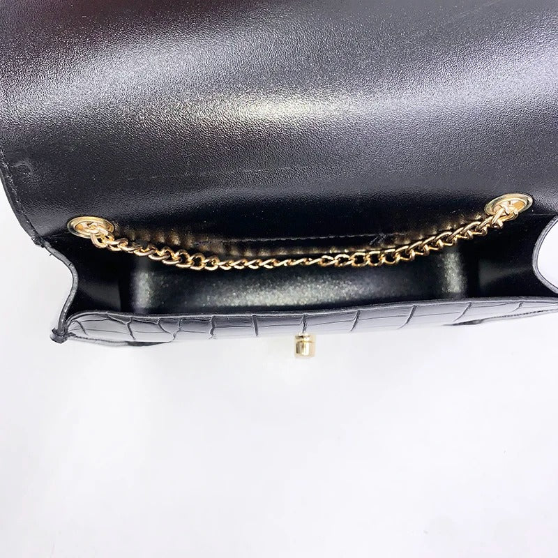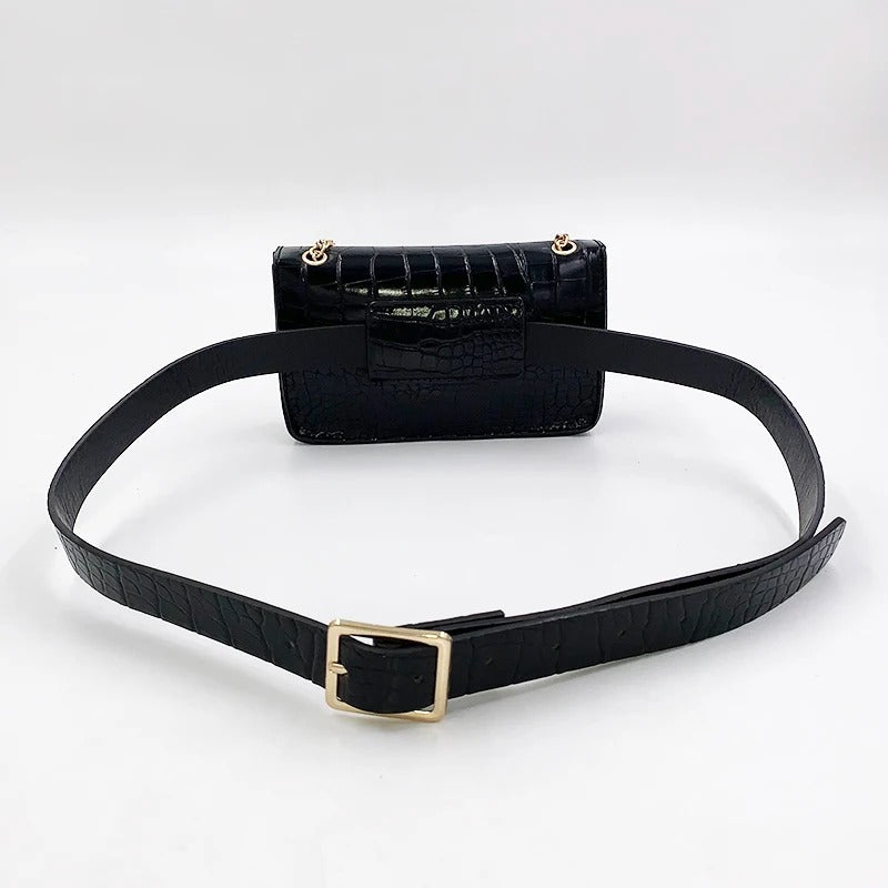 Diseño ajustable en forma de cinturón. Textura efecto cocodrilo. Cierre frontal con broche metálico. Cadena decorativa dorada. Acabado en cuero sintético con detalles texturizados. Tamaño del bolso de 17x10cm.