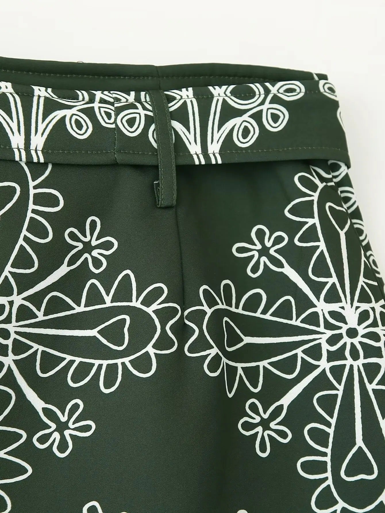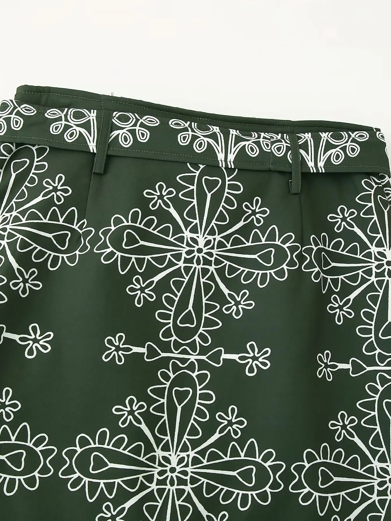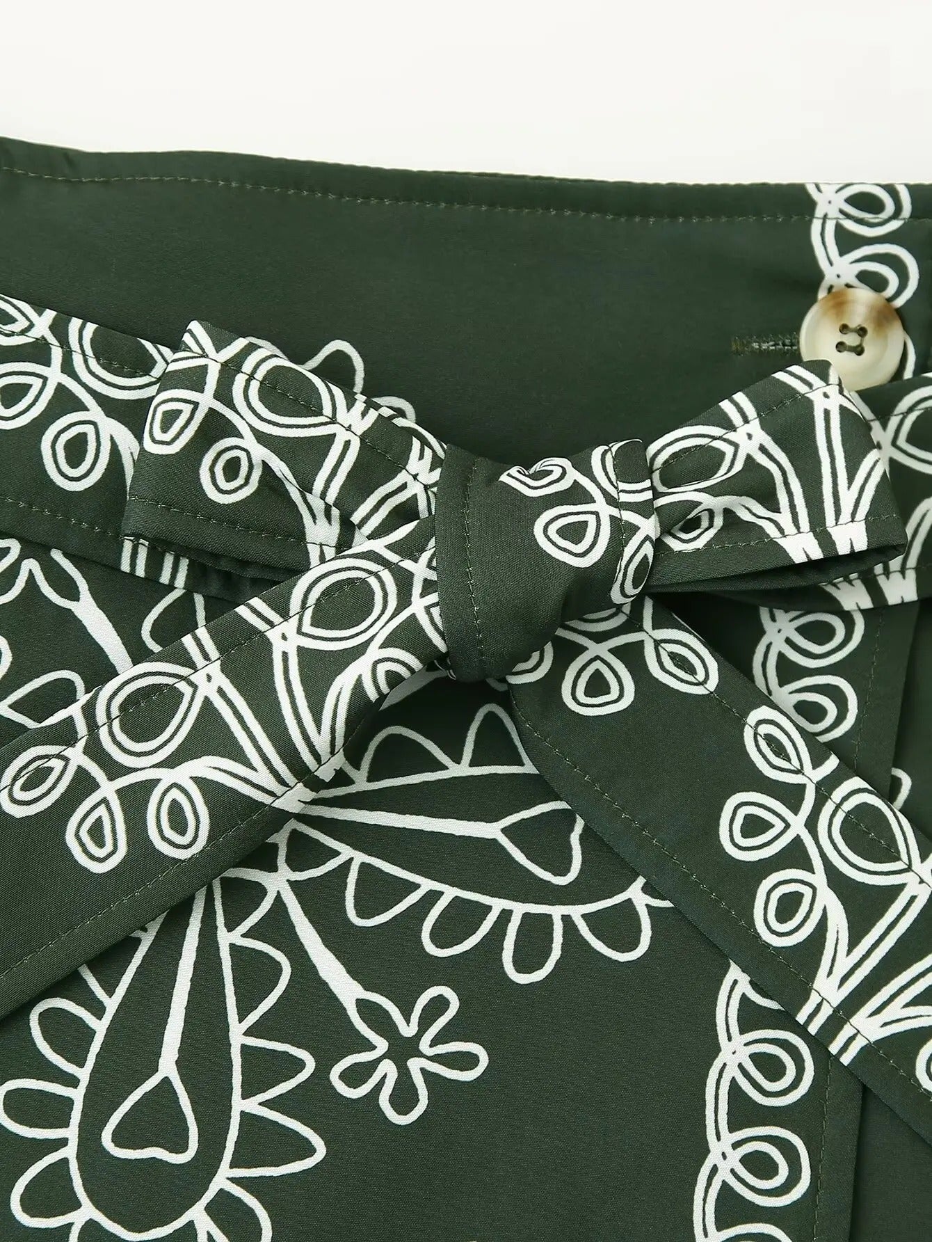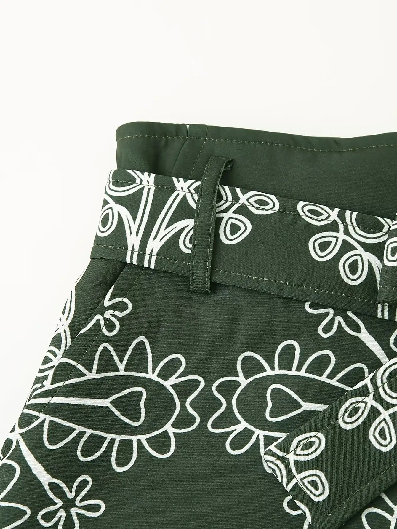 Falda corta en un tono verde oliva con estampado floral en blanco. Diseño cruzado con hebilla decorativa y lazo en la cintura.