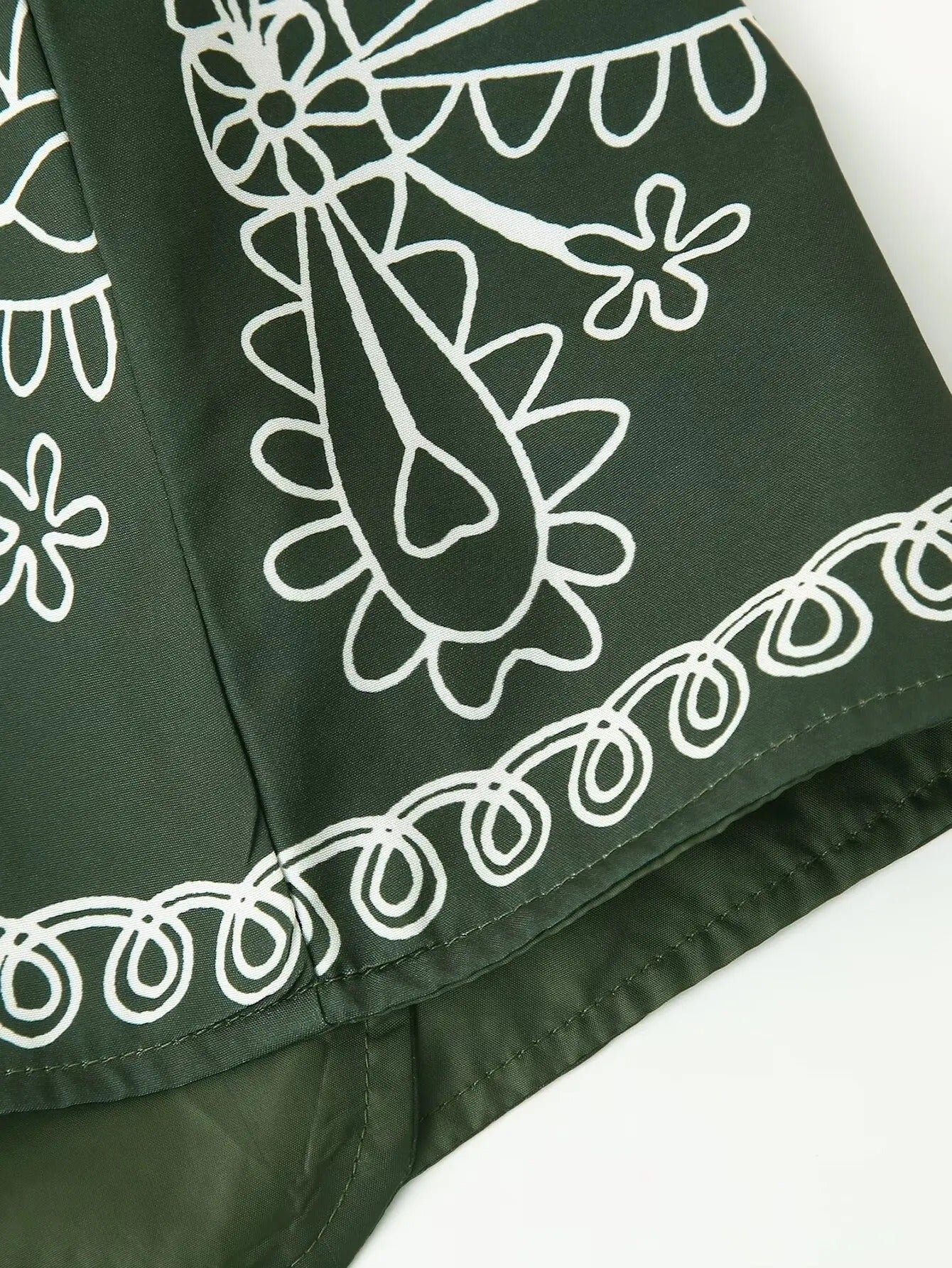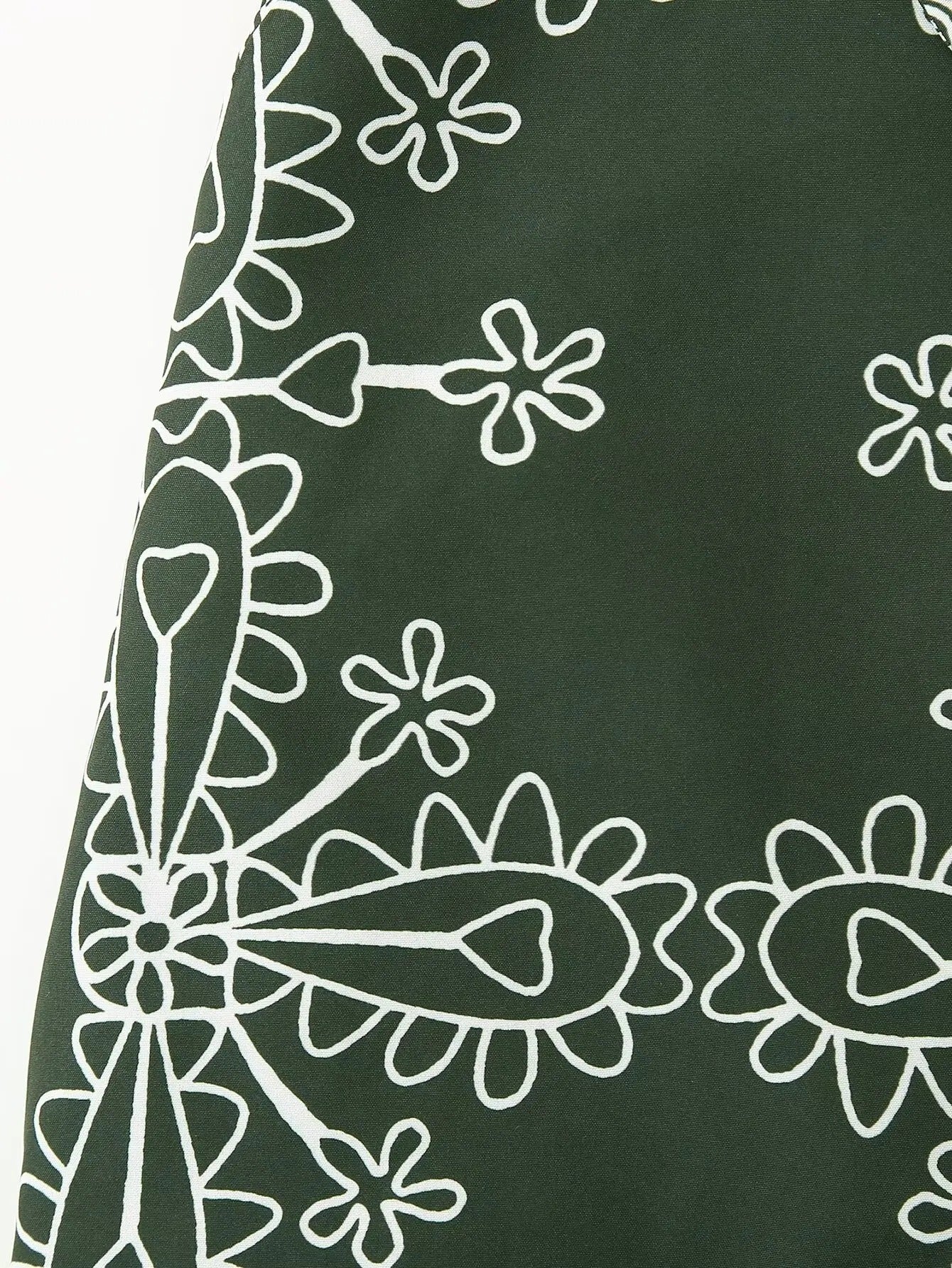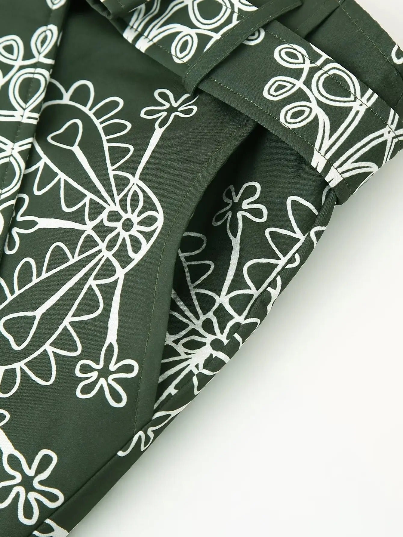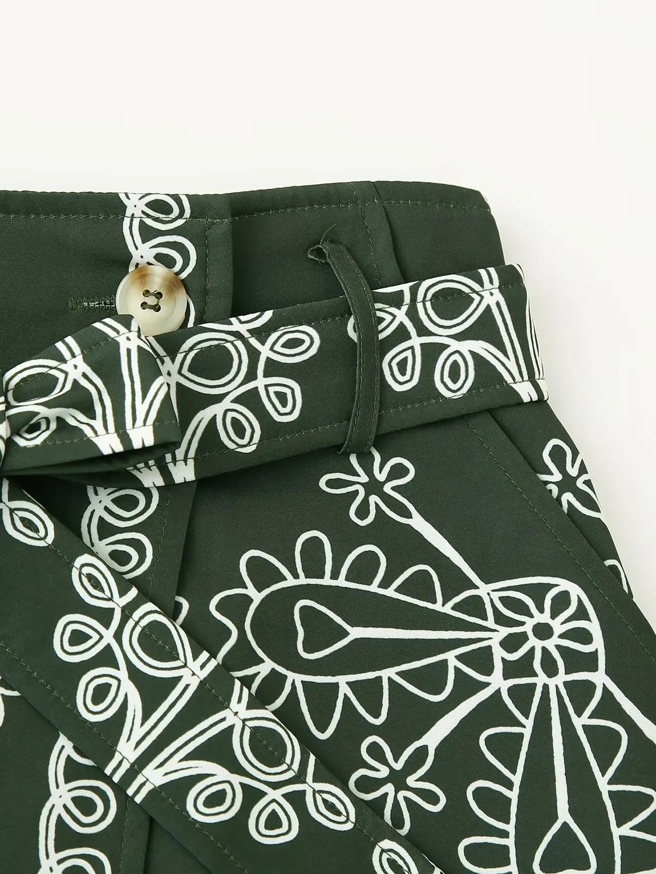 Falda corta en un tono verde oliva con estampado floral en blanco. Diseño cruzado con hebilla decorativa y lazo en la cintura.
