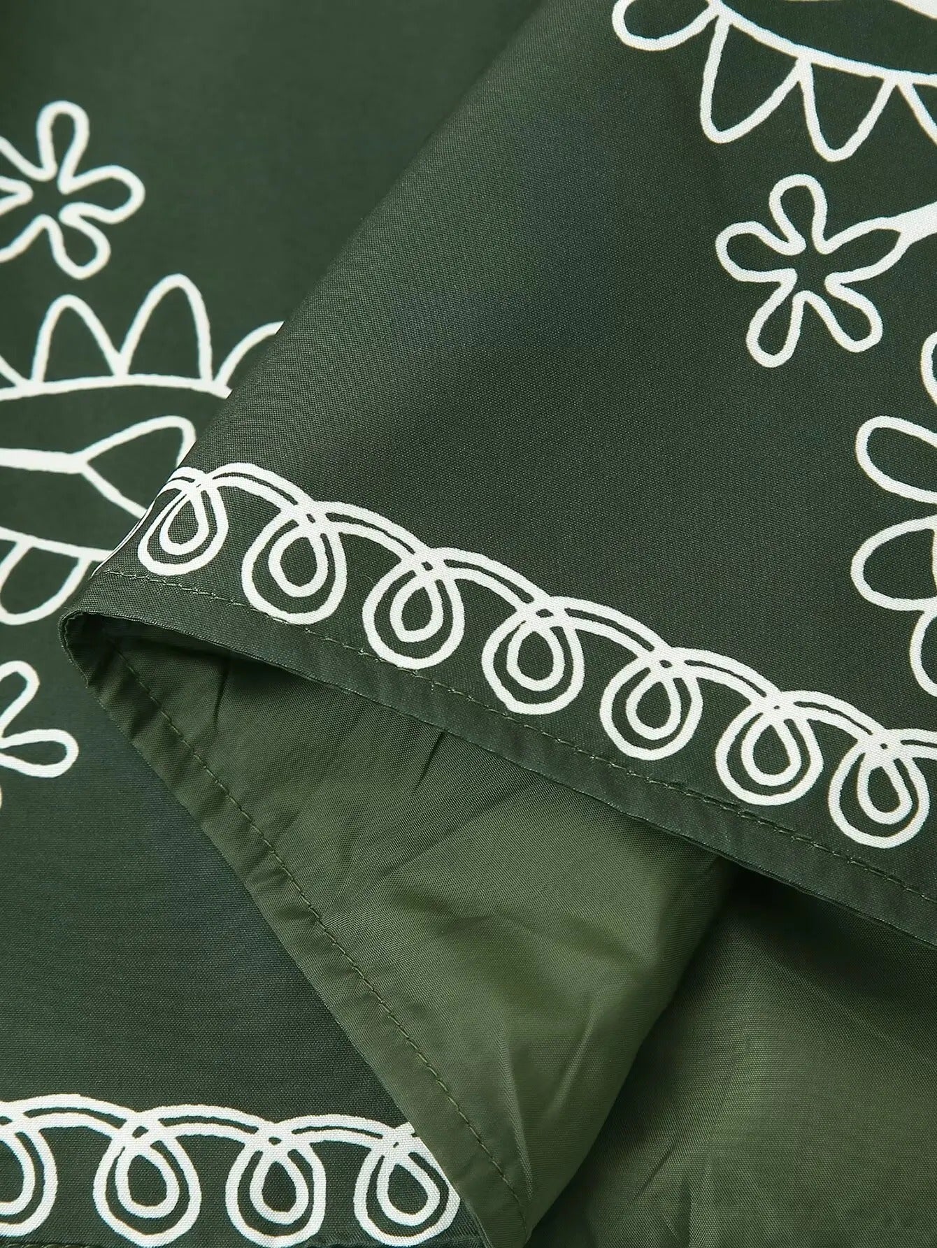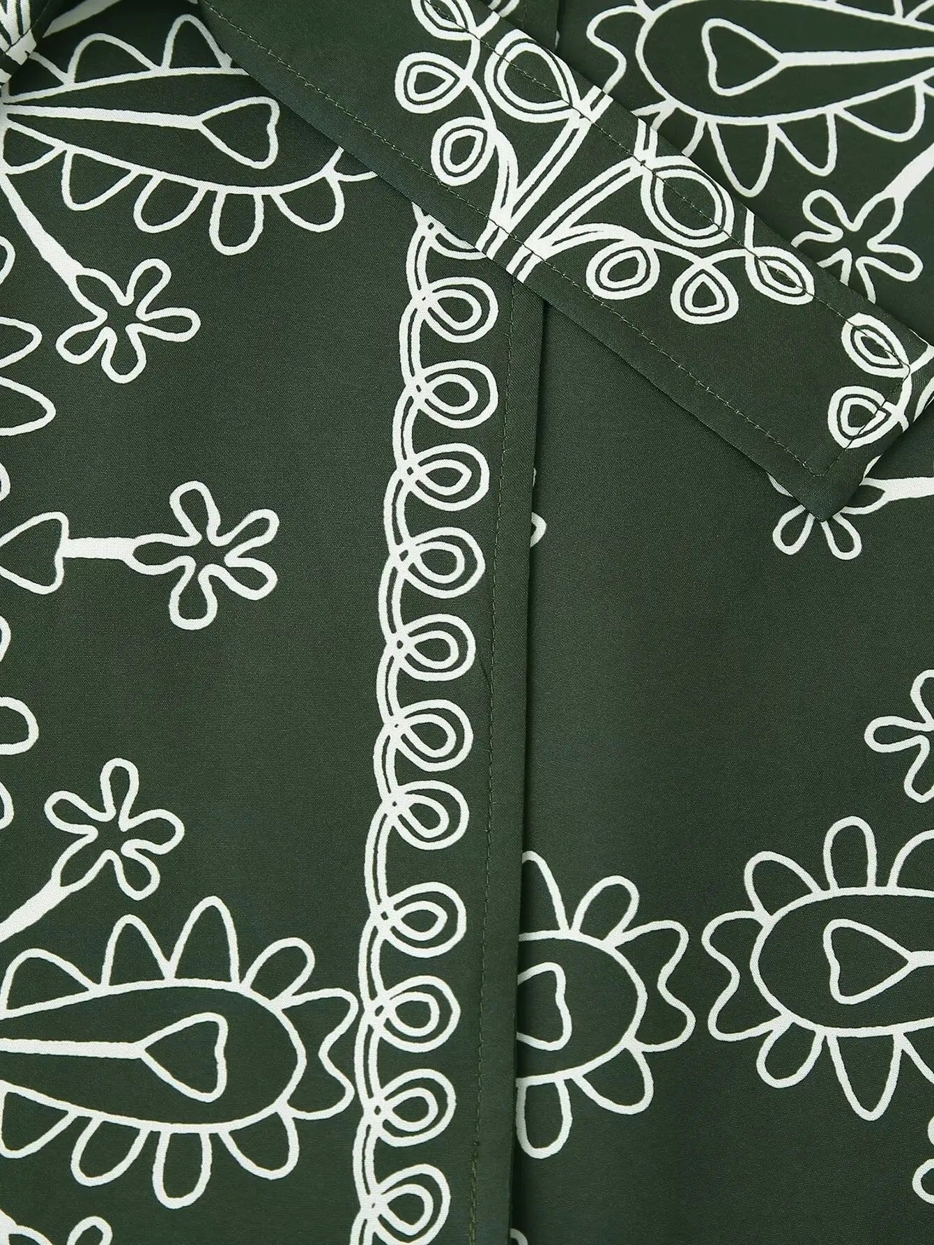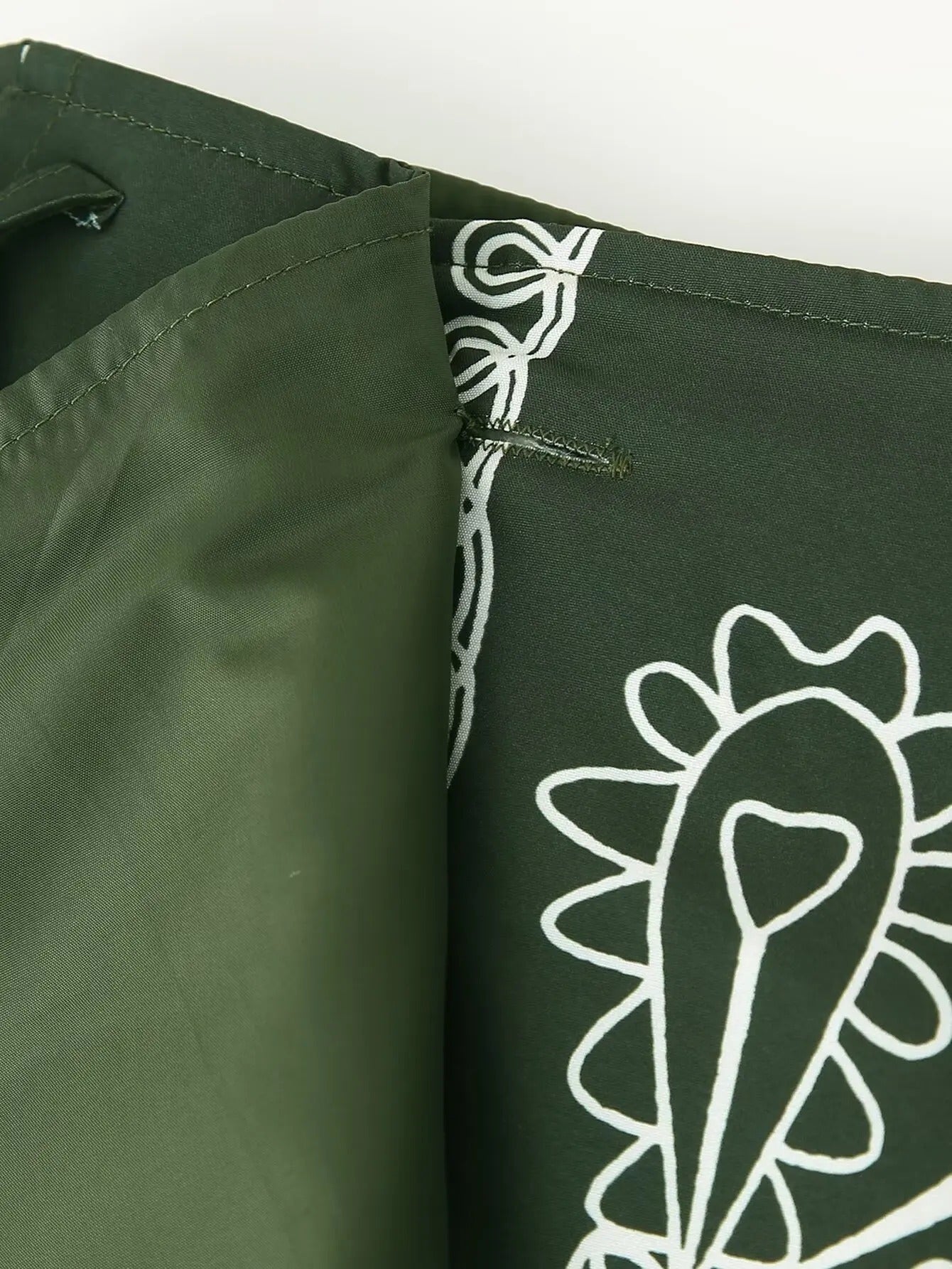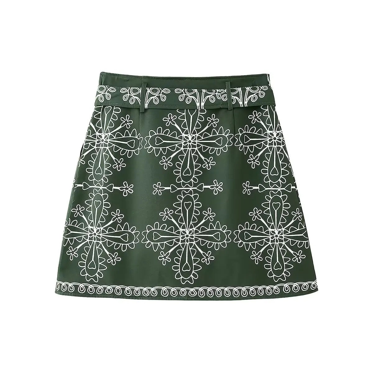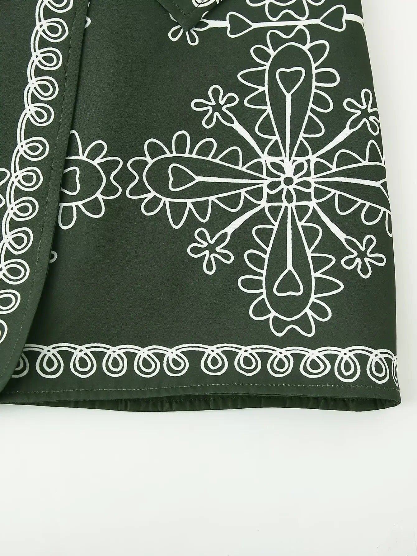 Falda corta en un tono verde oliva con estampado floral en blanco. Diseño cruzado con hebilla decorativa y lazo en la cintura.