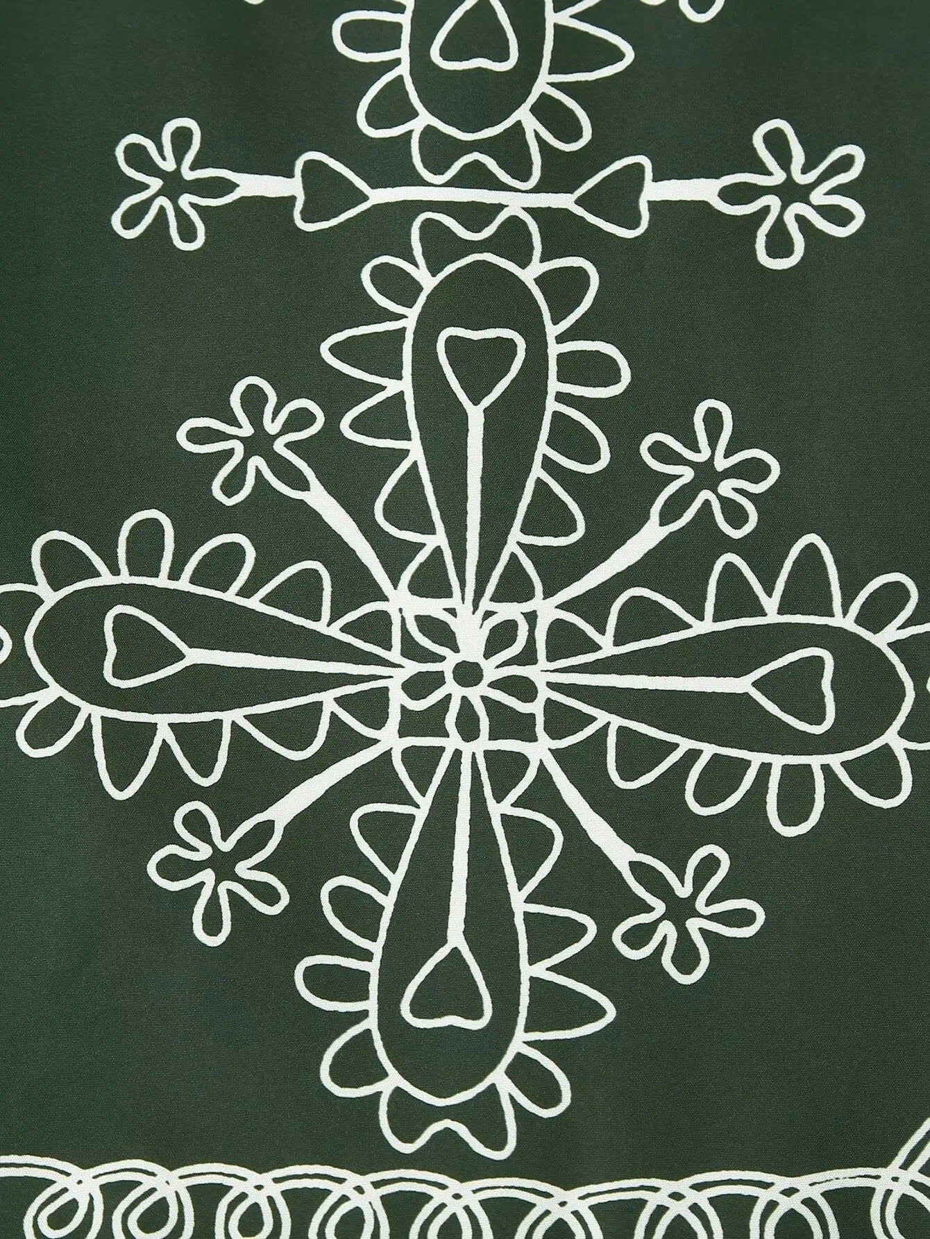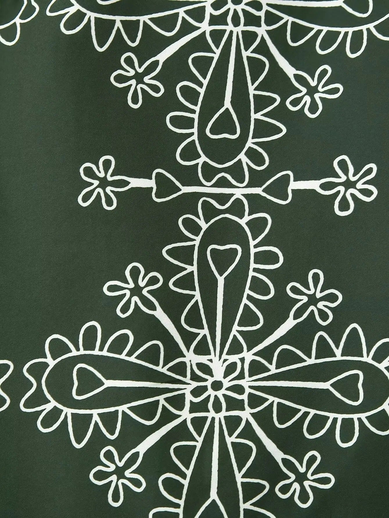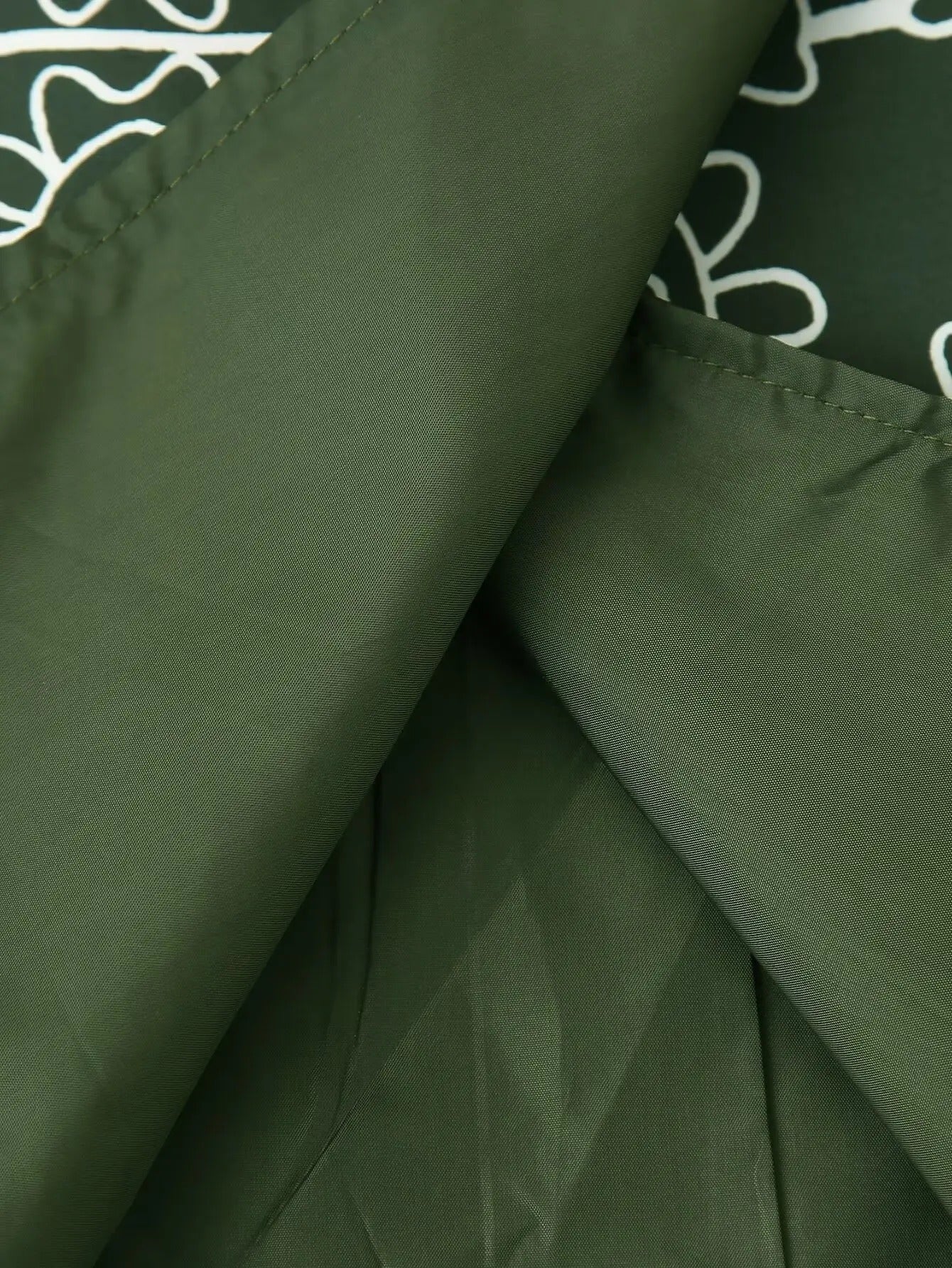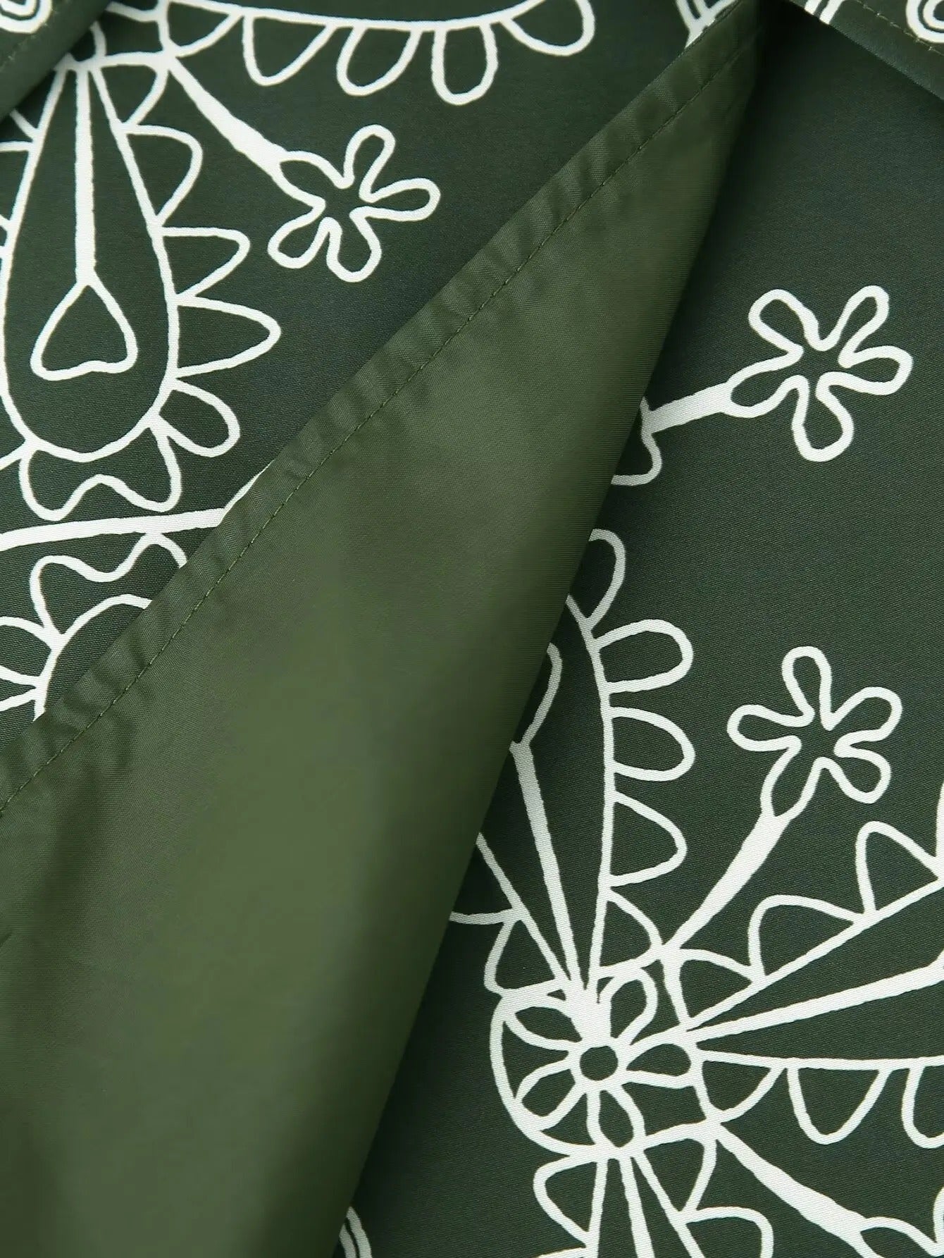 Falda corta en un tono verde oliva con estampado floral en blanco. Diseño cruzado con hebilla decorativa y lazo en la cintura.