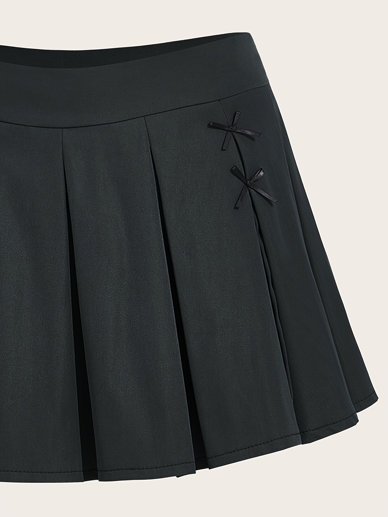 Falda corta de tablas. Detalle de lazos decorativos en los laterales. Cierre oculto de cremallera lateral.
