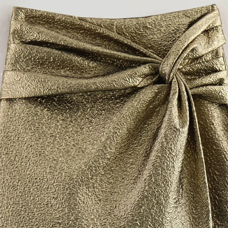 Falda delantera y pantalón trasero. Detalle de nudo lateral con apertura. Efecto metalizado. Cierre oculto de cremallera.