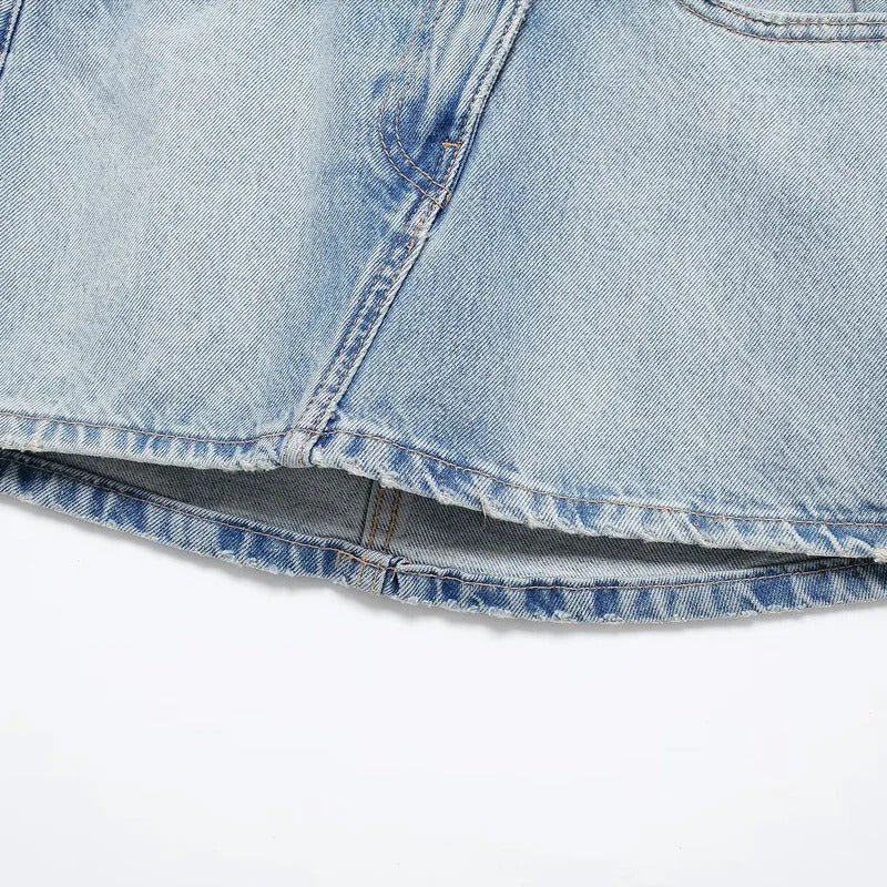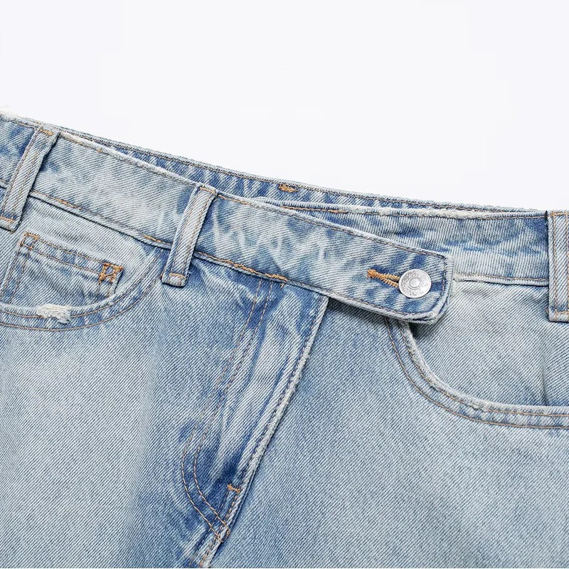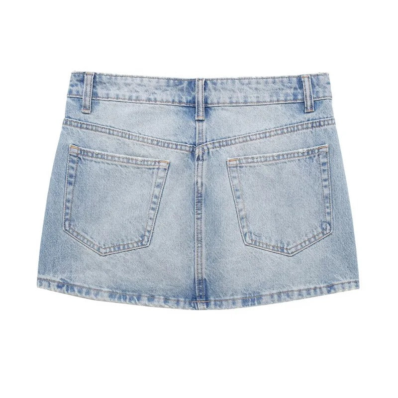 Falda vaquera con cintura y frontal asimétrico. Cierre de botón y cremallera. Longitud de 35-37cm.