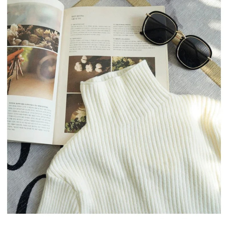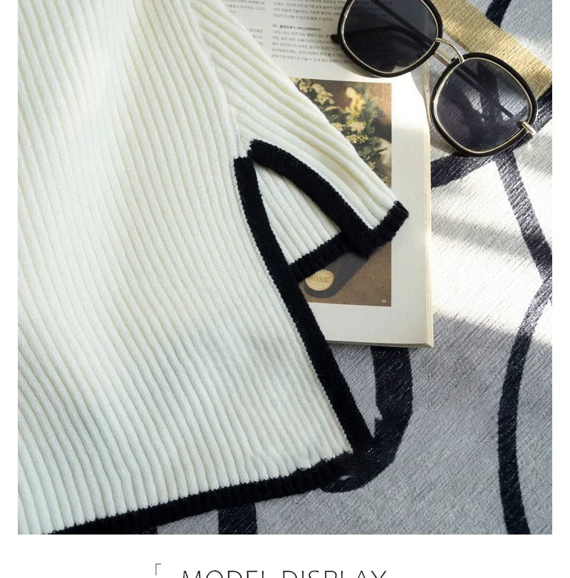 Diseño de largo medio y corte ajustado. Cuello alto. Manga larga con acabado acampanado y tejido suave en dos tonos blanco y negro. Apertura lateral en V invertida. Acabado acanalado.