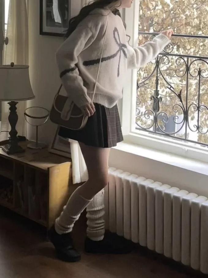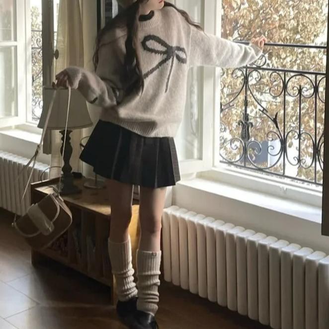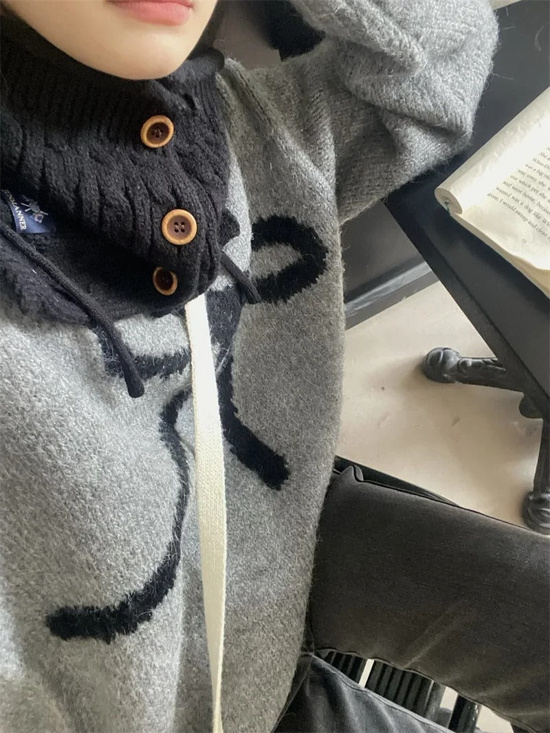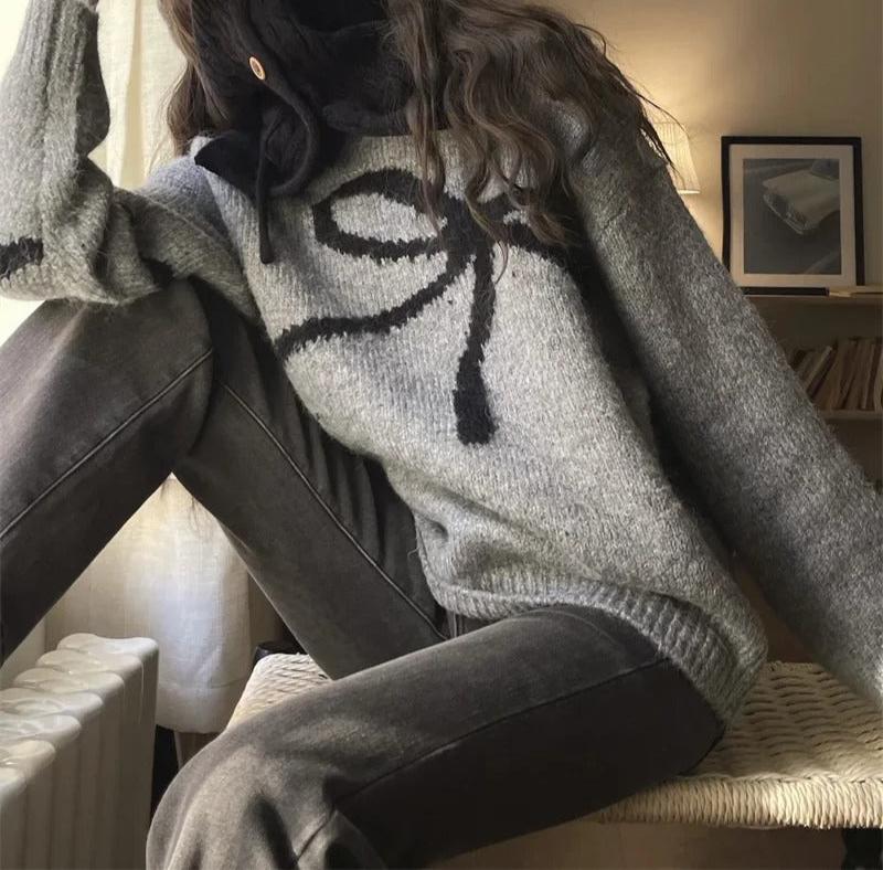 Diseño de largo medio y corte holgado. Cuello redondo con detalle de lazo en la parte frontal. Manga larga con acabado abombado y tejido suave en tono gris.