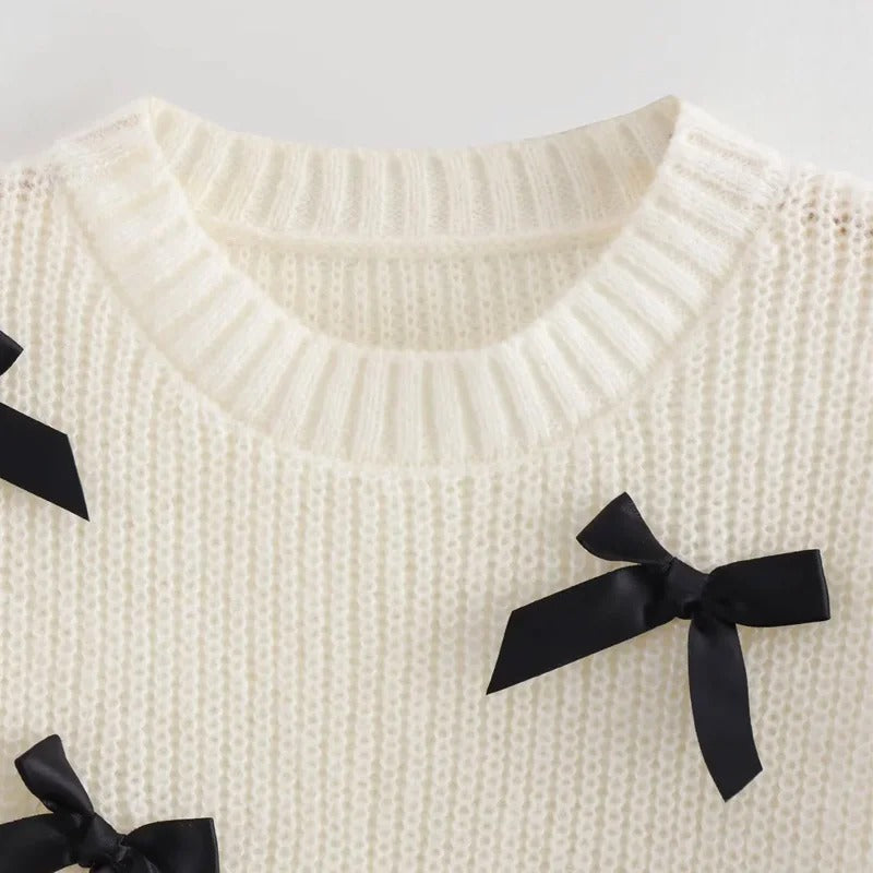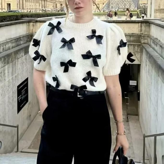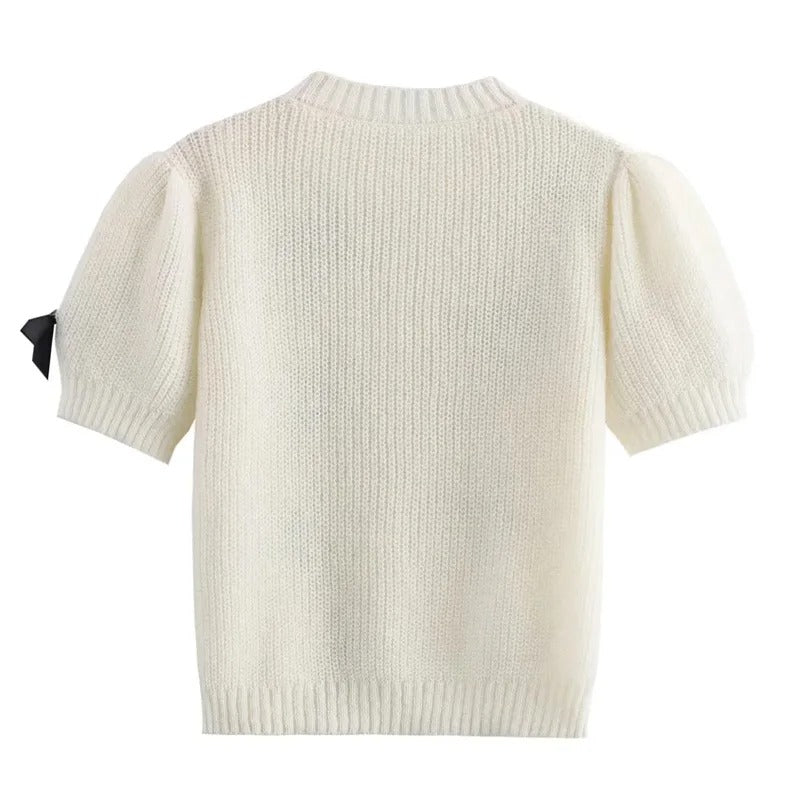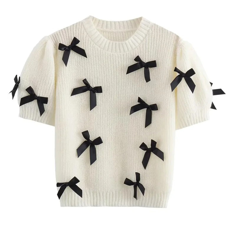 Jersey de punto corto. Cuello redondo. Manga corta abullonada. Detalle de lazos negros de tela por todo el frontal.