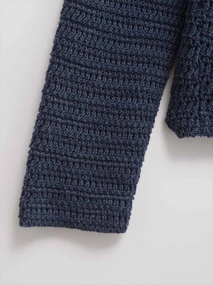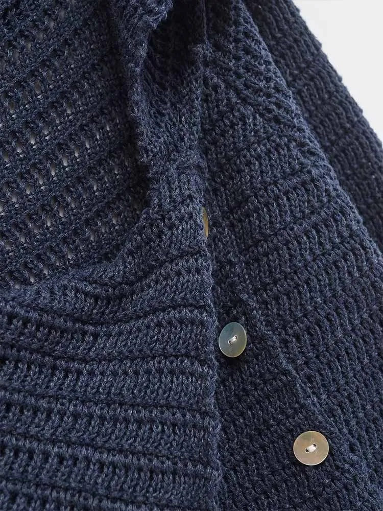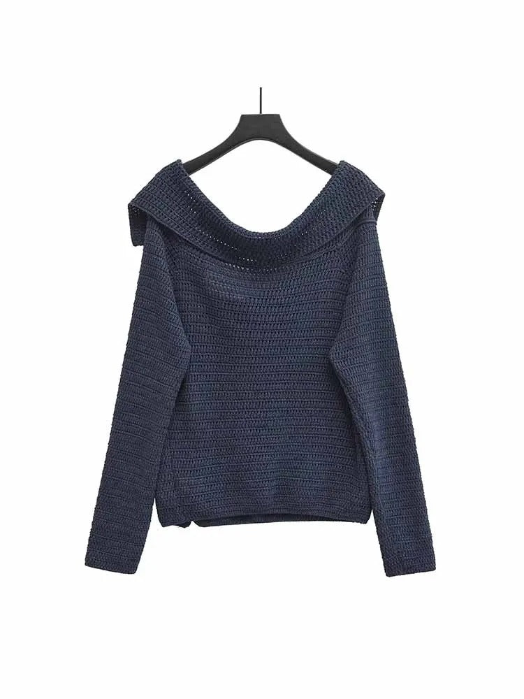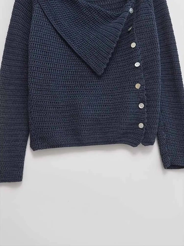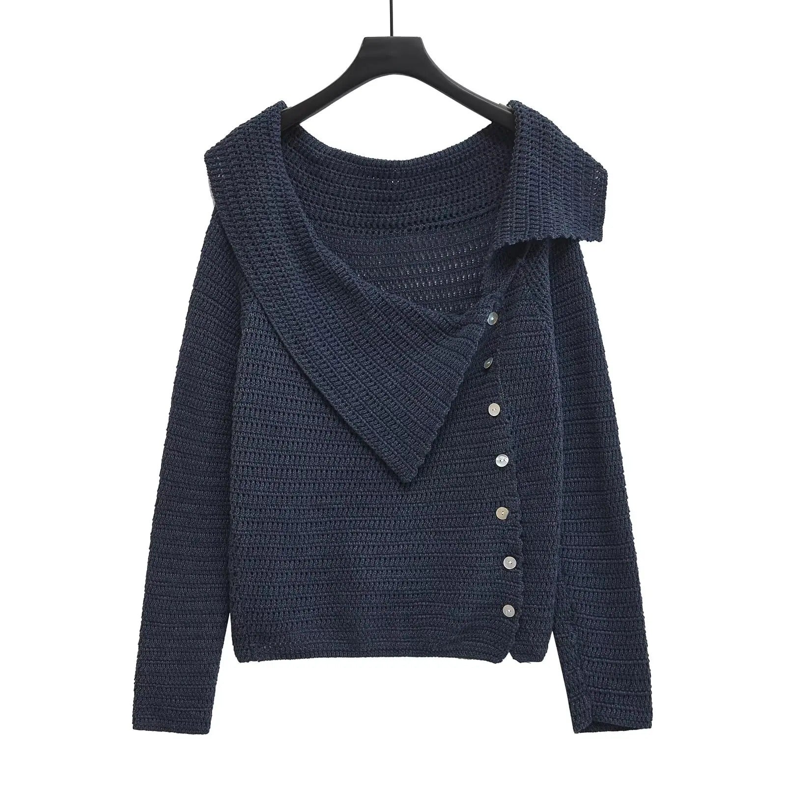 Suéter de hombros caídos con un diseño de drapeado de cuello irregular. Detalle de botones en la parte delantera. Mangas largas.
