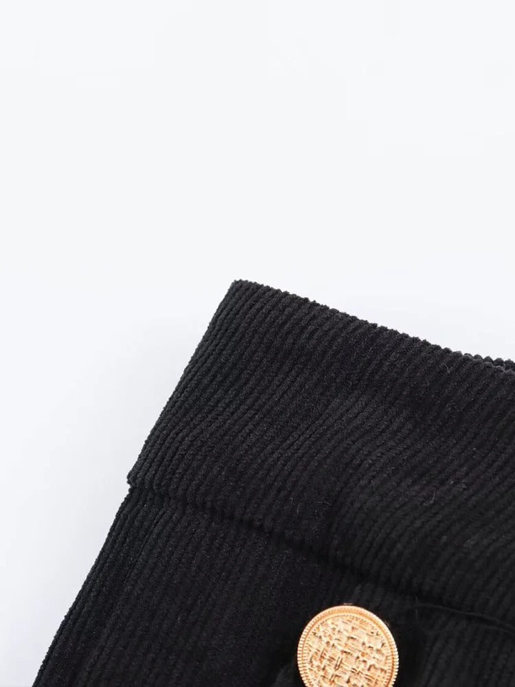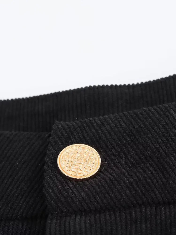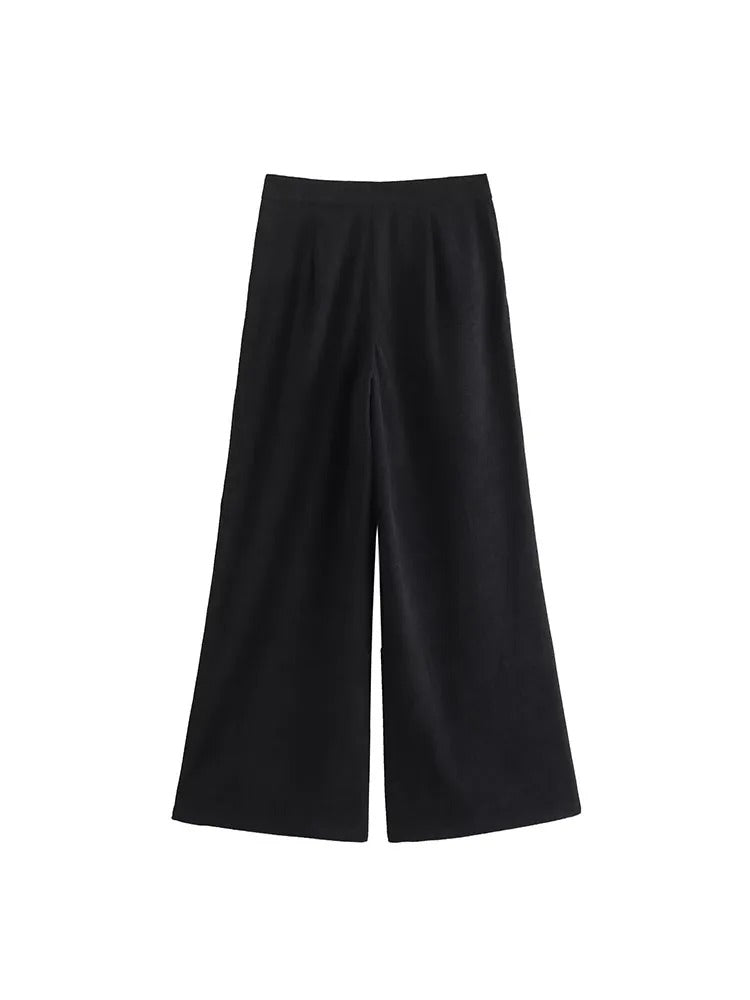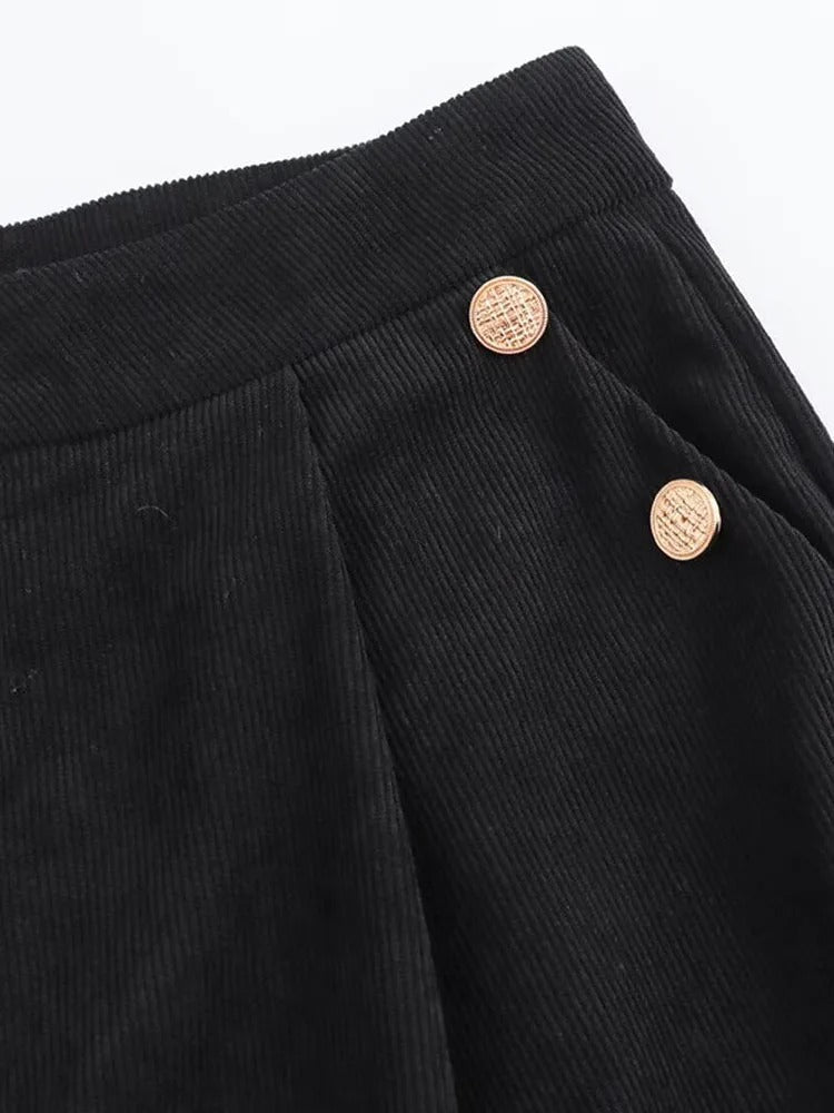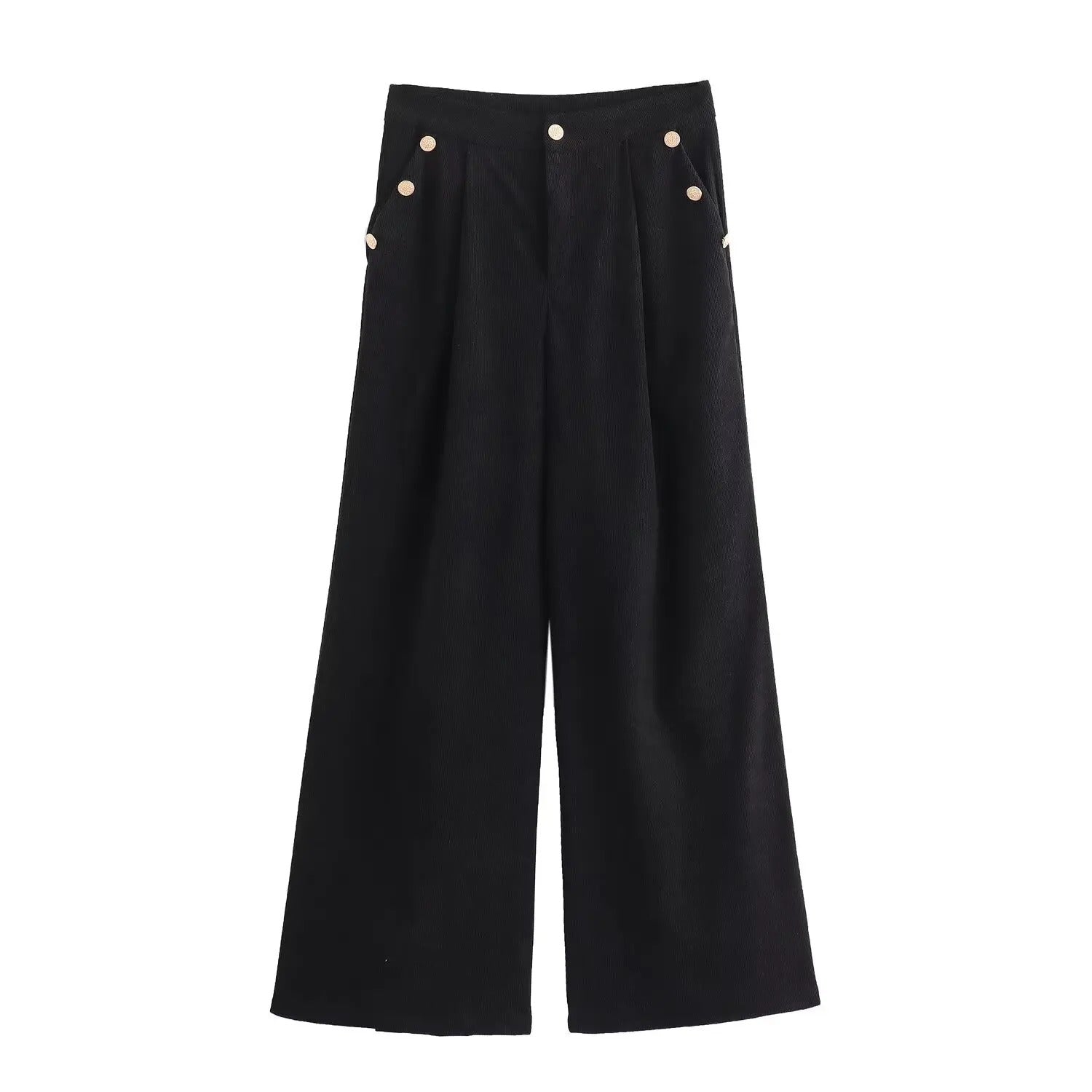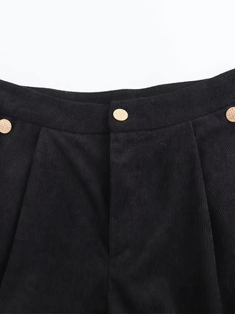 Pantalón largo de pierna ancha. Efecto holgado. Detalle de bolsillos laterales con botones decorativos. Cierre de botón y cremallera frontal.