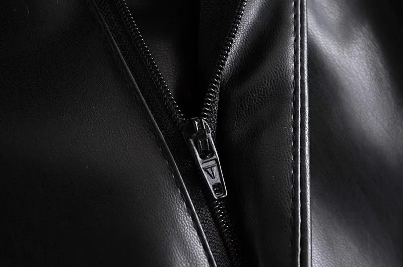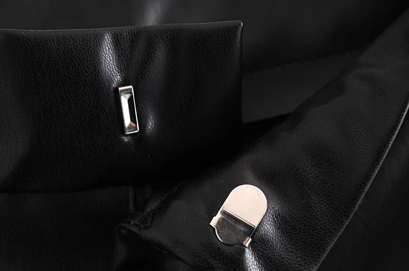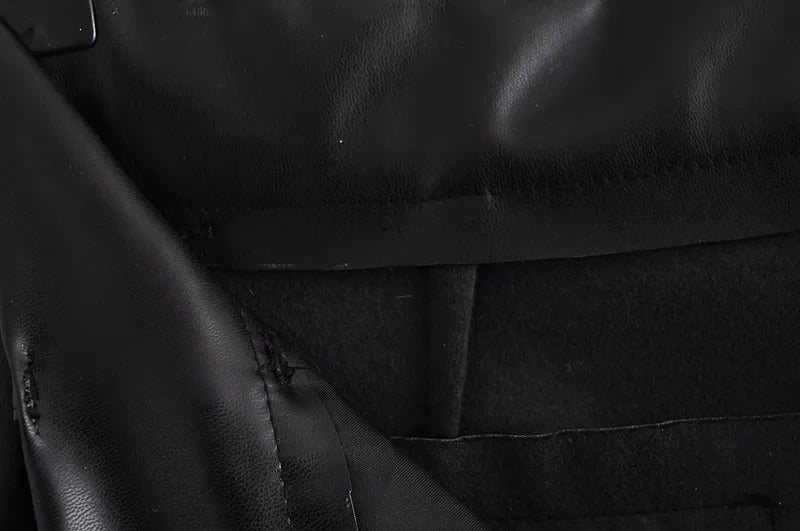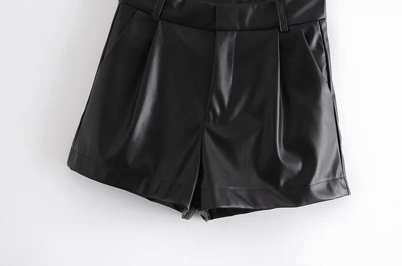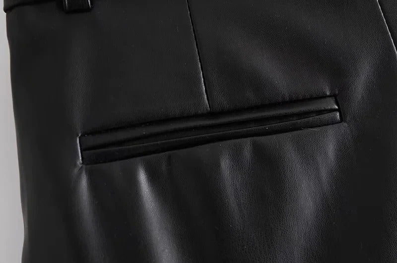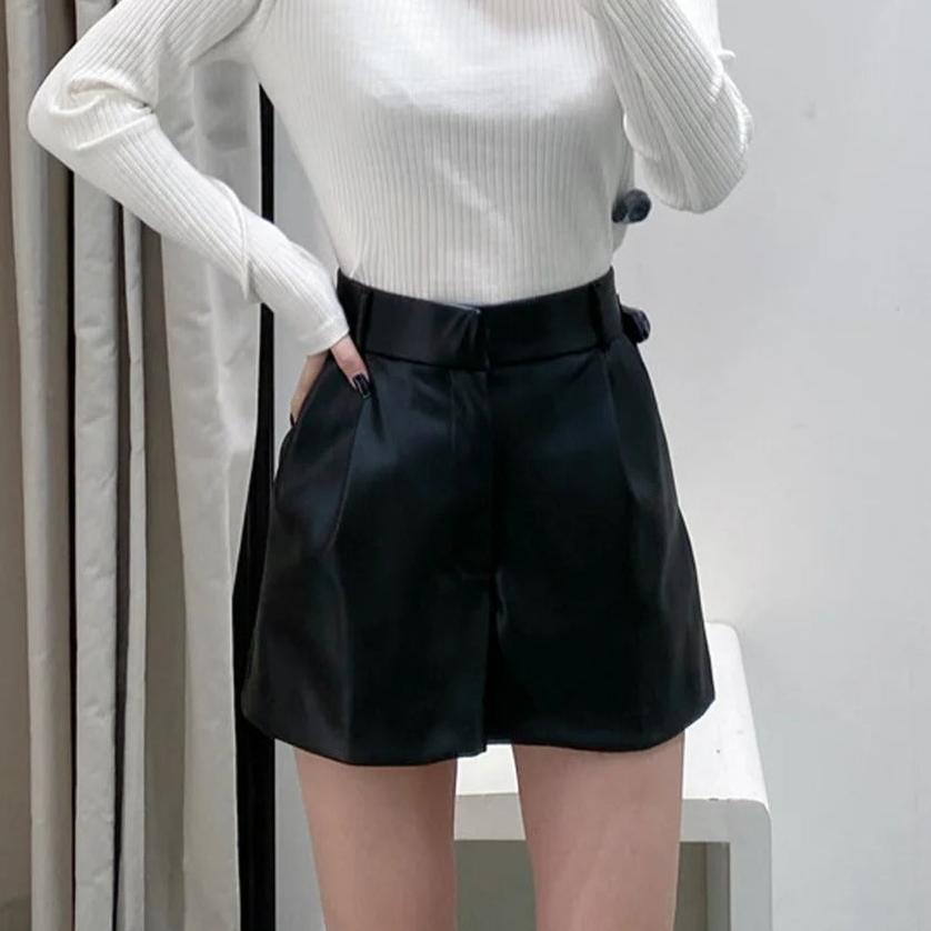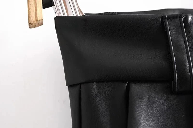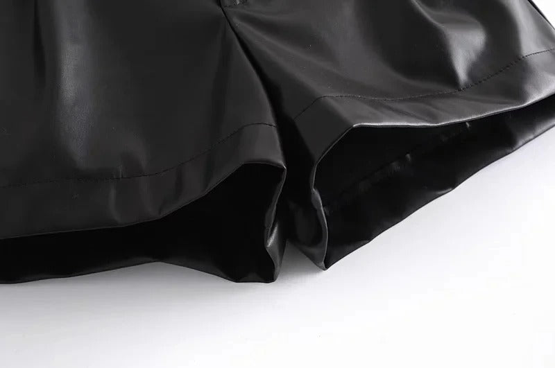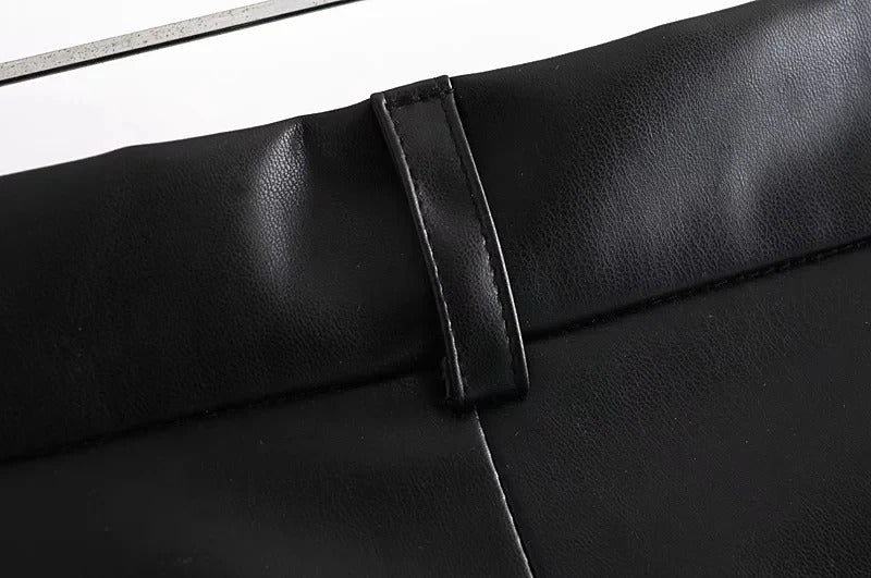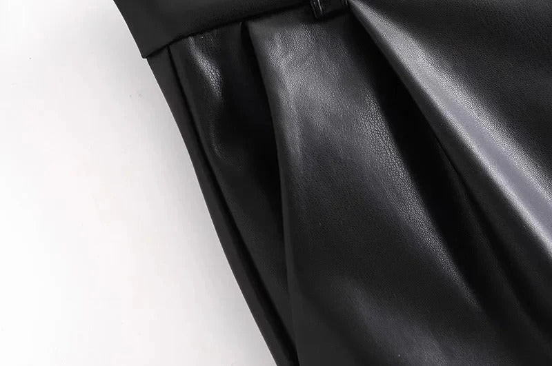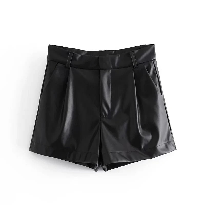 Diseño corto de talle alto. Acabado en piel sintética. Cierre frontal con cremallera. Bolsillos laterales y ajuste ancho.