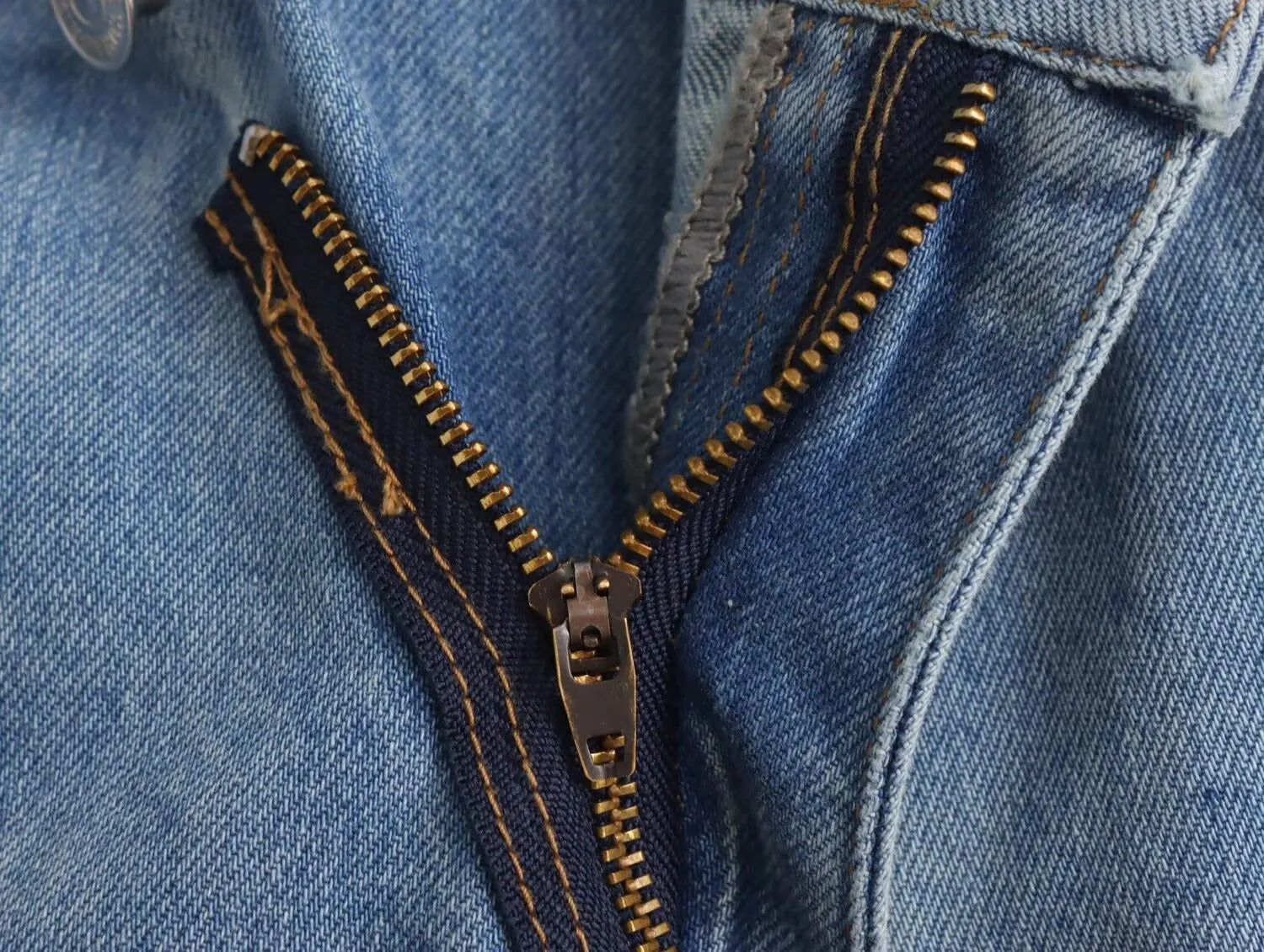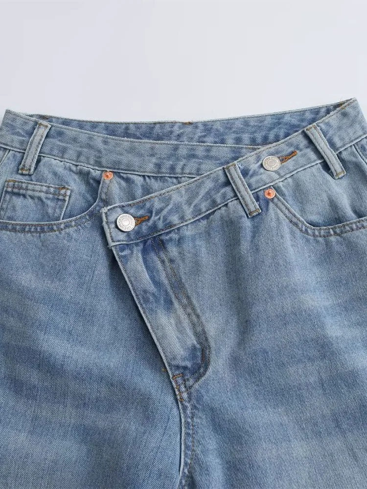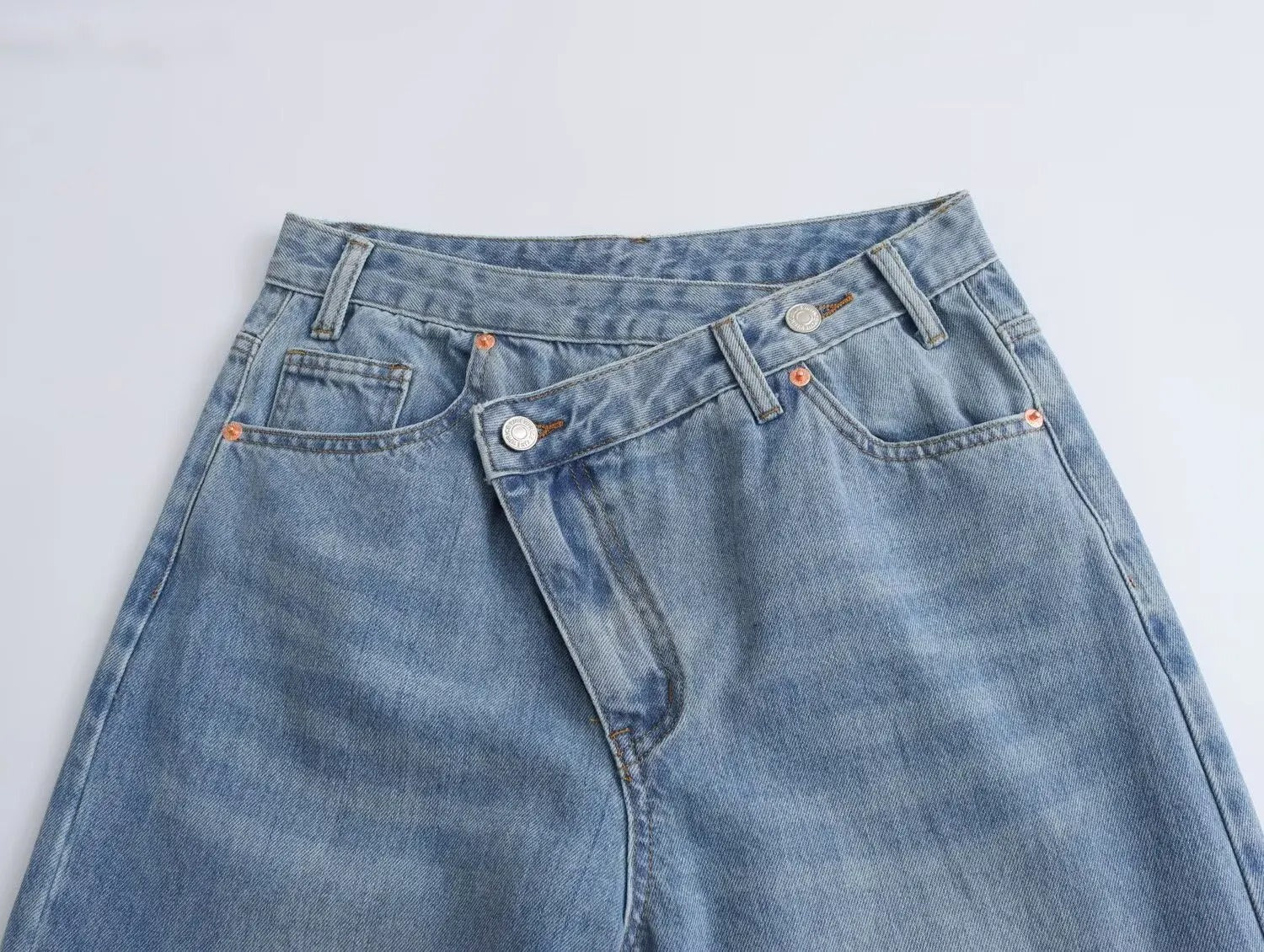 Diseño de pierna ancha, corte recto. Cierre frontal con botón y cremallera. Cintura asimétrica.