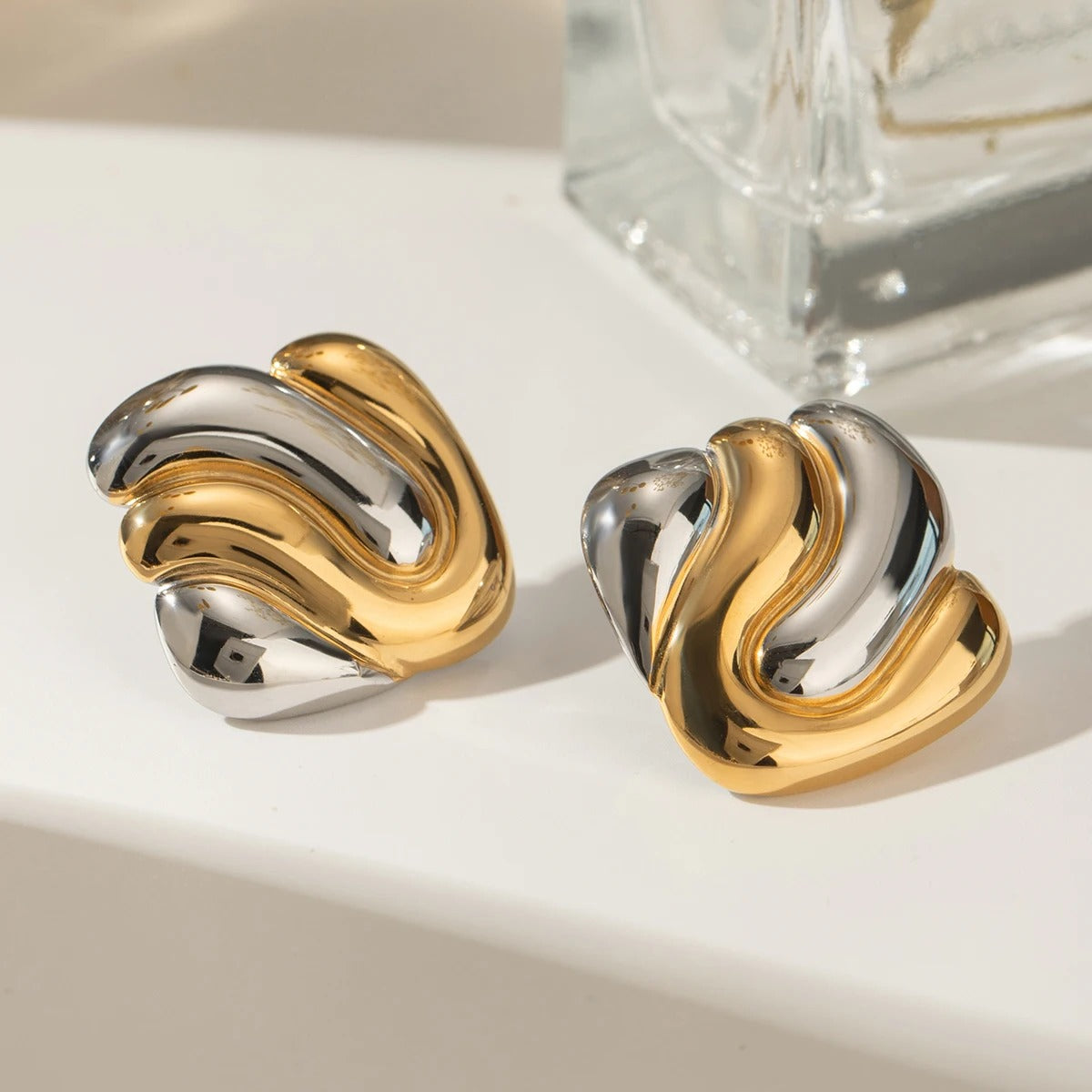 Pendientes cuadrados con diseño curvo en tono bicolor plateado y dorado.