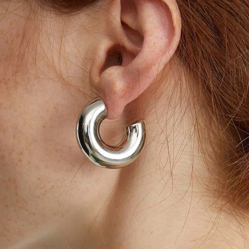 Pendientes en forma de C tipo aro grueso. Disponibles en dorado y plateado.