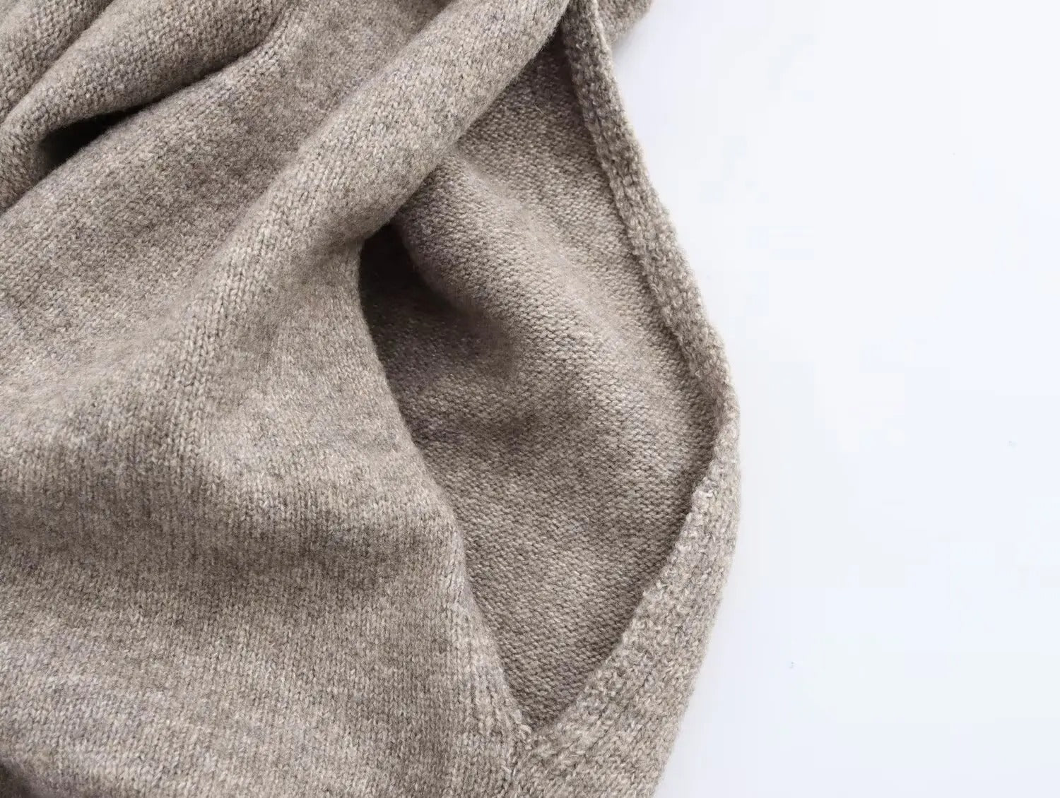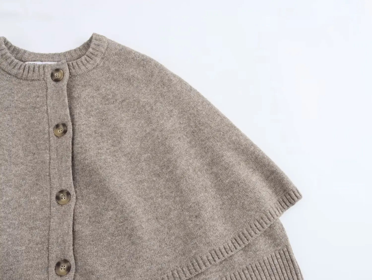 Cárdigan estilo poncho de punto, pudiendo ser usada como chaqueta o chal. Cuello redondo. Sin Manga. Detalle de cierre frontal con botones.