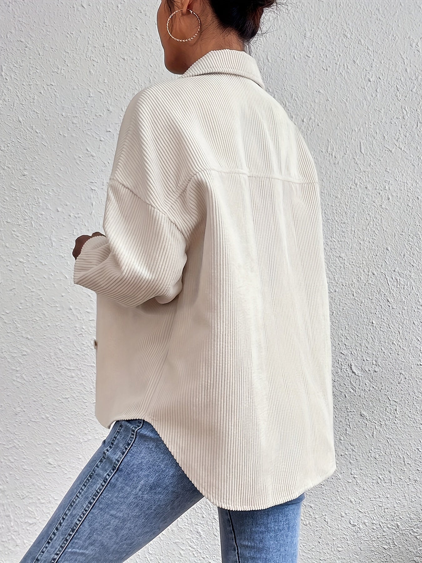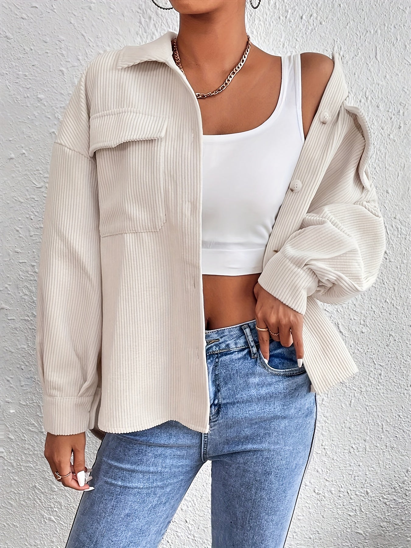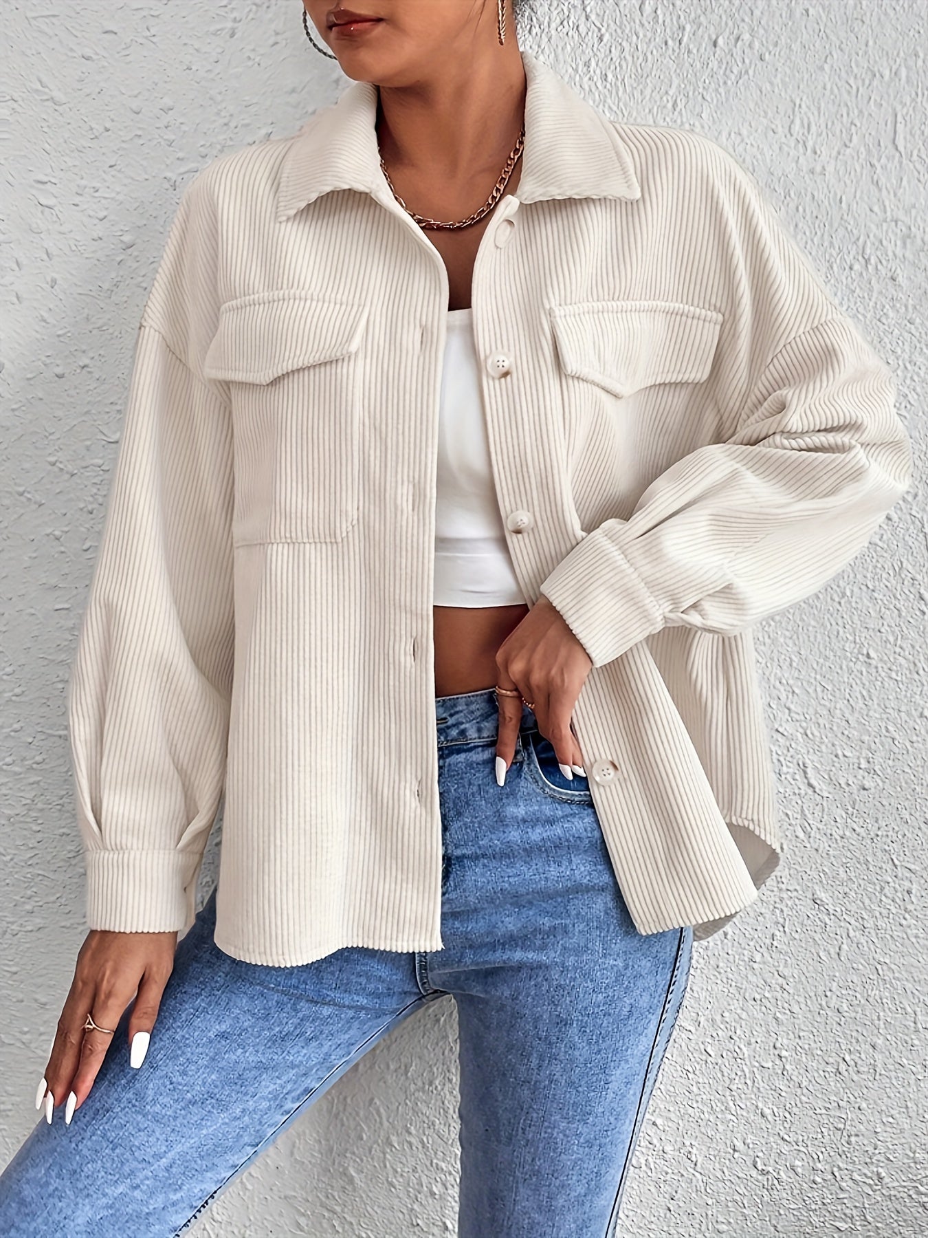 Diseño de largo medio. Cuello en solapa. Manga larga. Cierre frontal de botones. Bolsillos frontales con botón.