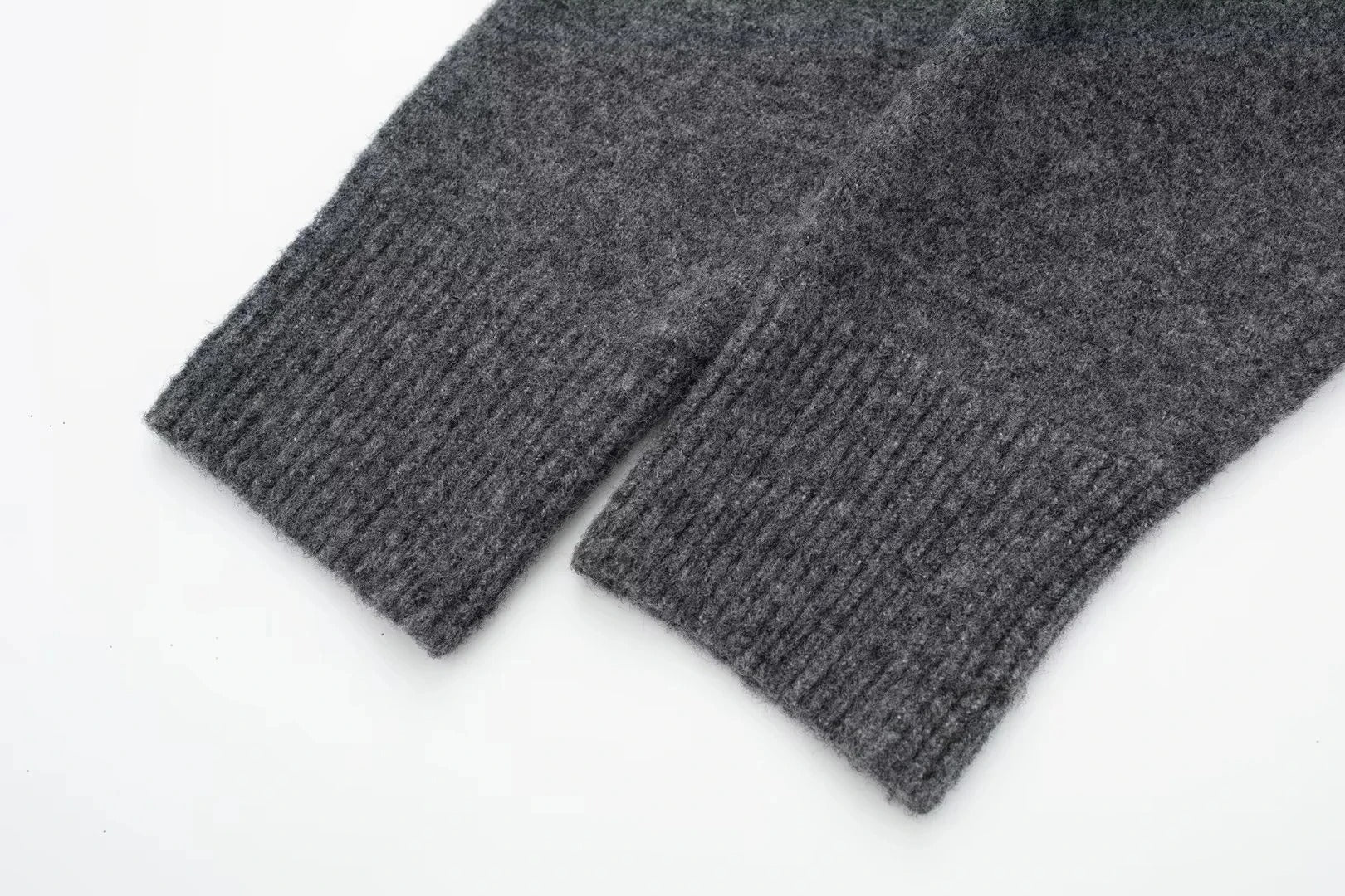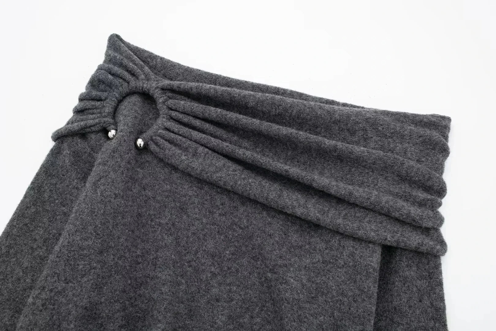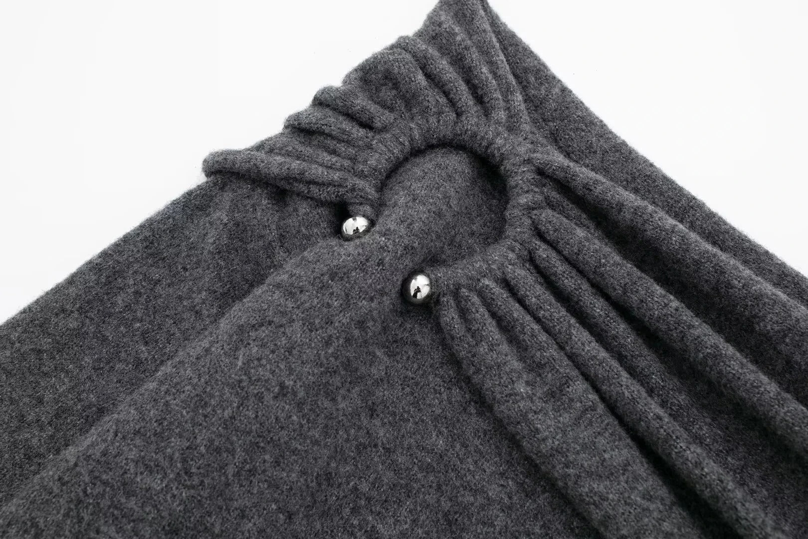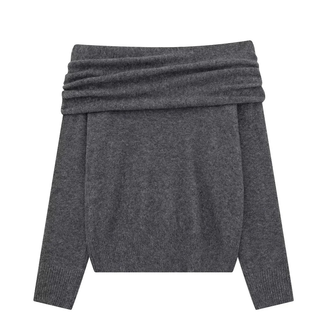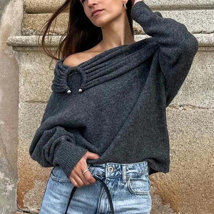 Suéter de hombros caídos con un diseño de drapeado en el escote, que se ajusta con una argolla decorativa en la parte delantera. Mangas largas con puños acanalados.
