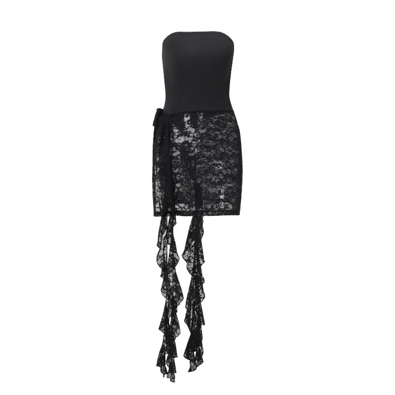 Diseño ajustado. Escote en palabra de honor. Sin mangas. Parte inferior de encaje con lazo extra largo lateral.