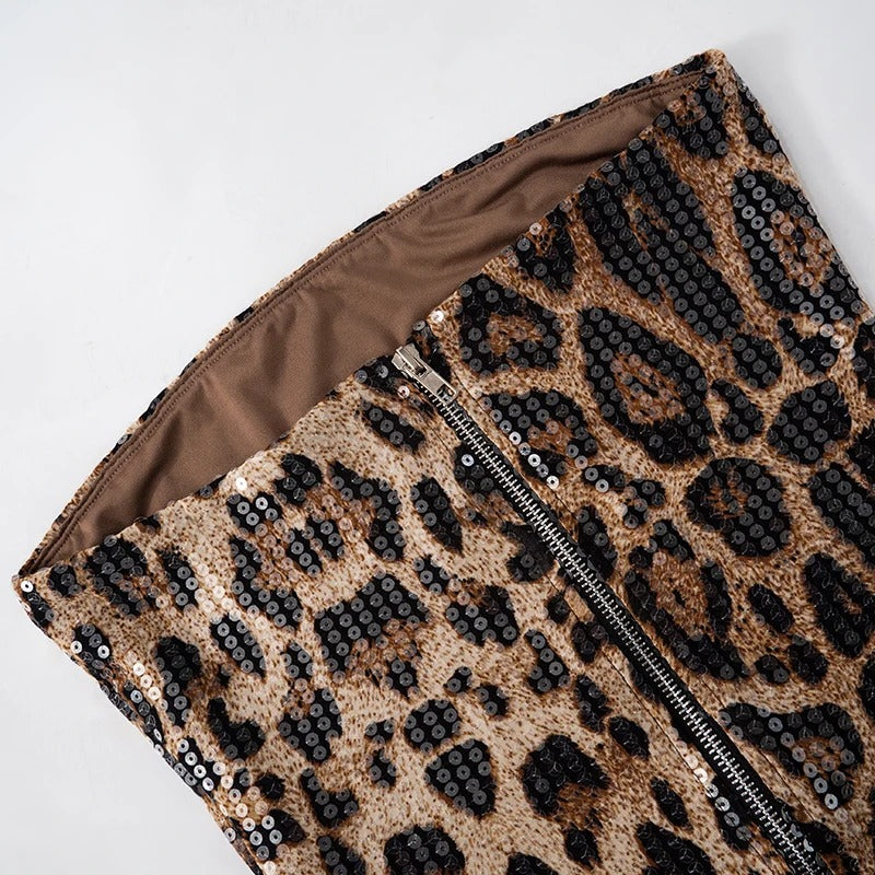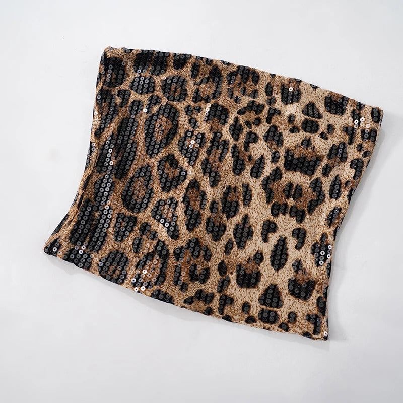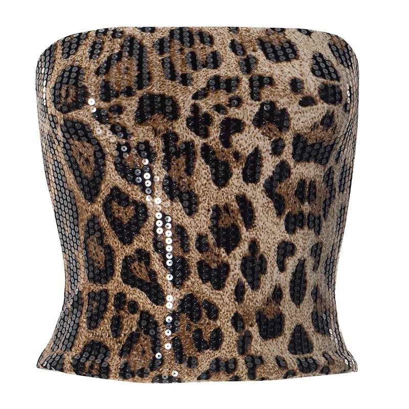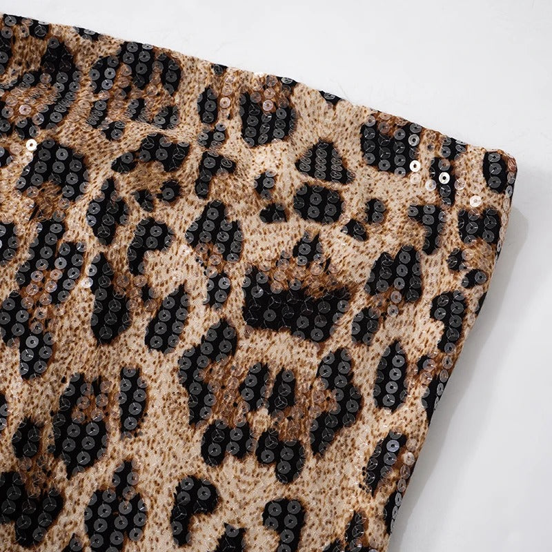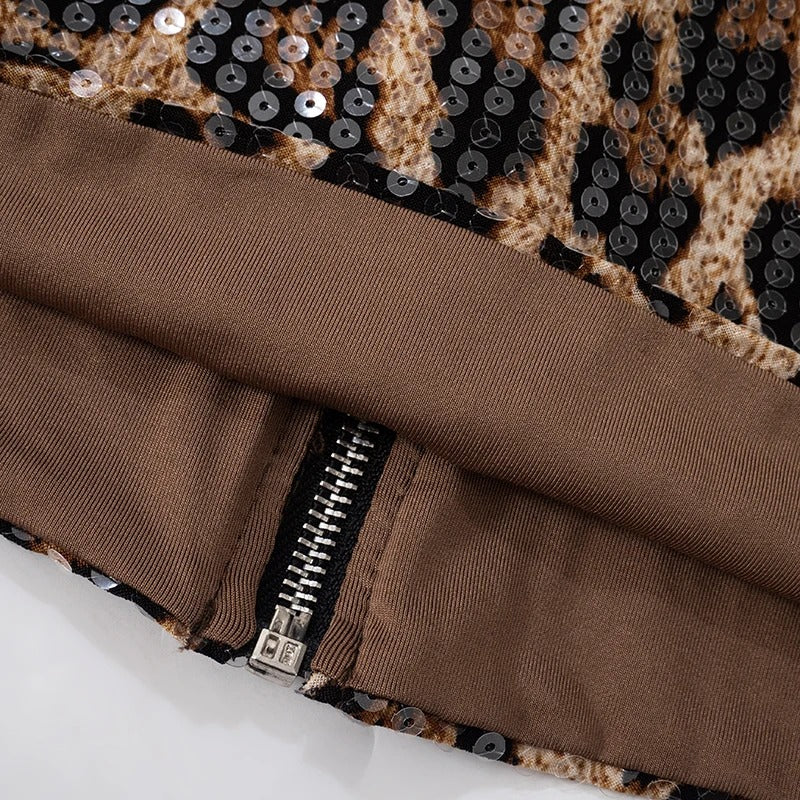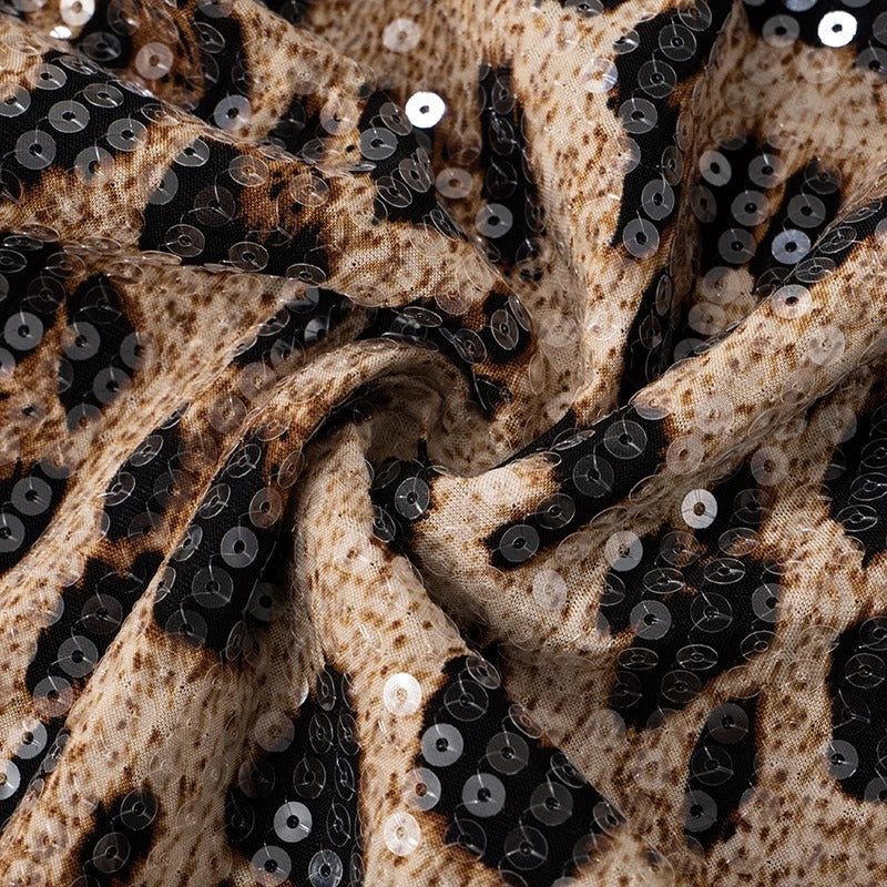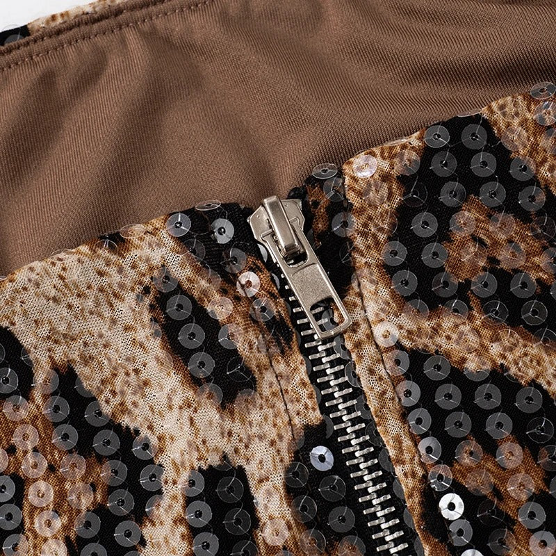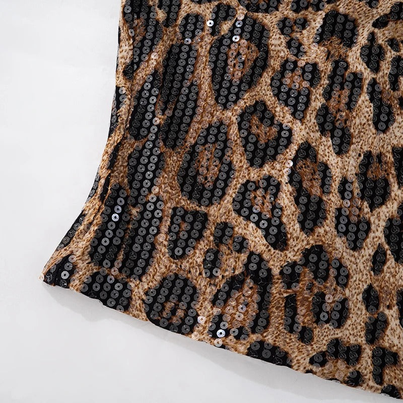 Top sin mangas con escote redondo. Tejido de lentejuelas con estampado de leopardo y forro interior. Cierre posterior con cremallera.