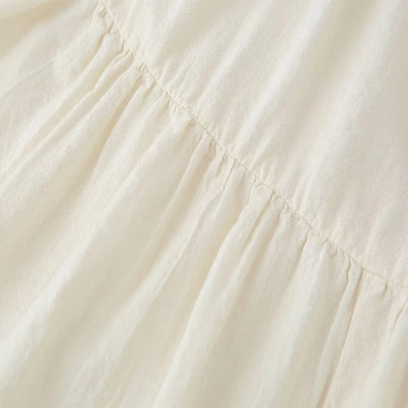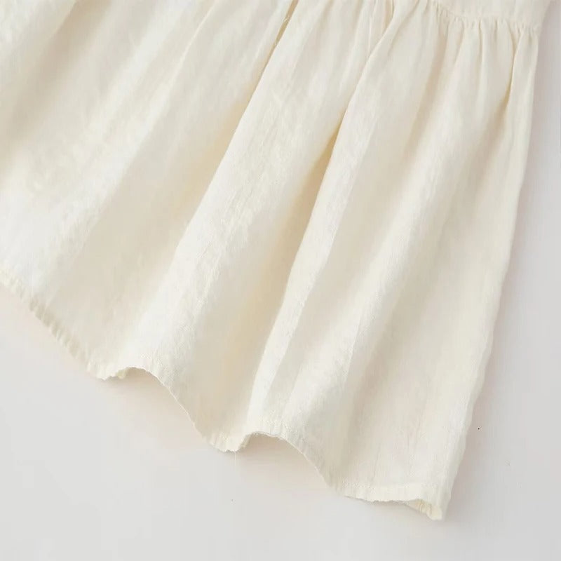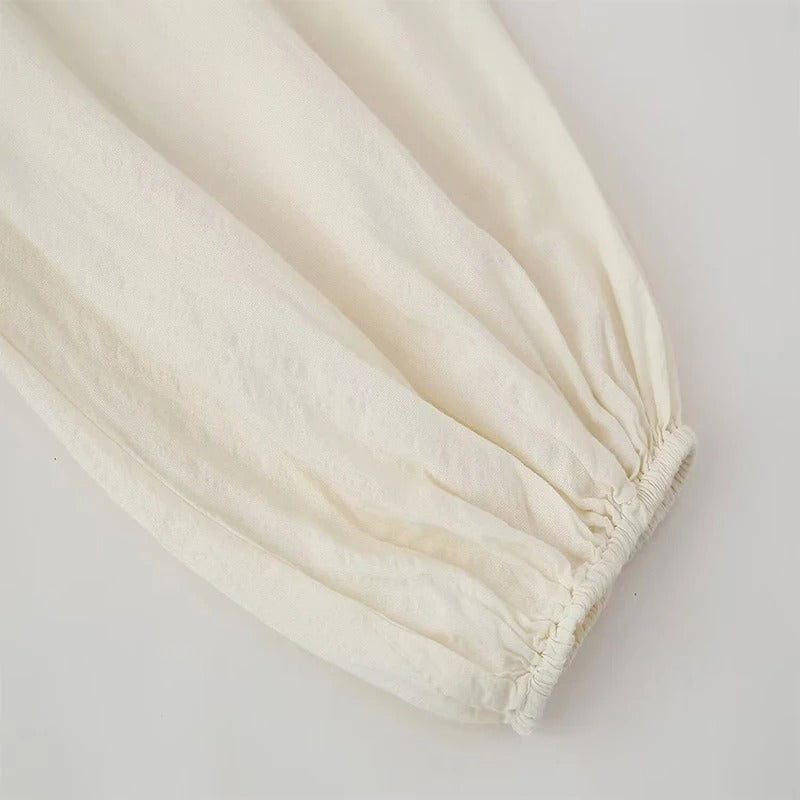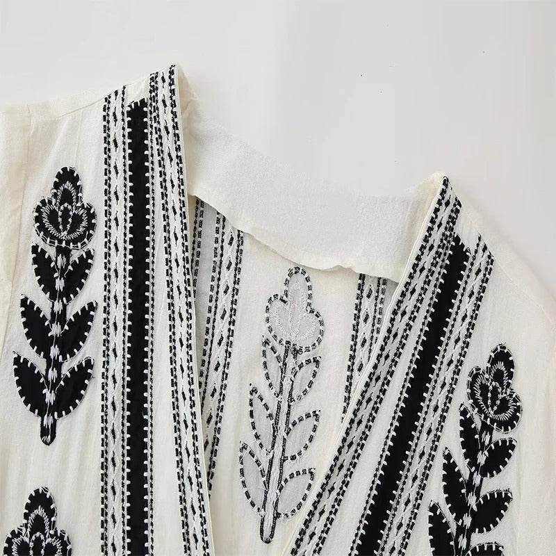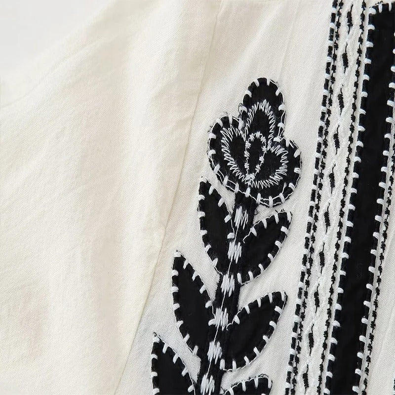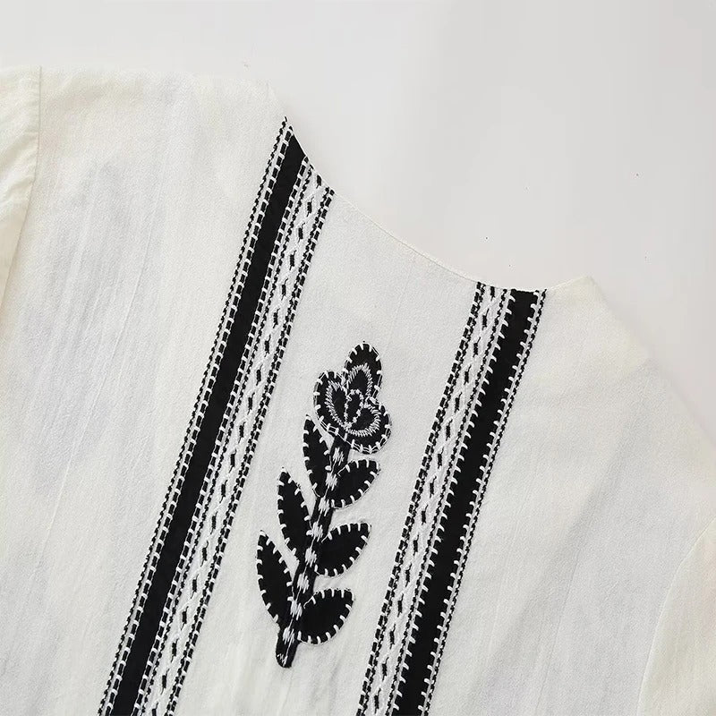 Vestido de manga larga abullonada con cuello en V y corte de vuelo. Decorado con bordados delicados en la parte frontal.