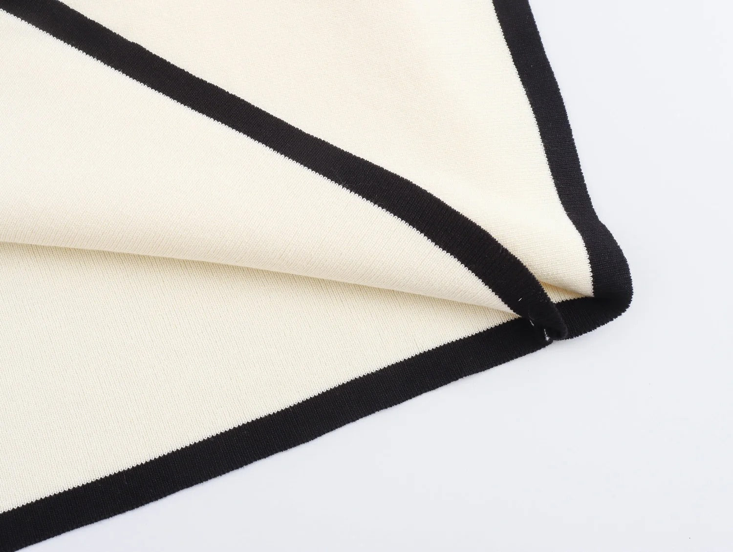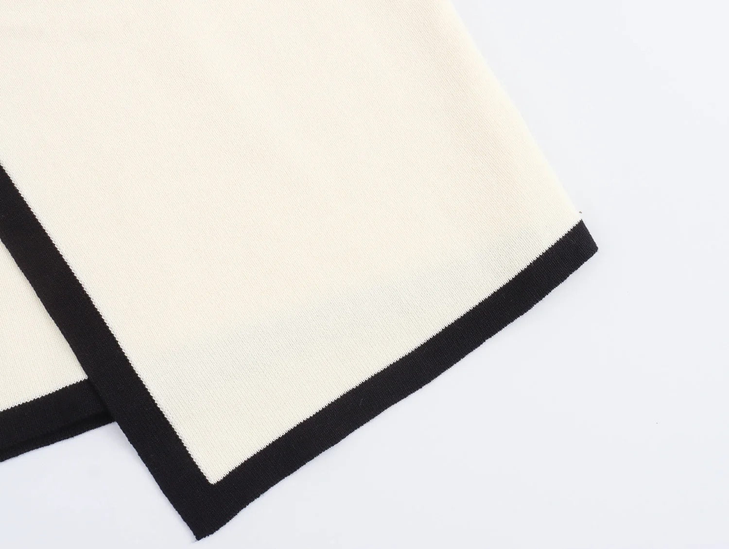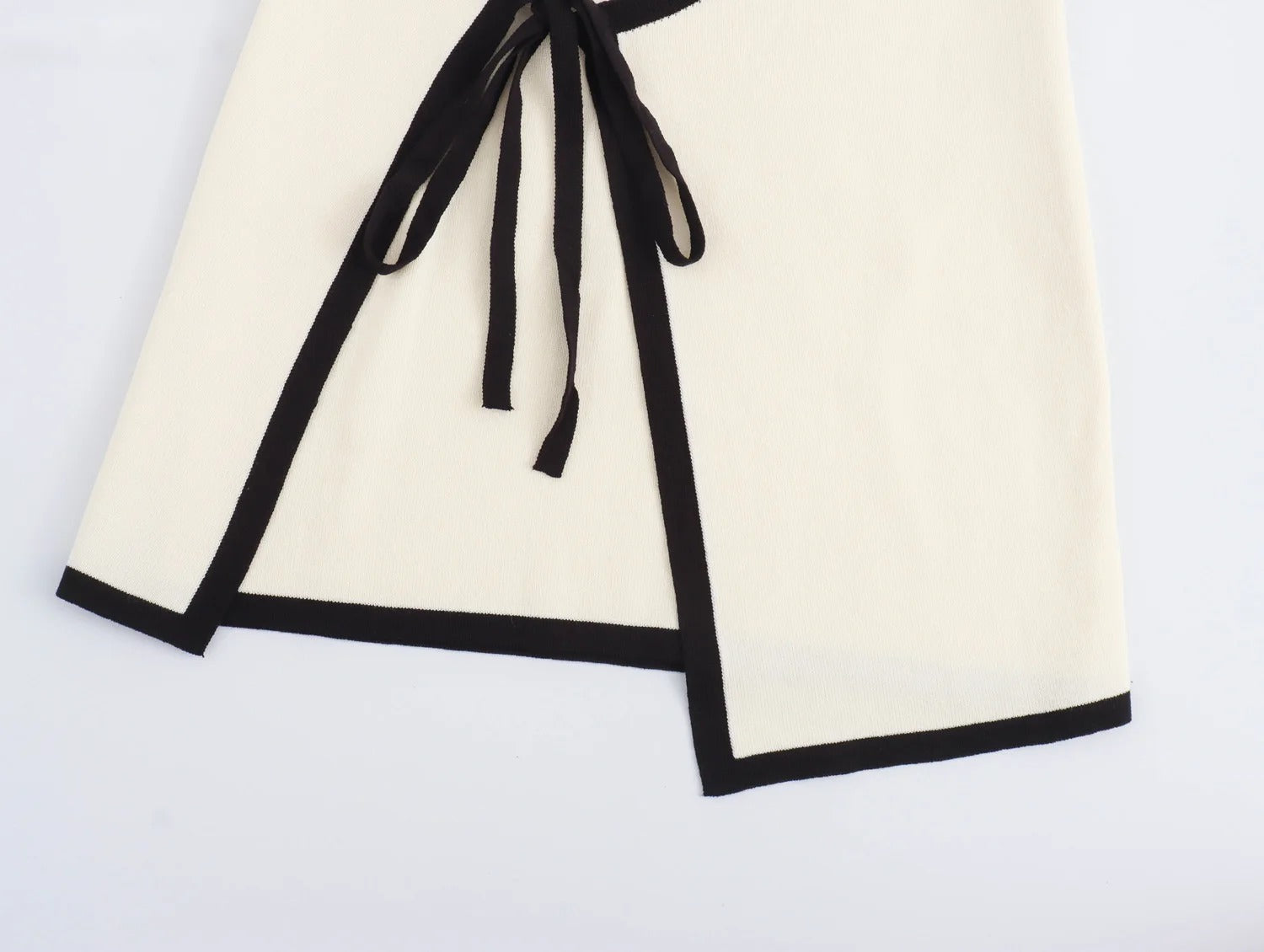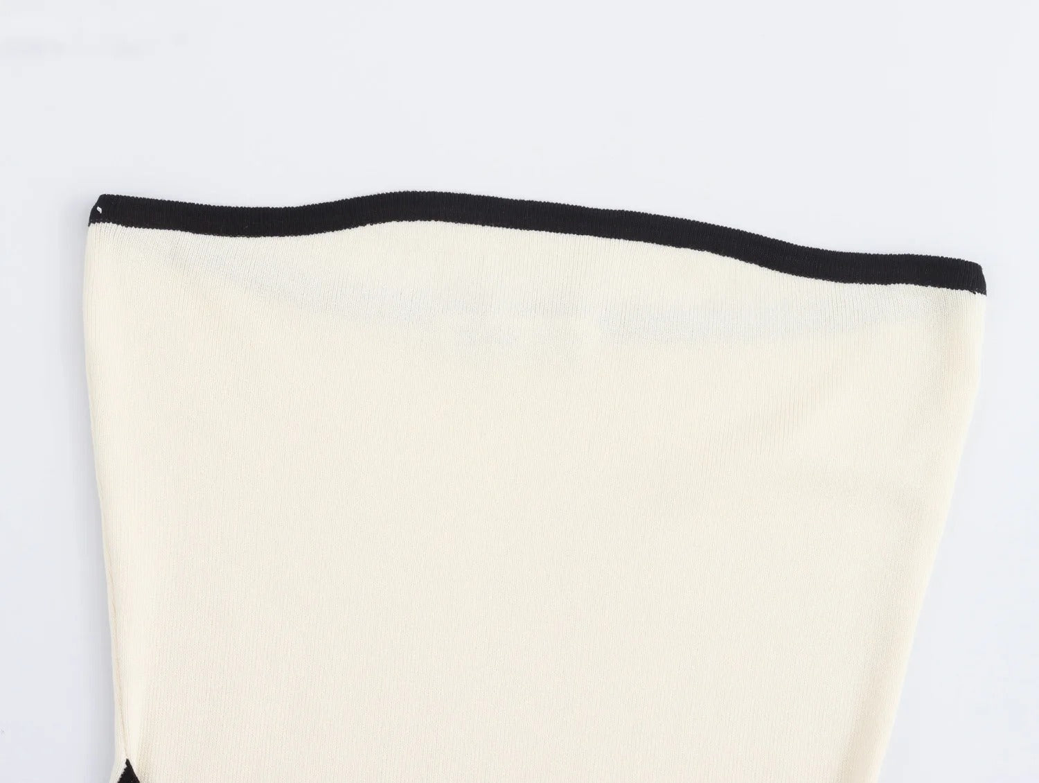 Vestido corto sin tirantes de corte recto. Detalle de borde en contraste en la parte superior e inferior. Ajuste a la cintura con lazo decorativo para definir la silueta.