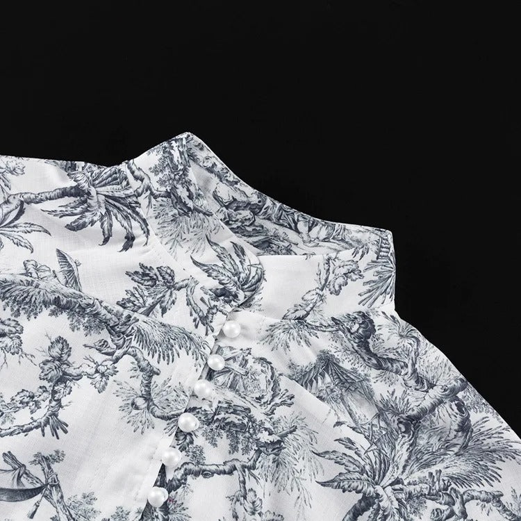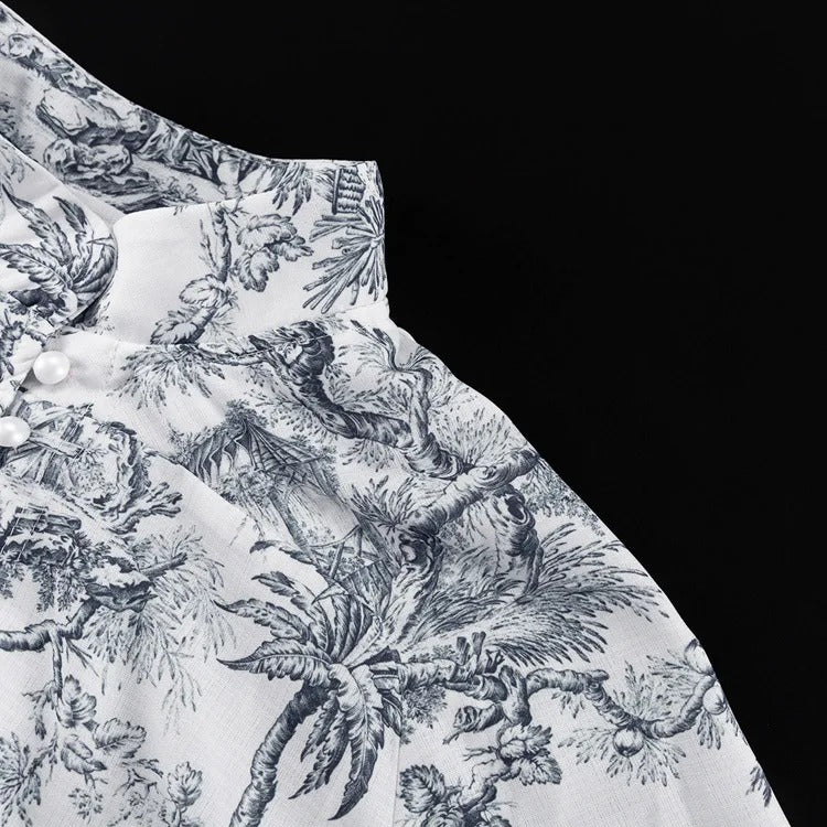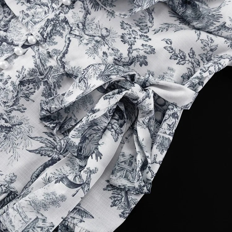 Manga larga abullonada con puños ajustados. Cintura ajustable con lazo. Estampado floral clásico. Cuello alto y estilo holgado con falda de vuelo.